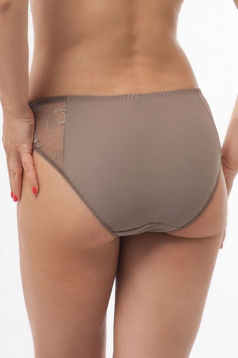 Передняя часть выполнена из полупрозрачной сетчатой ткани с вышивкой в виде растительного орнамента, что придает модели выразительность и легкость. Задняя часть из гладкой шелковистой микрофибры обеспечивает мягкое прилегание и комфорт в течение всего дня. Ластовица из хлопка делает ношение особенно приятным и гигиеничным.