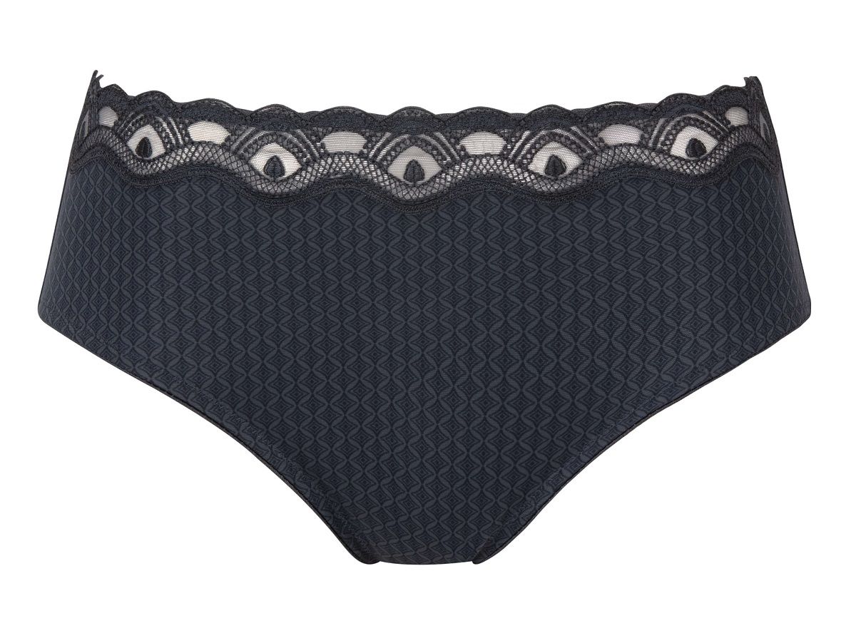 Высокая посадка делает модель особенно удобной для повседневной носки: трусы аккуратно прилегают к телу, не скатываются и не пережимают кожу. Передняя часть выполнена из ткани с жаккардовым геометрическим рисунком, который придаёт изделию выразительность. Задняя часть из шелковистой микрофибры обеспечивает гладкость под одеждой и приятные тактильные ощущения.