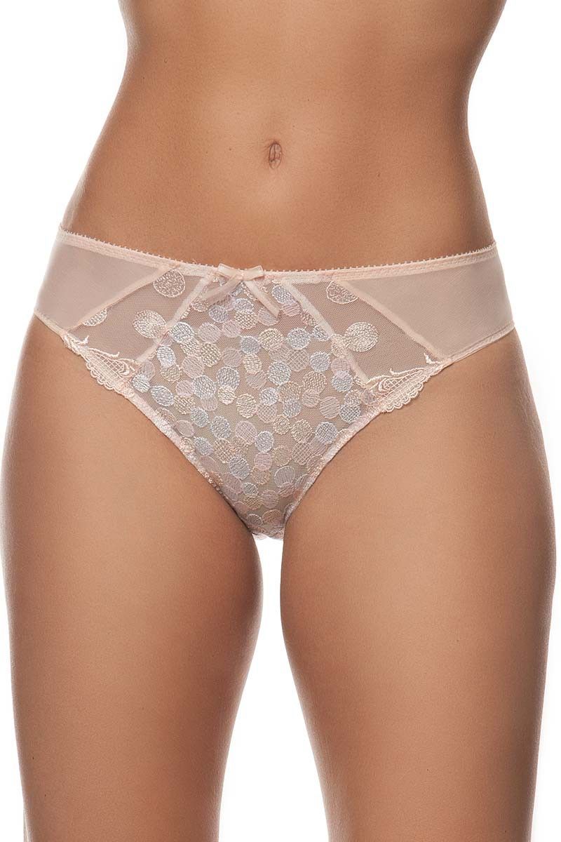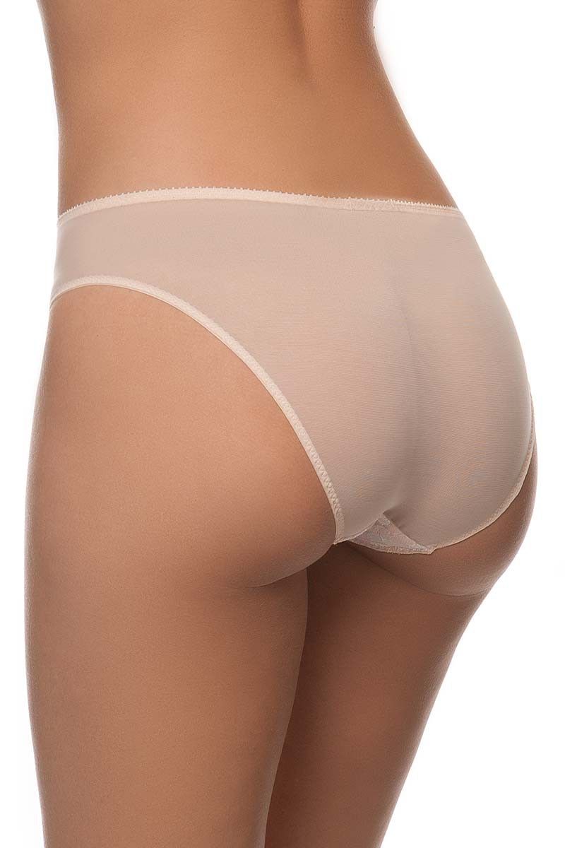 Передняя часть украшена вышитой вставкой на полупрозрачной сетке, которая придает модели утонченность и женственность. Аккуратная тесьма с фестончатым краем подчеркивает линию талии, а небольшой декоративный бант добавляет деликатный акцент. Задняя часть выполнена из гладкой эластичной ткани, обеспечивающей аккуратную посадку и комфорт.