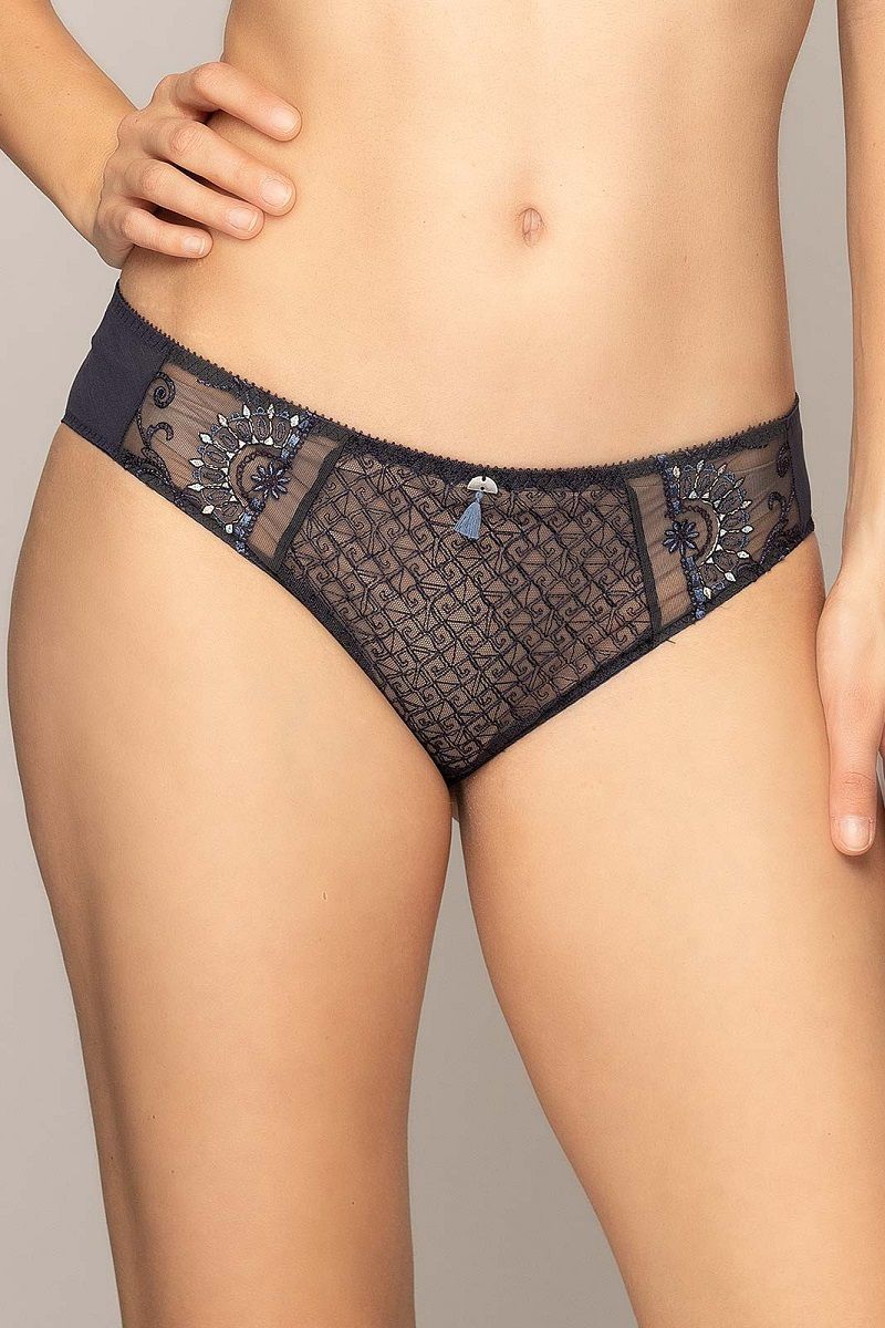 Передняя часть выполнена из полупрозрачной сетчатой ткани с геометрическим узором, дополненной вышивкой с растительным мотивом. Аккуратная тесьма с фестонами по краю и декоративная кисточка по центру пояса придают модели женственный и завершённый вид. Задняя часть из мягкой сетки деликатно облегает фигуру, не создавая лишнего объёма под одеждой.