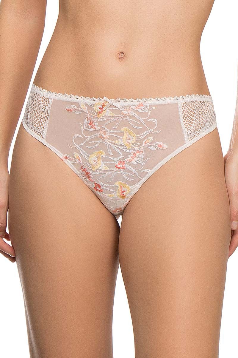 Модель выполнена в размере 42 и аккуратно повторяет линии тела. Передняя часть оформлена прозрачной сеткой с изящной вышивкой, боковые зоны дополнены кружевными вставками с сетчатым узором. Узкая задняя часть обеспечивает минимальную заметность под одеждой, что особенно важно при облегающих нарядах.