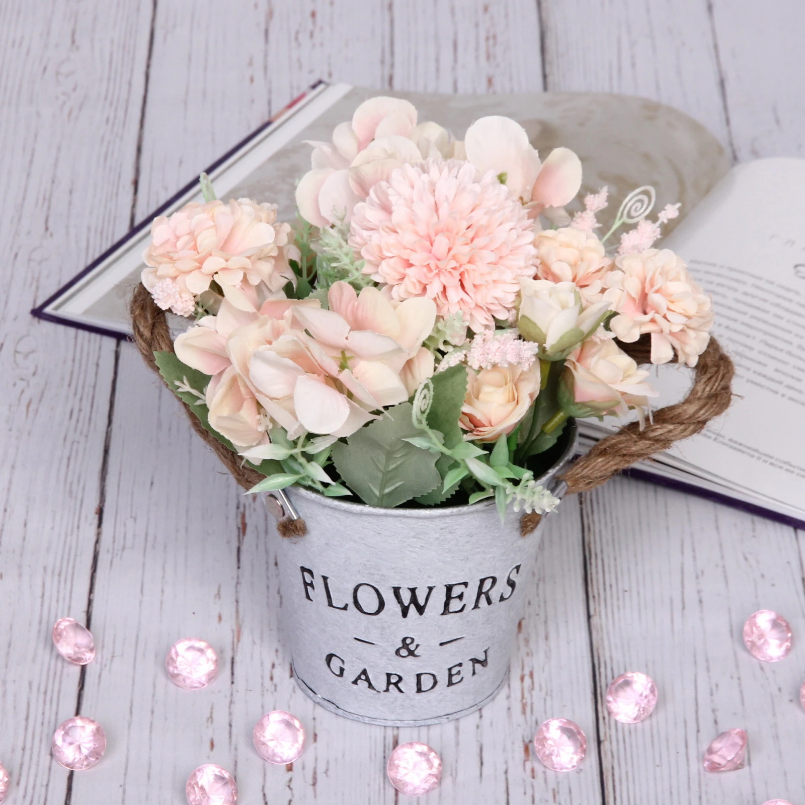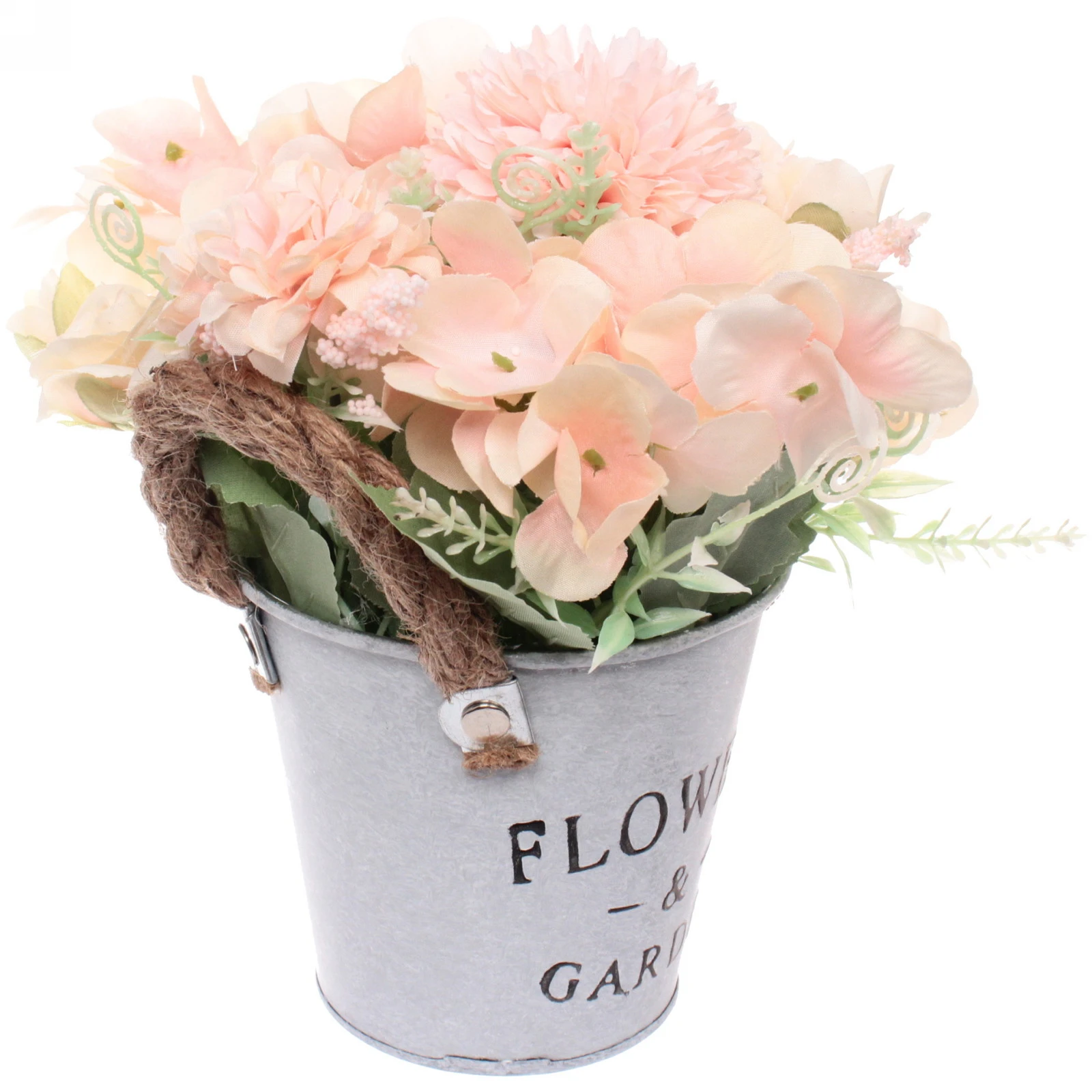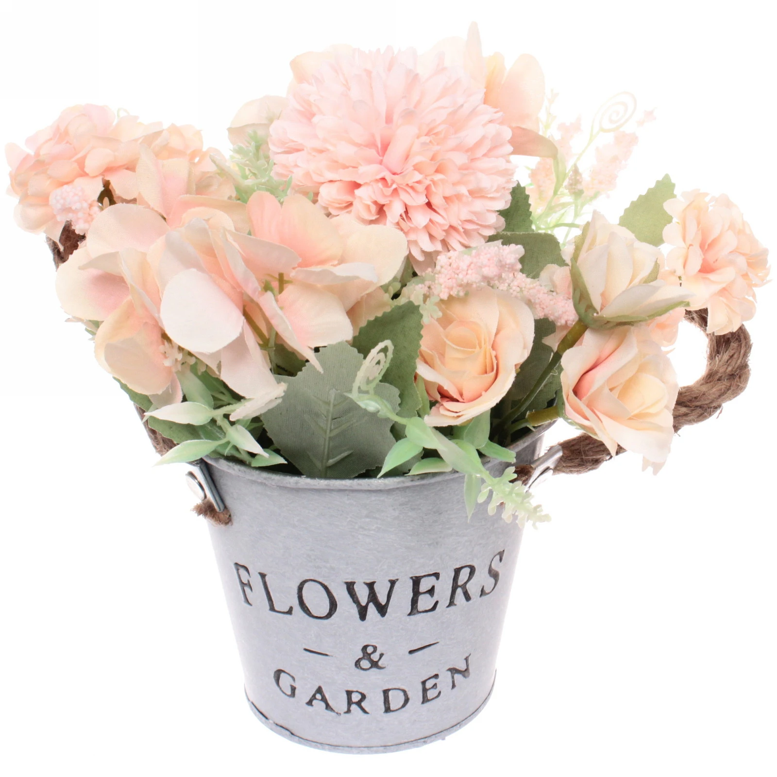 Цветы размещены в стильном металлическом кашпо цилиндрической формы светло-серого матового цвета. На его фронтальной части нанесена элегантная надпись «FLOWERS & GARDEN». Практичная и декоративная ручка из толстого коричневого джутового шнура добавляет композиции шарма и удобства для переноски.