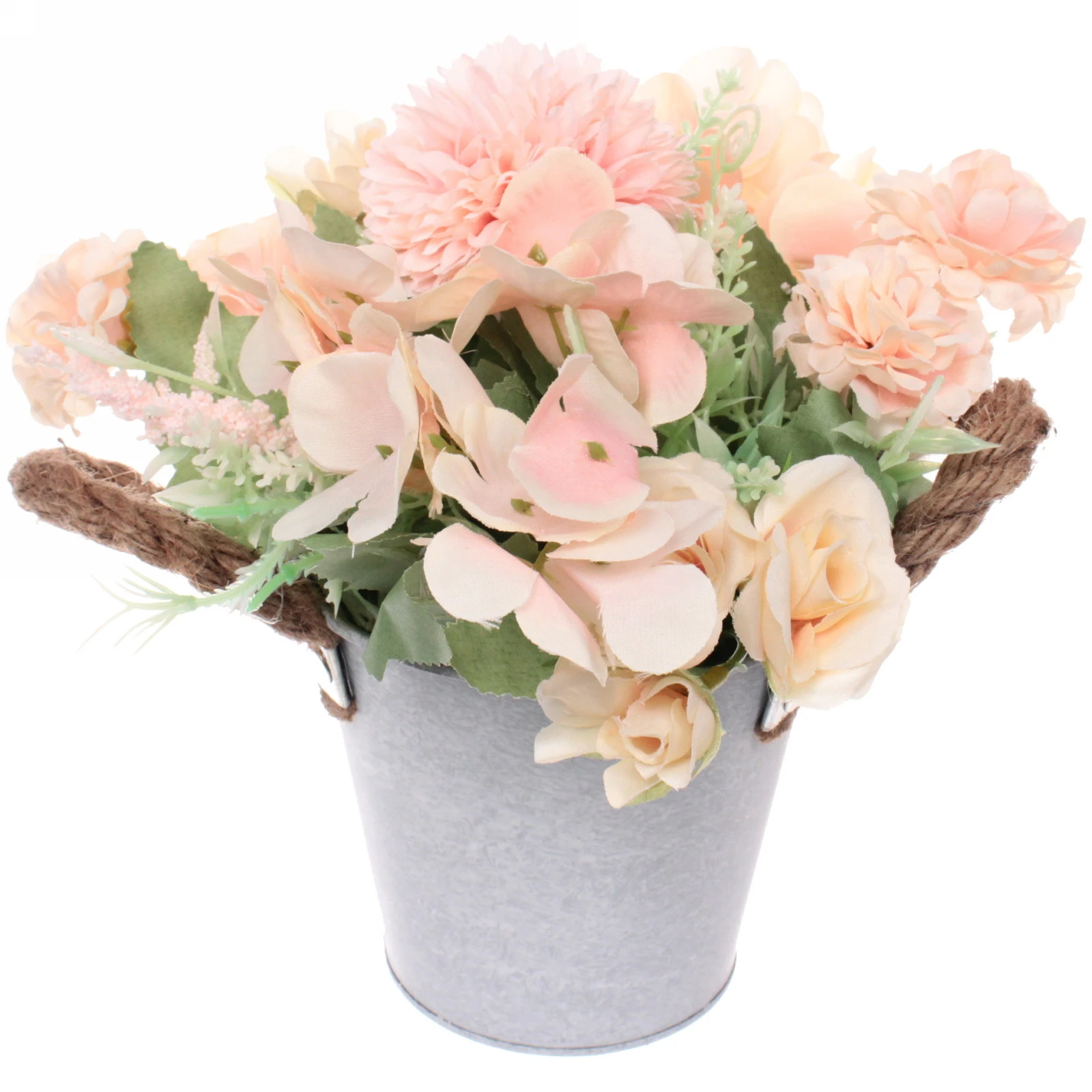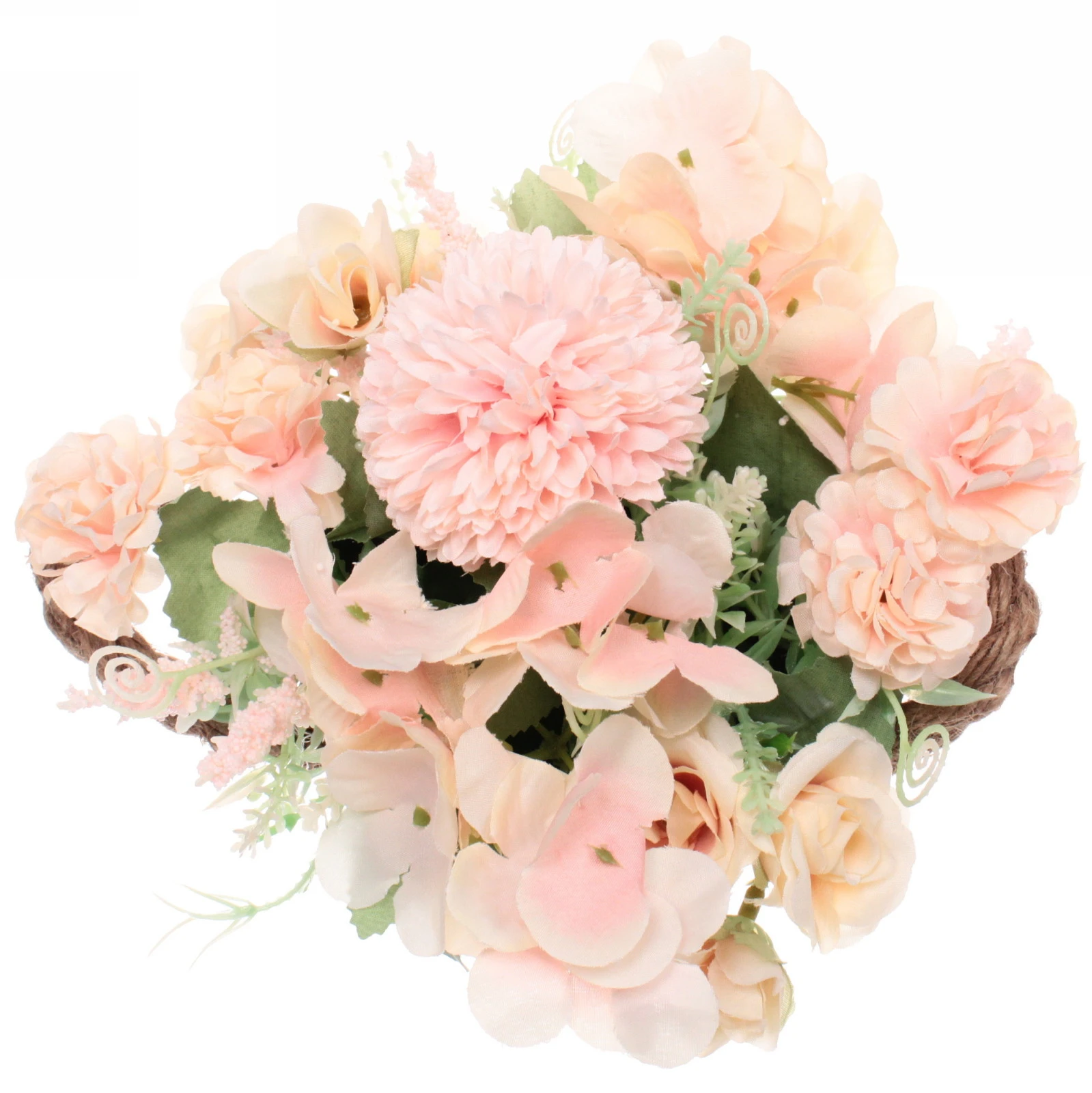 Композиция собрана вручную из качественных искусственных материалов. Пастельная гамма нежно-розовых, персиковых и кремовых оттенков цветов гармонично сочетается с зеленью листвы разных форм и размеров. Такое сочетание выглядит натурально и нежно.