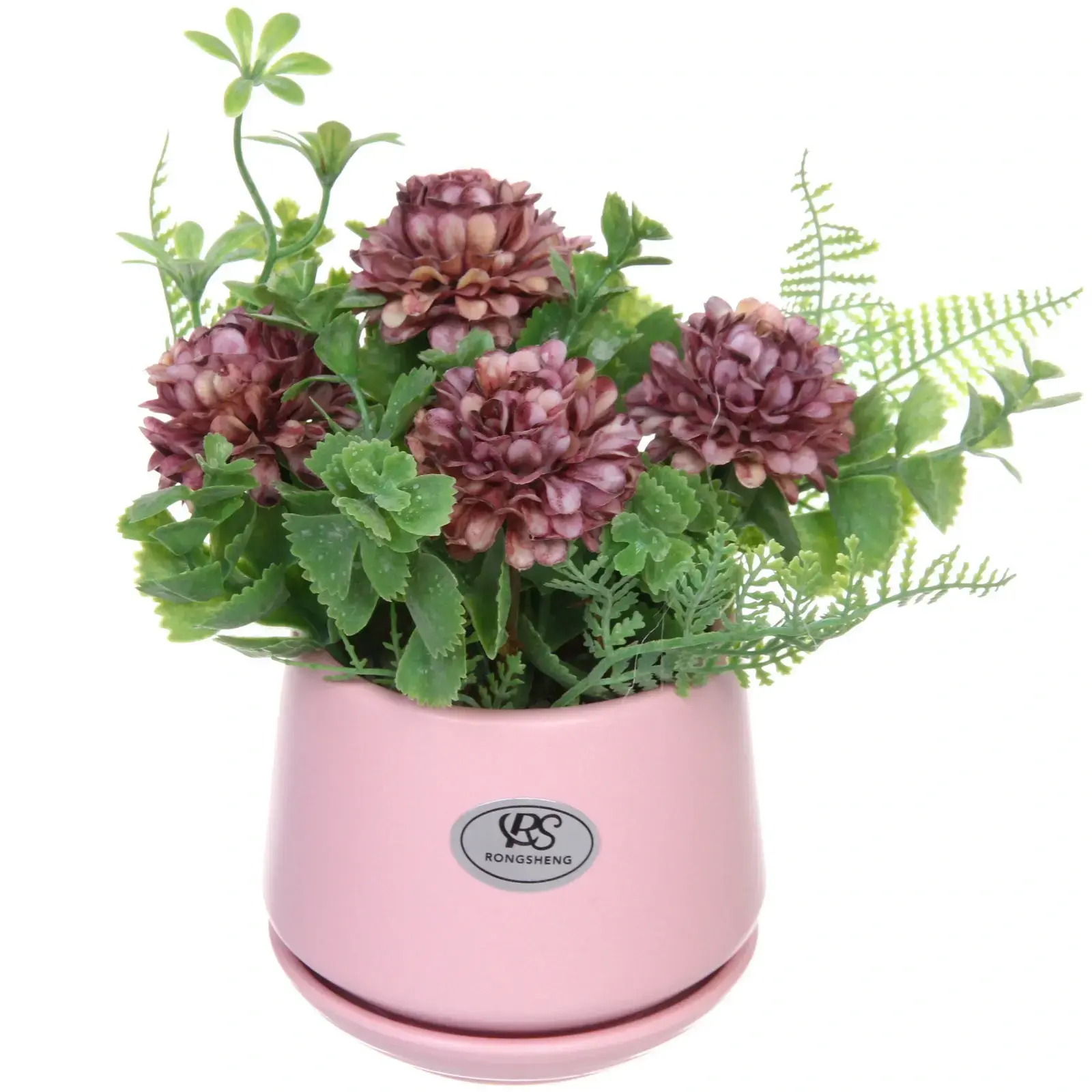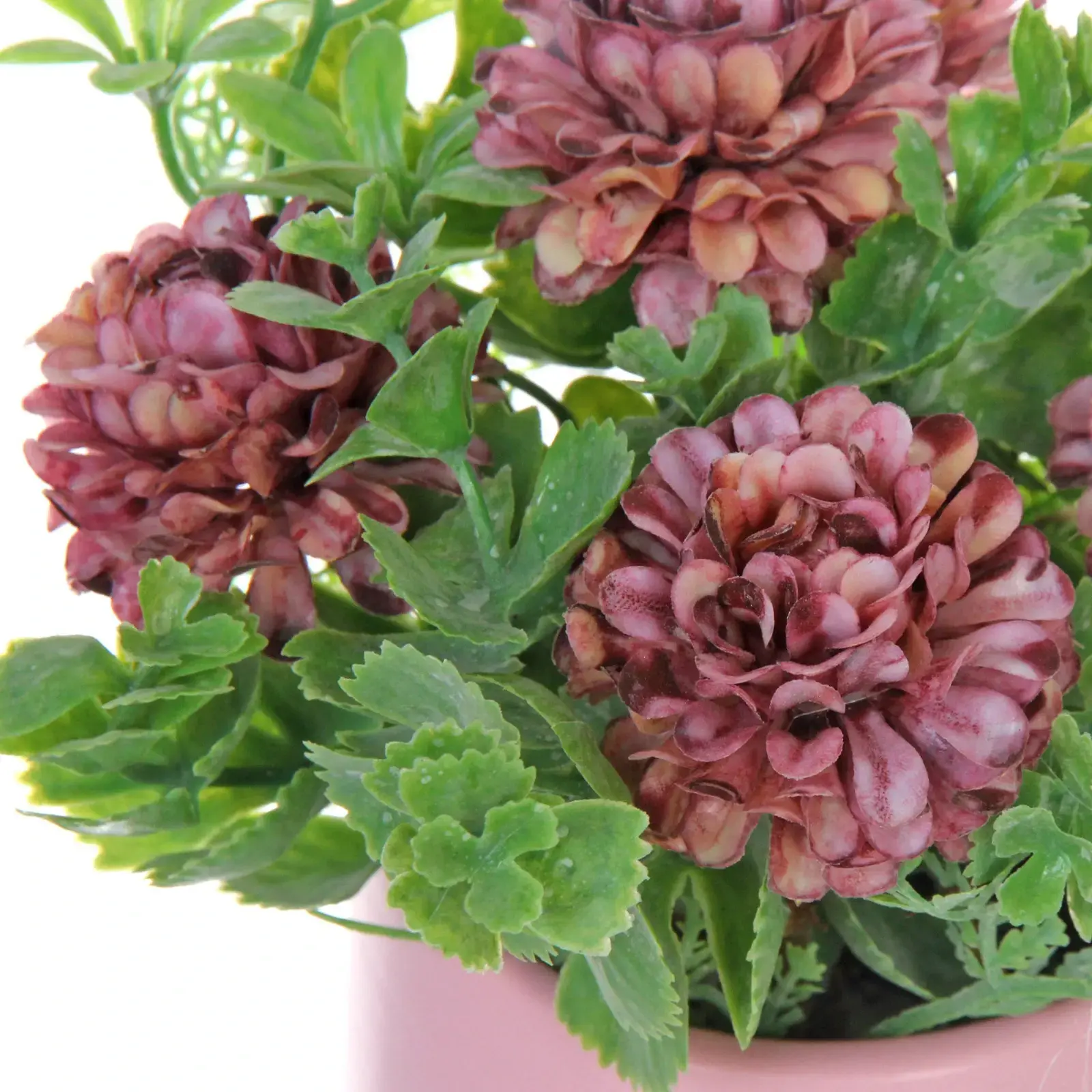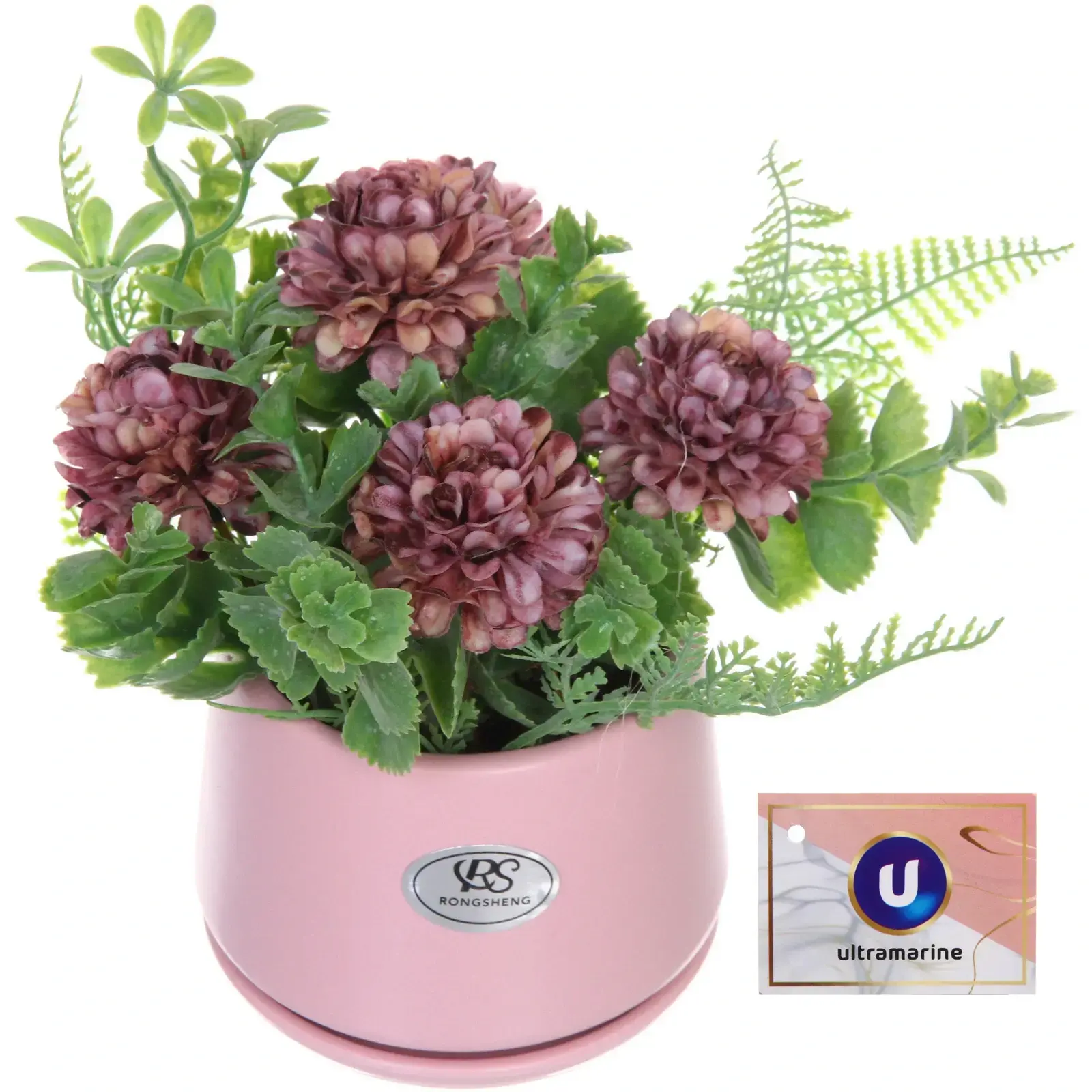 Композиция выполнена из качественных материалов: керамика, пластик и полиэстер. Это обеспечивает долговечность и устойчивость к внешним воздействиям. Цветы имеют многослойные лепестки, создающие объемный вид, а листья разнообразной формы добавляют естественности. Вы можете использовать эту композицию как самостоятельный элемент декора или в сочетании с другими предметами интерьера.