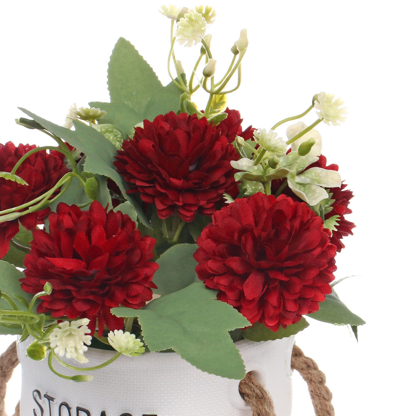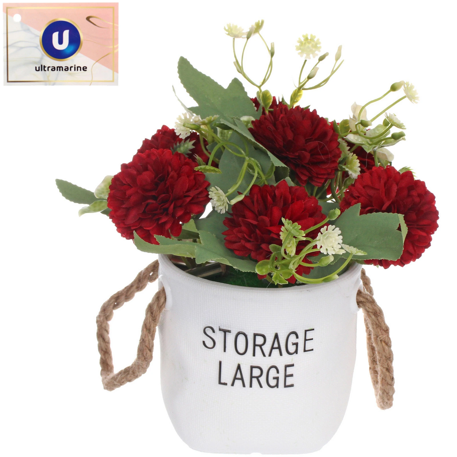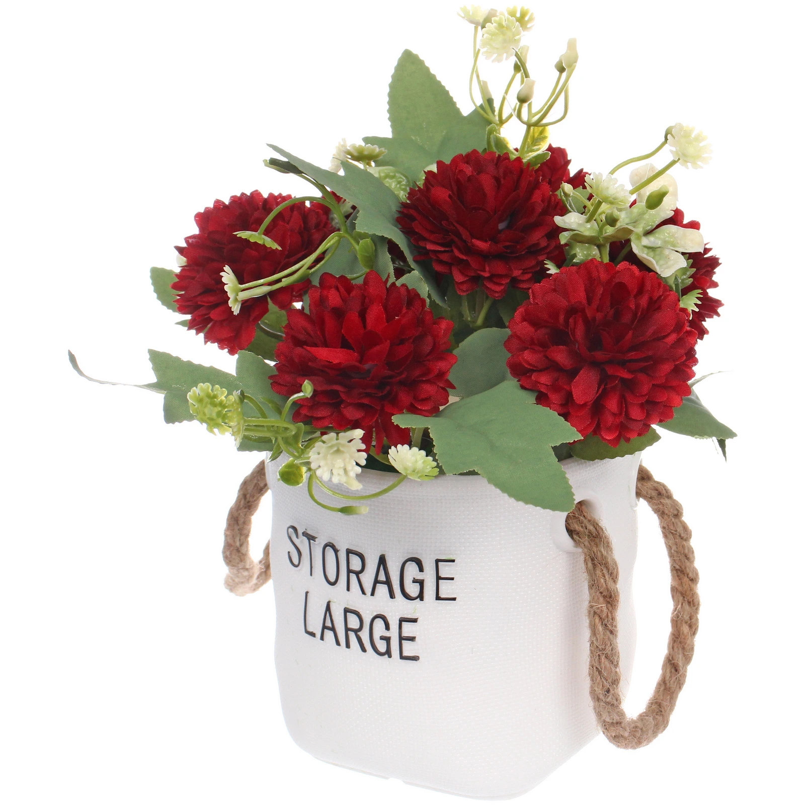 Композиция собрана в стильном белом кашпо с надписью "STORAGE LARGE" и удобными ручками из натурального шнура. Основу букета составляют роскошные бордовые хризантемы с плотными, бархатистыми соцветиями. Их дополняют нежные светлые соцветия и зелёные листья с детализированной фактурой, что делает аранжировку объёмной и естественной. Все элементы выполнены из качественных материалов (пластик, полиэстер), которые точно имитируют текстуру живых растений.