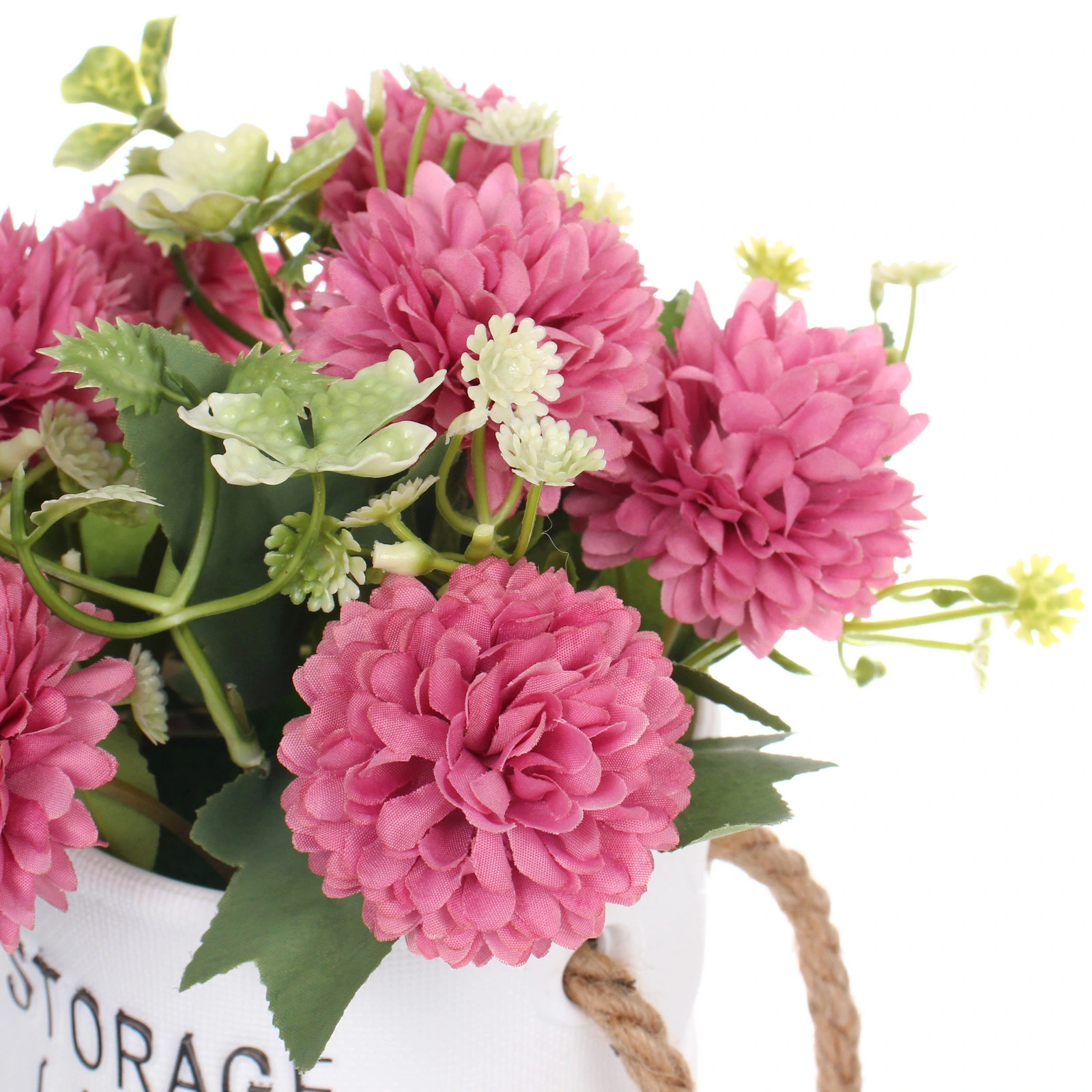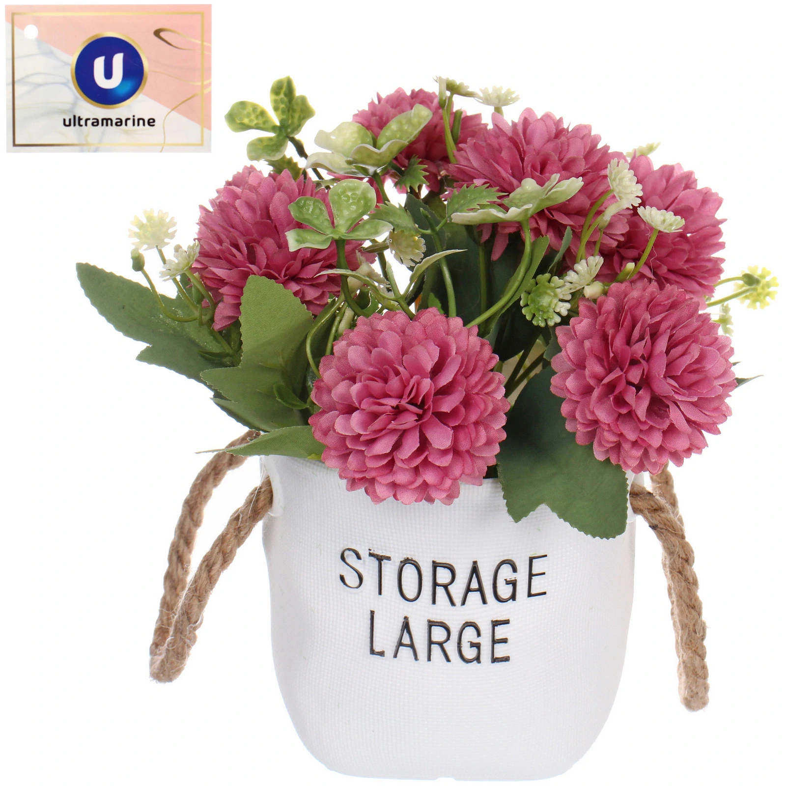 - Цветы: Крупные, махровые соцветия розово-малинового цвета, имитирующие хризантемы, выполнены из полиэстера.