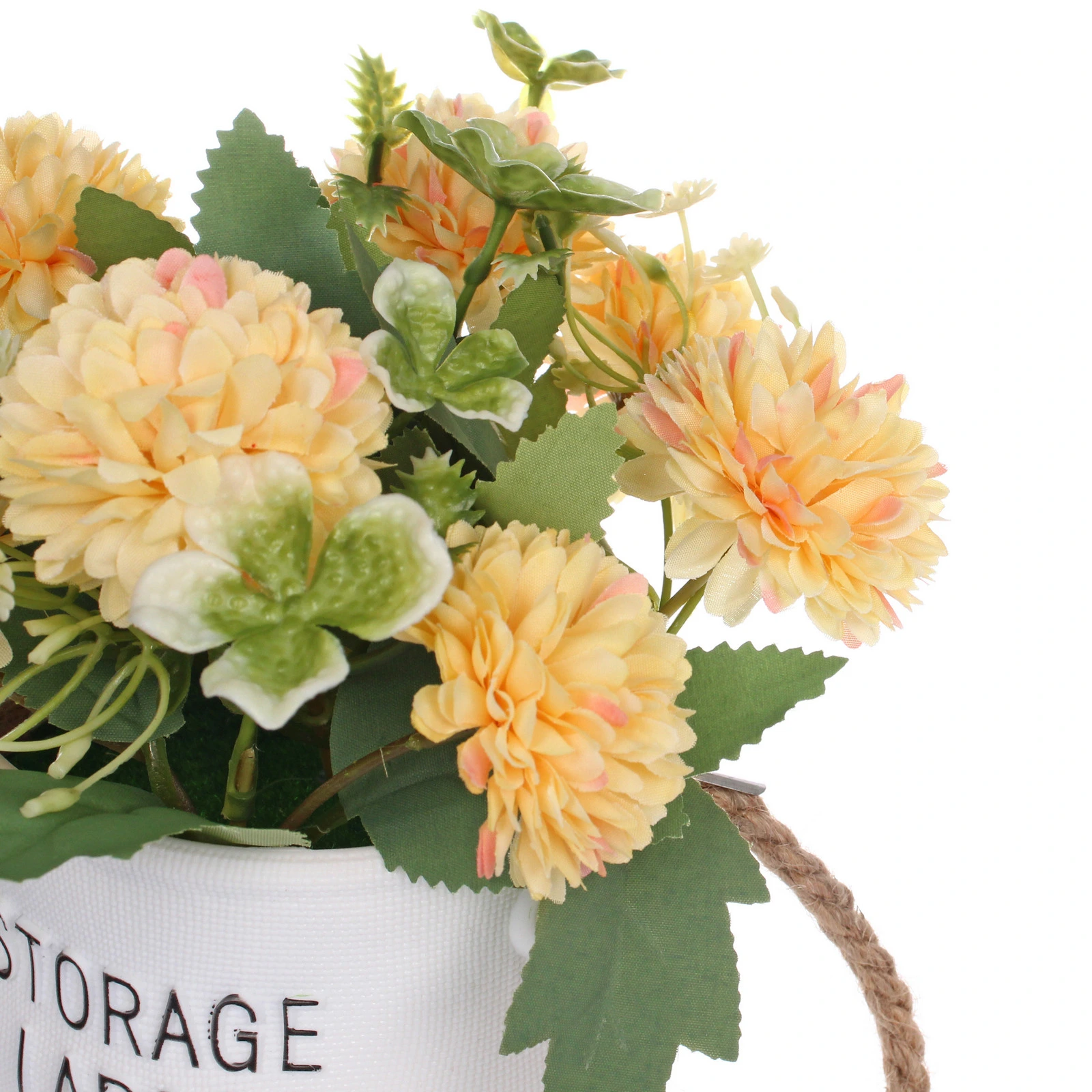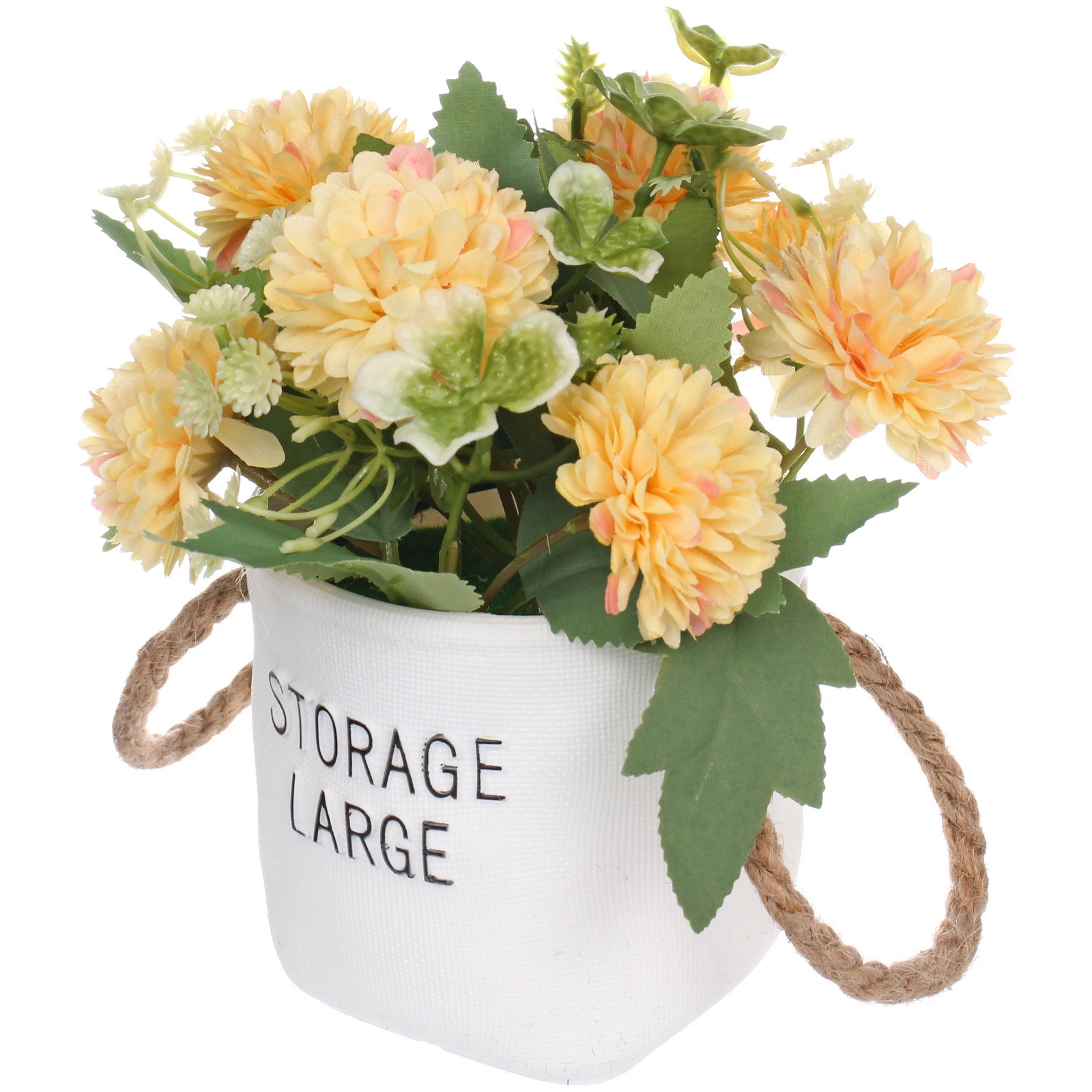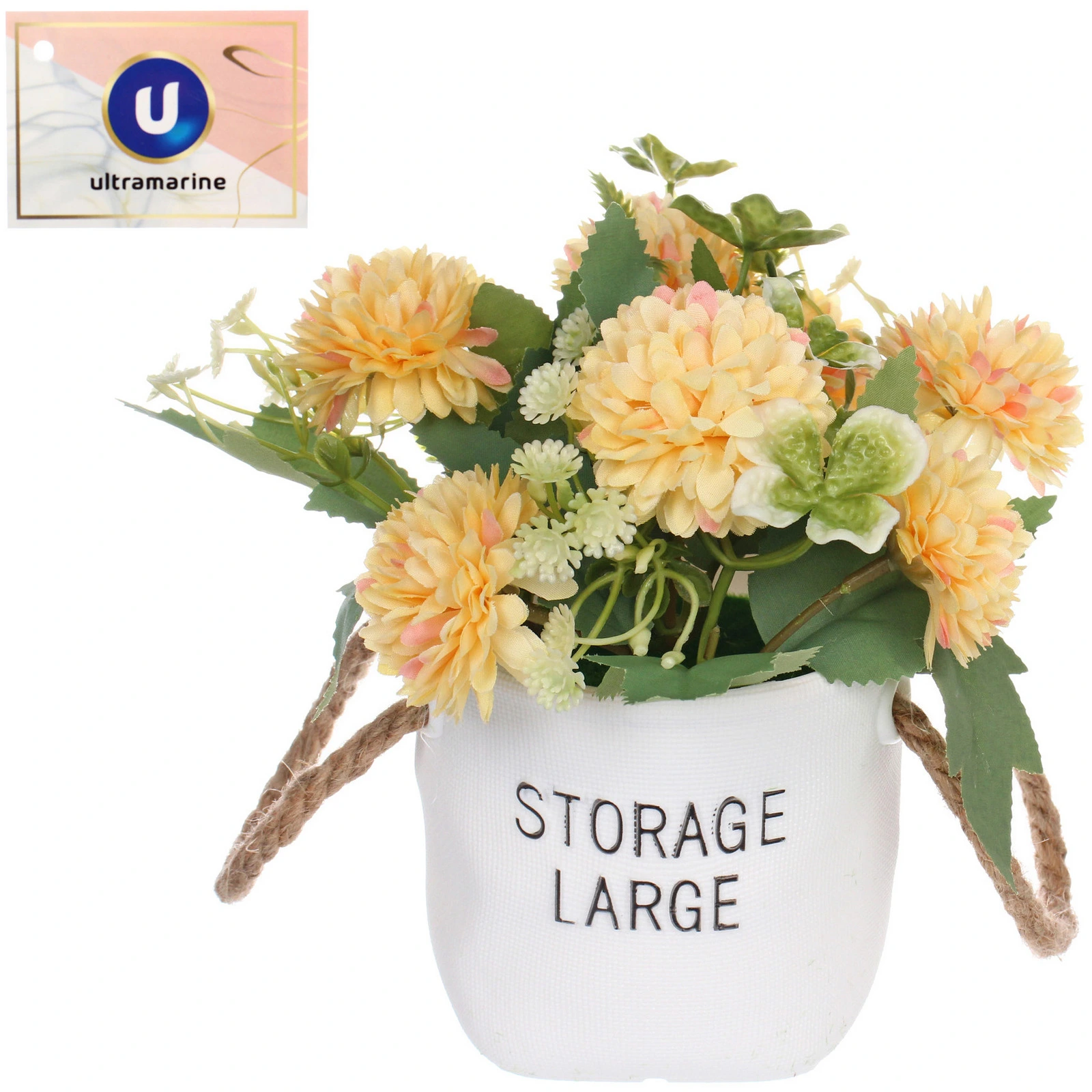Композиция размещена в аккуратном белом кашпо с фактурной поверхностью и удобными ручками из натурального шнура. Сочетание желтых соцветий, зеленых листьев различных форм и мелких декоративных элементов делает ее объемной и интересной для рассмотрения с любого ракурса.