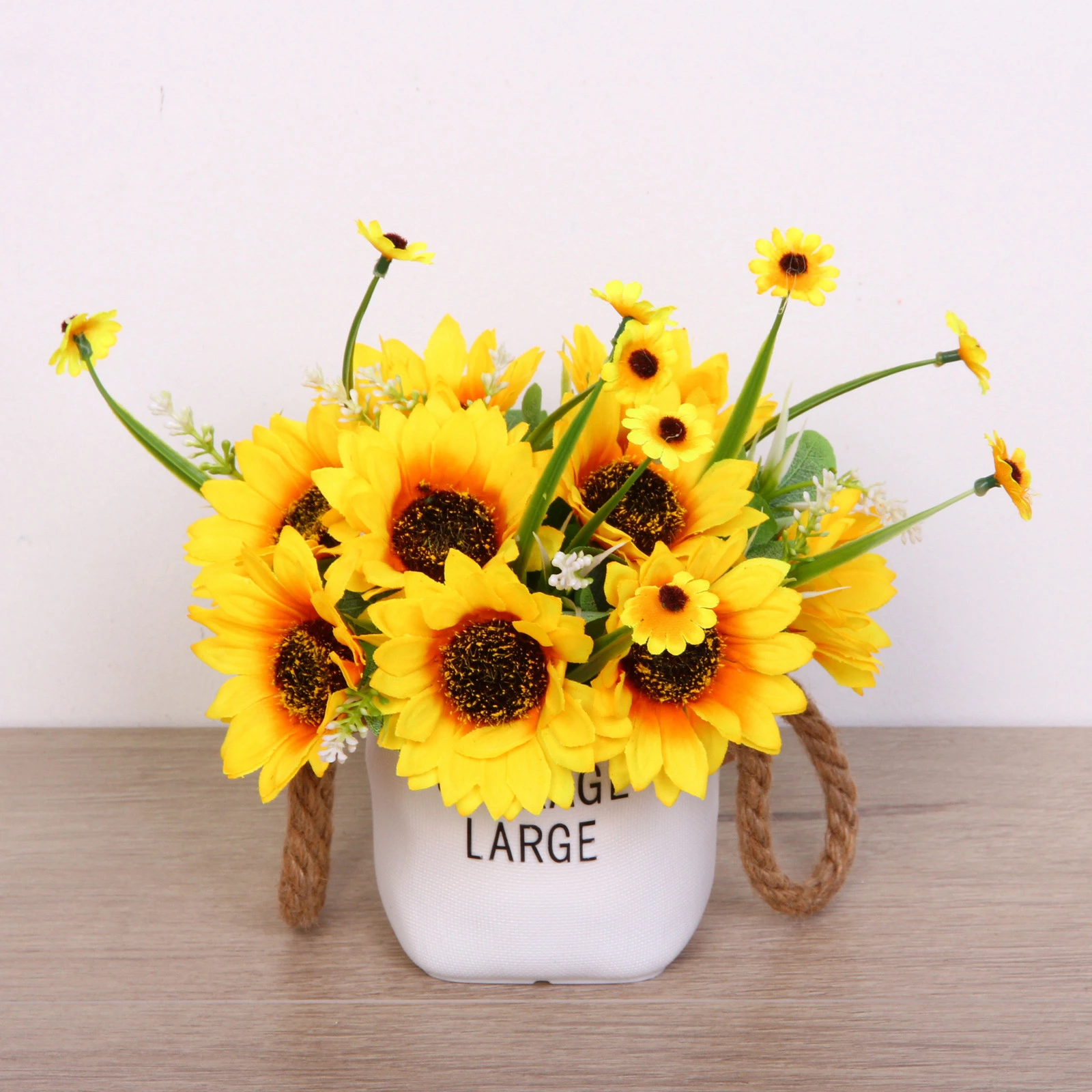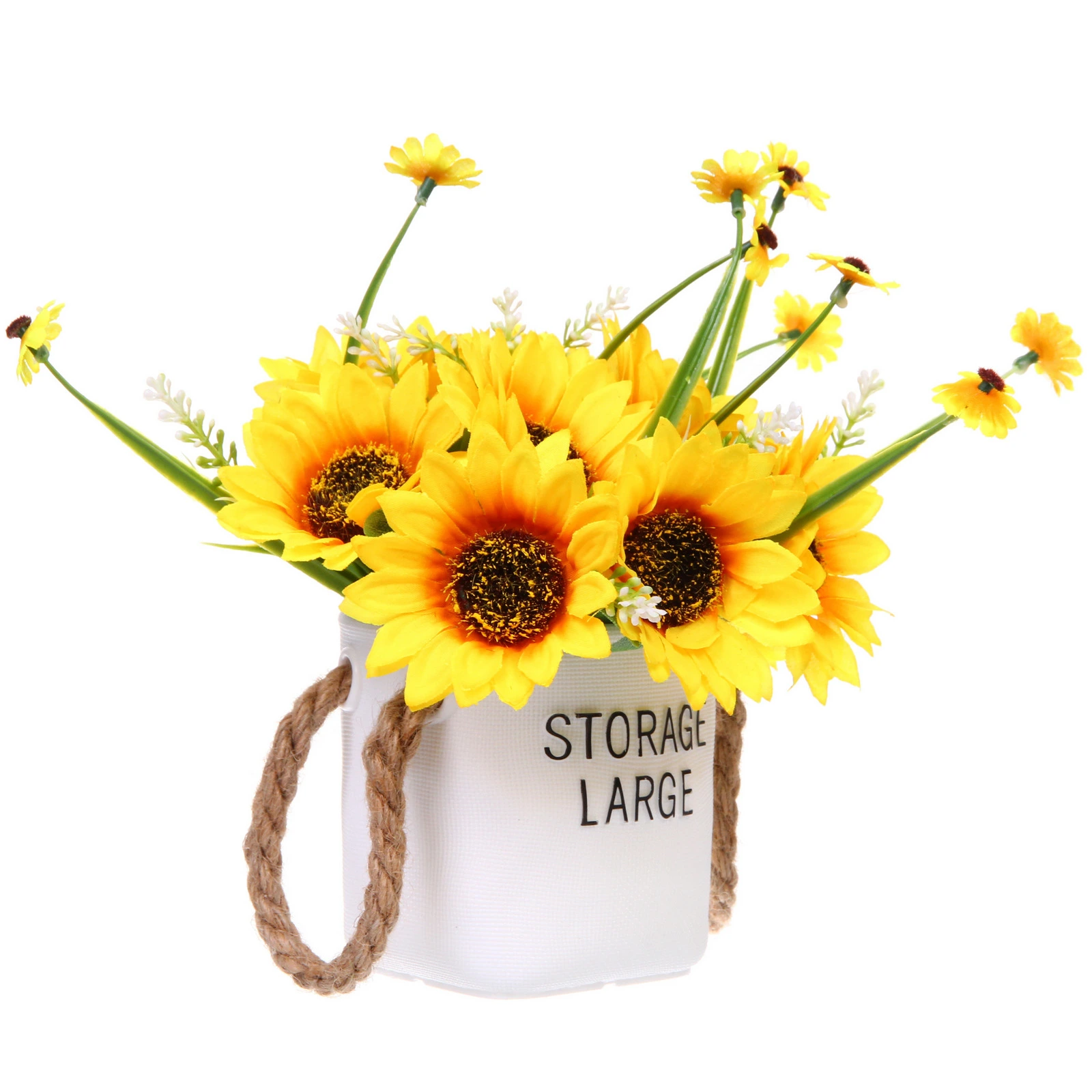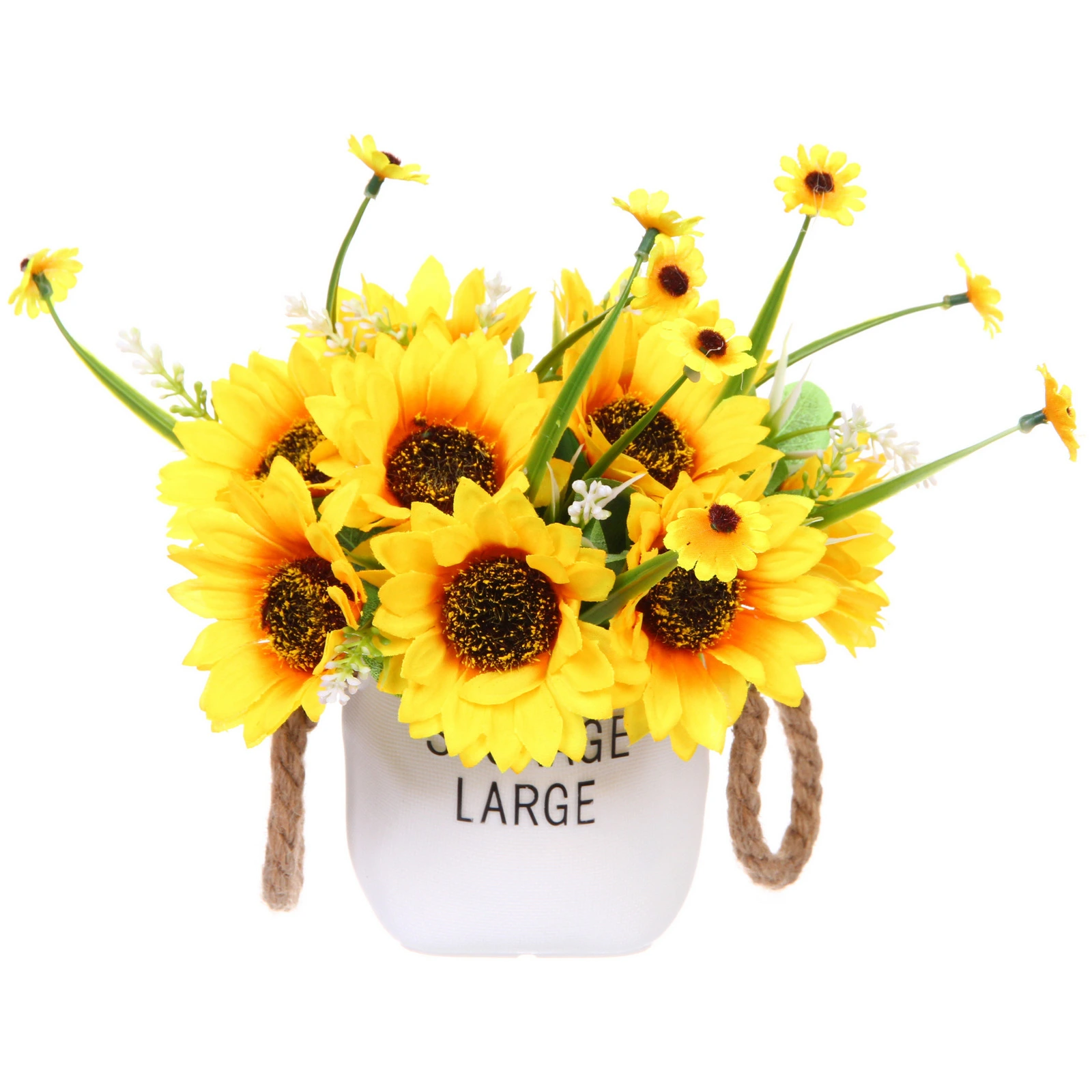 Подарите своему интерьеру яркий акцент, который не завянет и не потребует ухода. Эта стильная композиция из искусственных подсолнухов и полевых цветов в белом кашпо с верёвочными ручками создаст атмосферу уюта и летнего тепла в любой комнате.