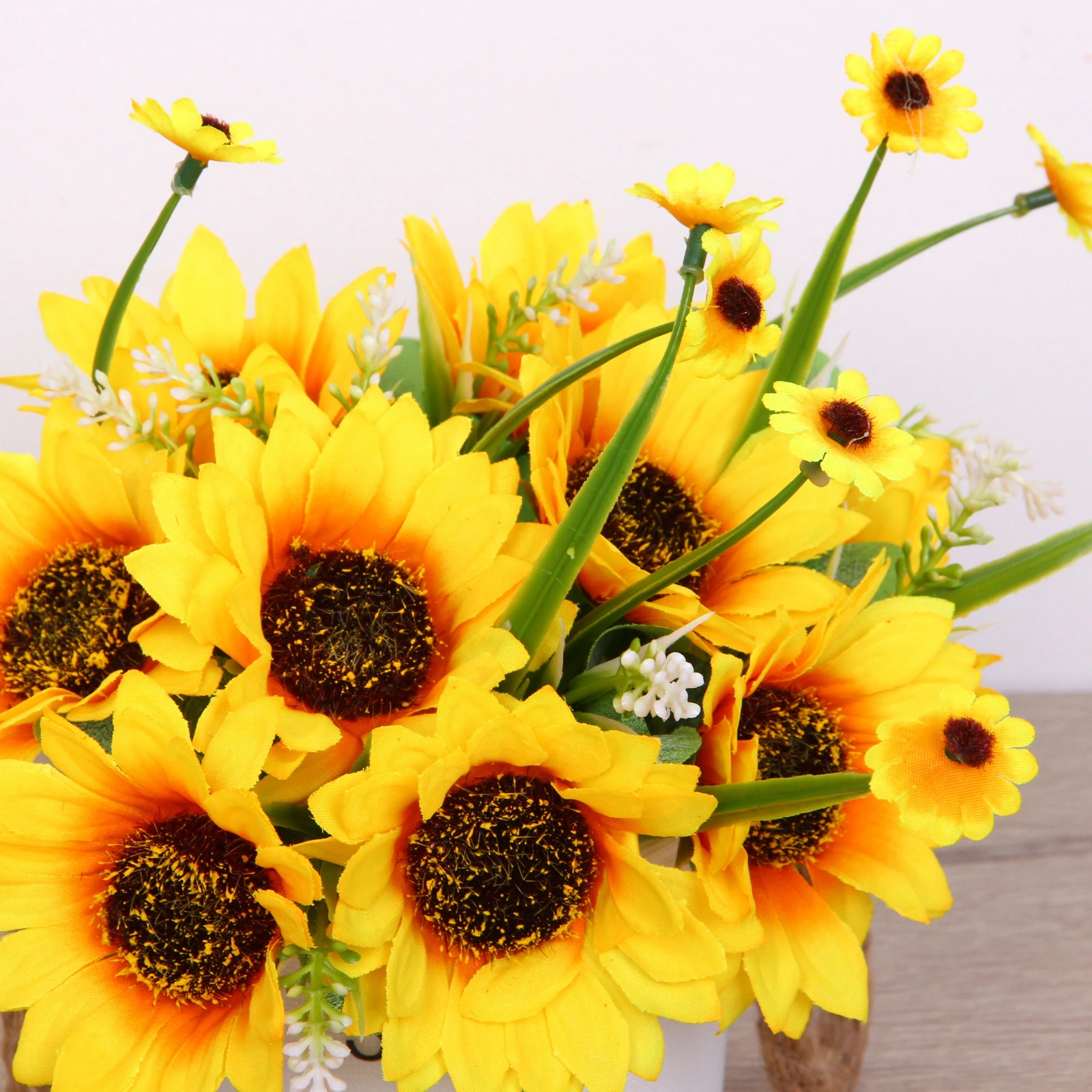 - Реалистичный вид: Цветы тщательно проработаны — от ярко-жёлтых лепестков подсолнухов с оранжевым переходом до фактурных тёмно-коричневых серединок и нежных белых соцветий.