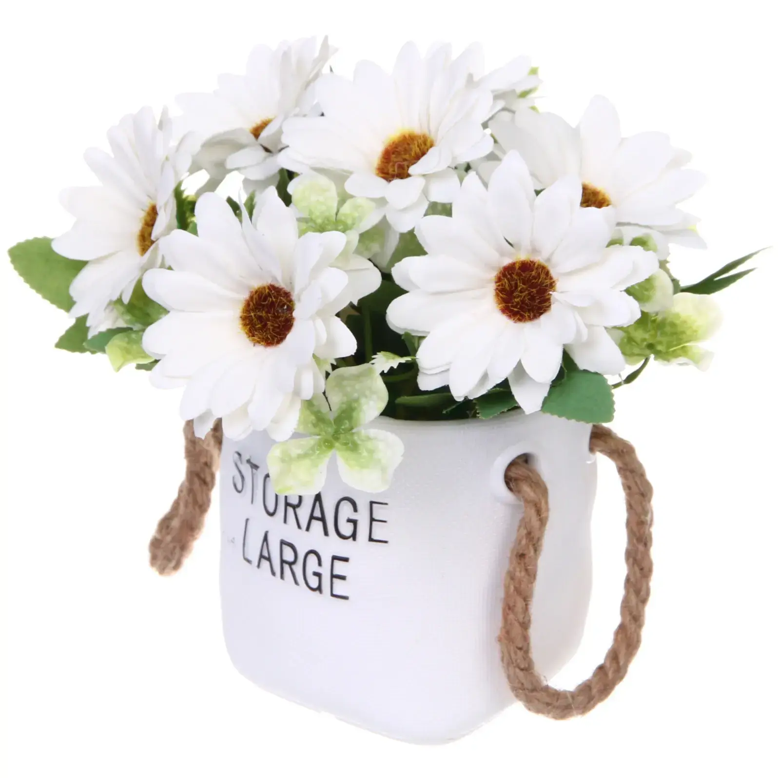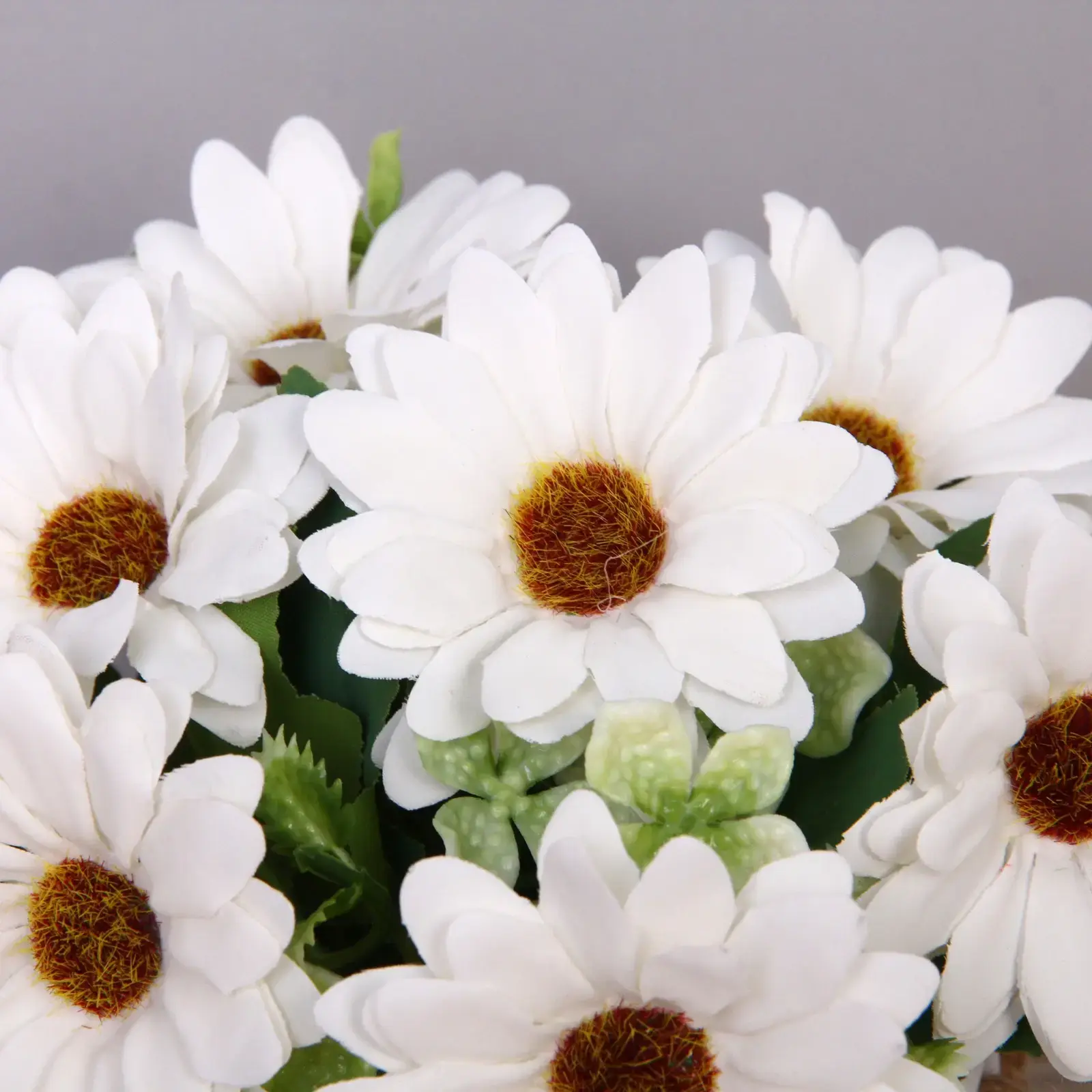 - Реалистичный внешний вид: белые ромашки с желтыми серединками и зелеными листьями создают эффект естественности.