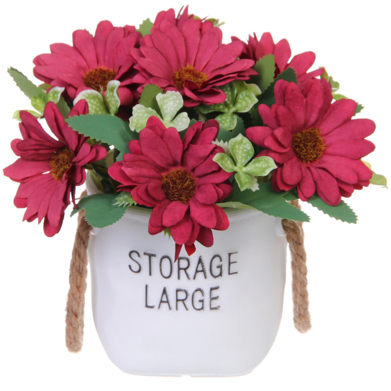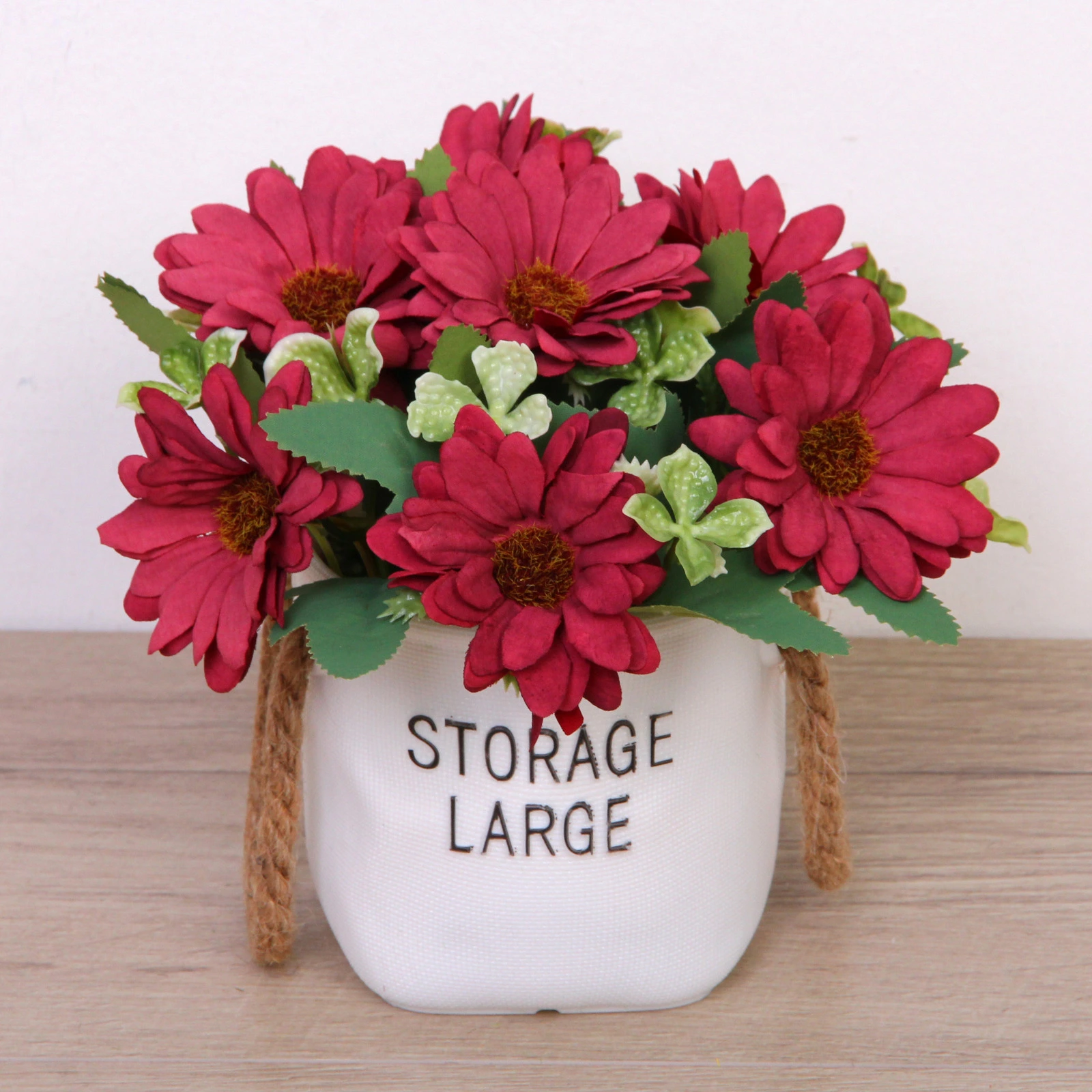 Композиция представляет собой искусственные цветы, имитирующие бордовые ромашки с желто-коричневой сердцевиной, дополненные зелеными листьями различной формы и оттенка. Все элементы надежно закреплены в белом пластиковом контейнере-кашпо. Общие габариты изделия составляют 10 см в ширину и 20 см в высоту, что позволяет гармонично вписать его в интерьер, не загромождая пространство.
