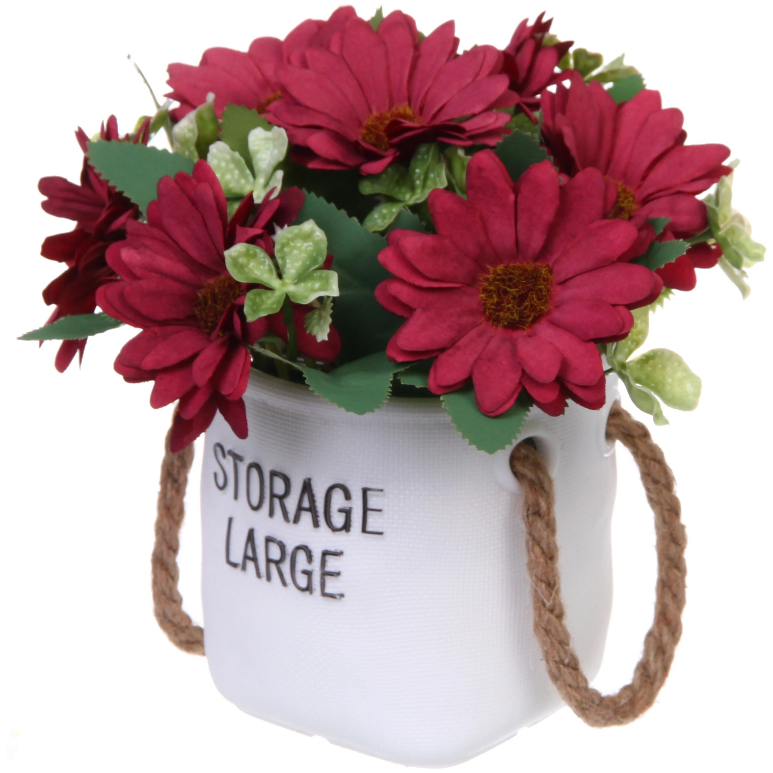 - Стильный акцент: Белое кашпо с надписью «STORAGE LARGE» и натуральными веревочными ручками добавляет композиции шарма в стиле рустик или кантри, делая ее самодостаточным декоративным элементом.