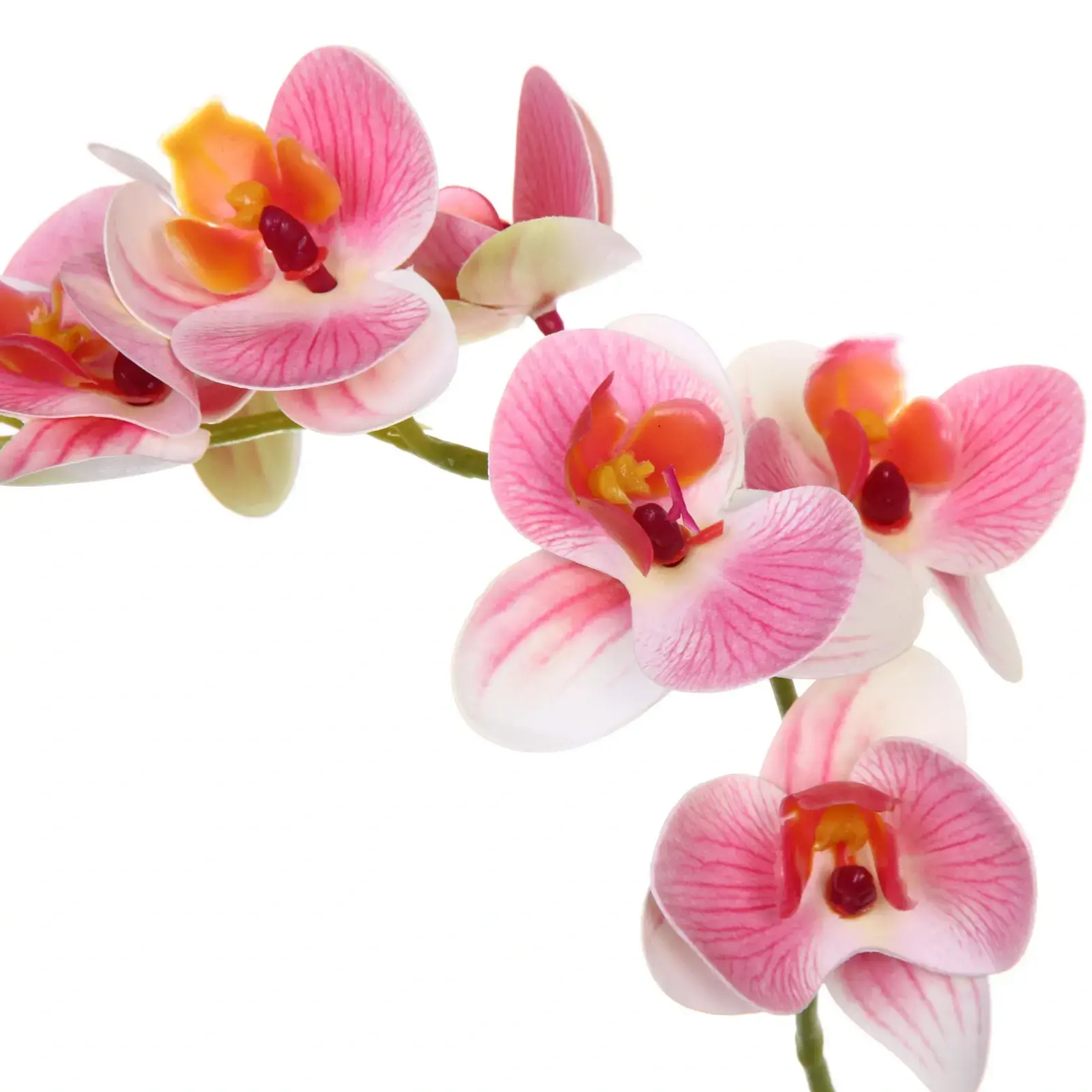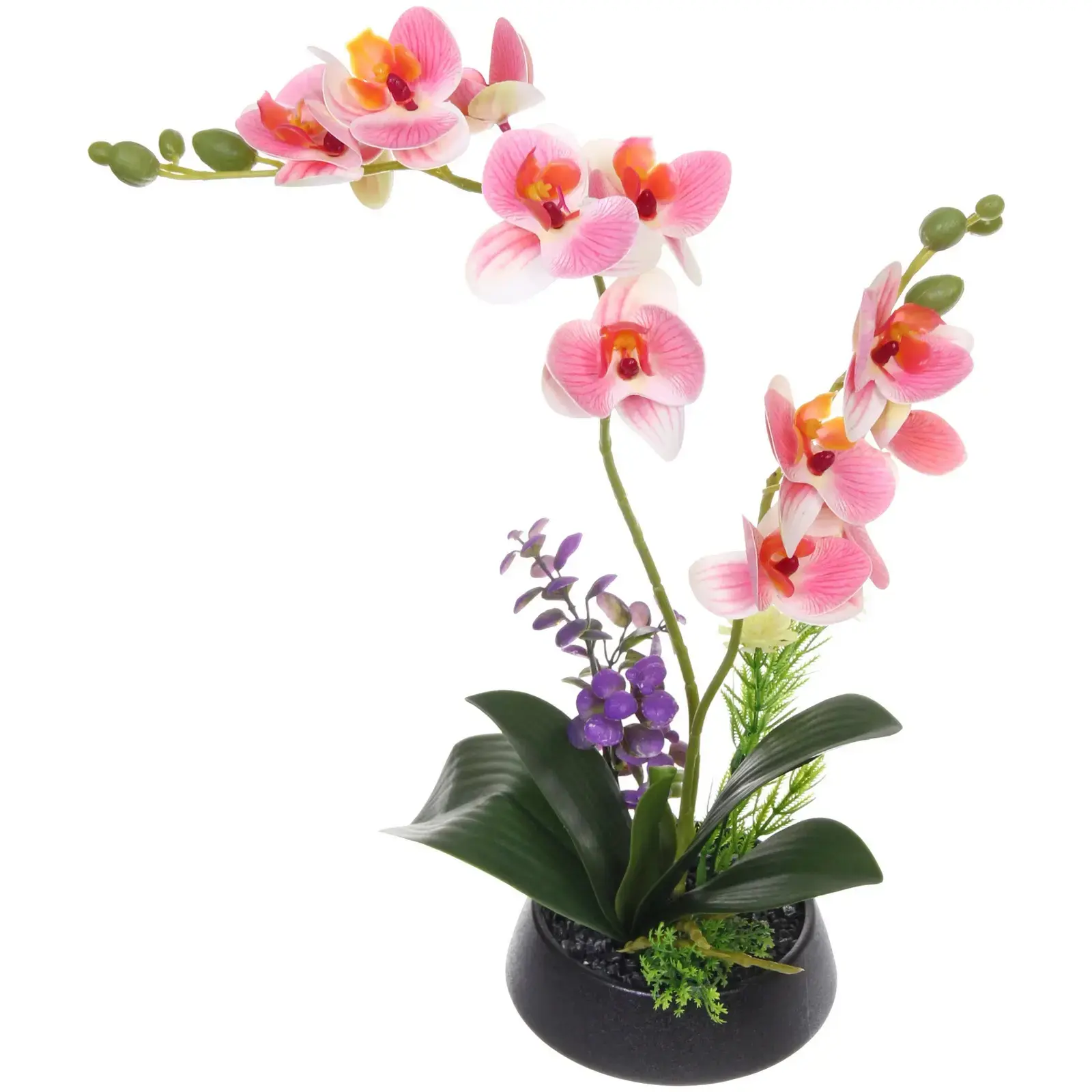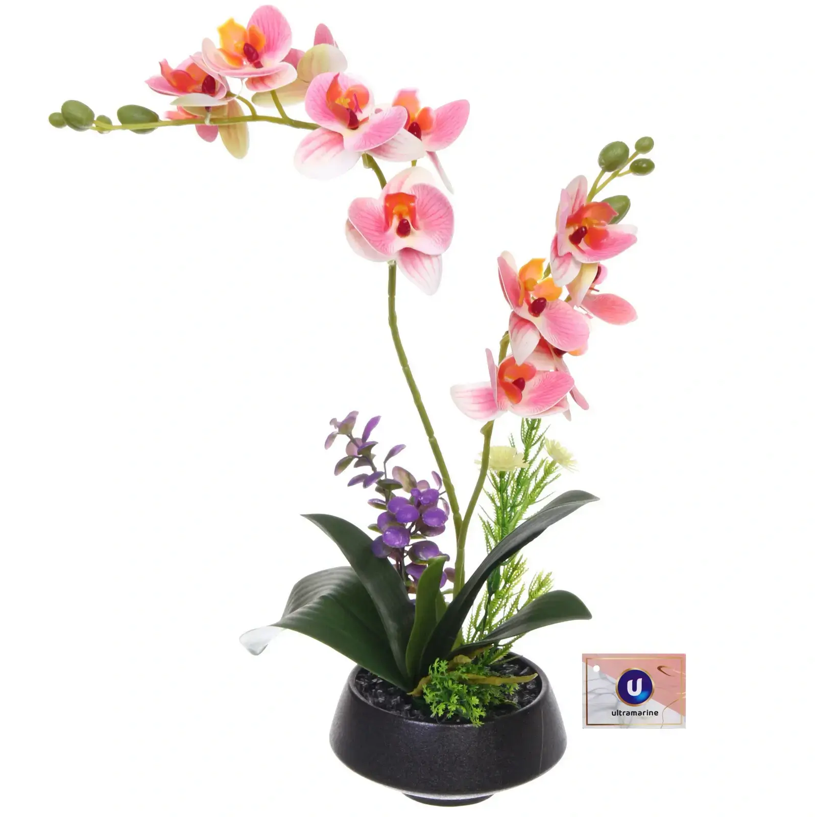 Эта изысканная цветочная композиция «Орхидея» станет настоящим украшением вашего дома. Сочетание нежных розовых оттенков и белых вкраплений создает атмосферу уюта и гармонии. Искусственные цветы выглядят так естественно, что их сложно отличить от живых, а керамический горшок добавляет элегантности и стиля.
