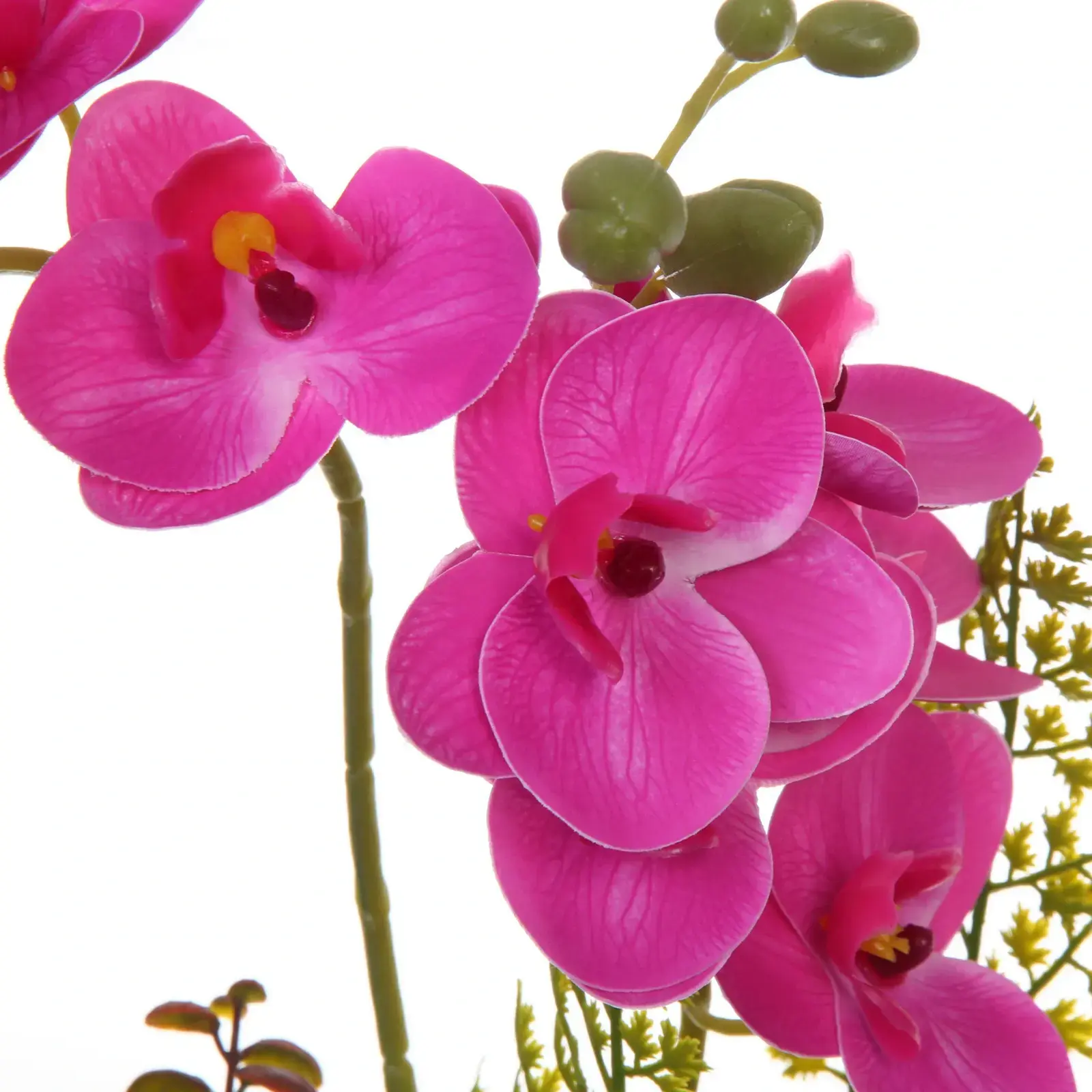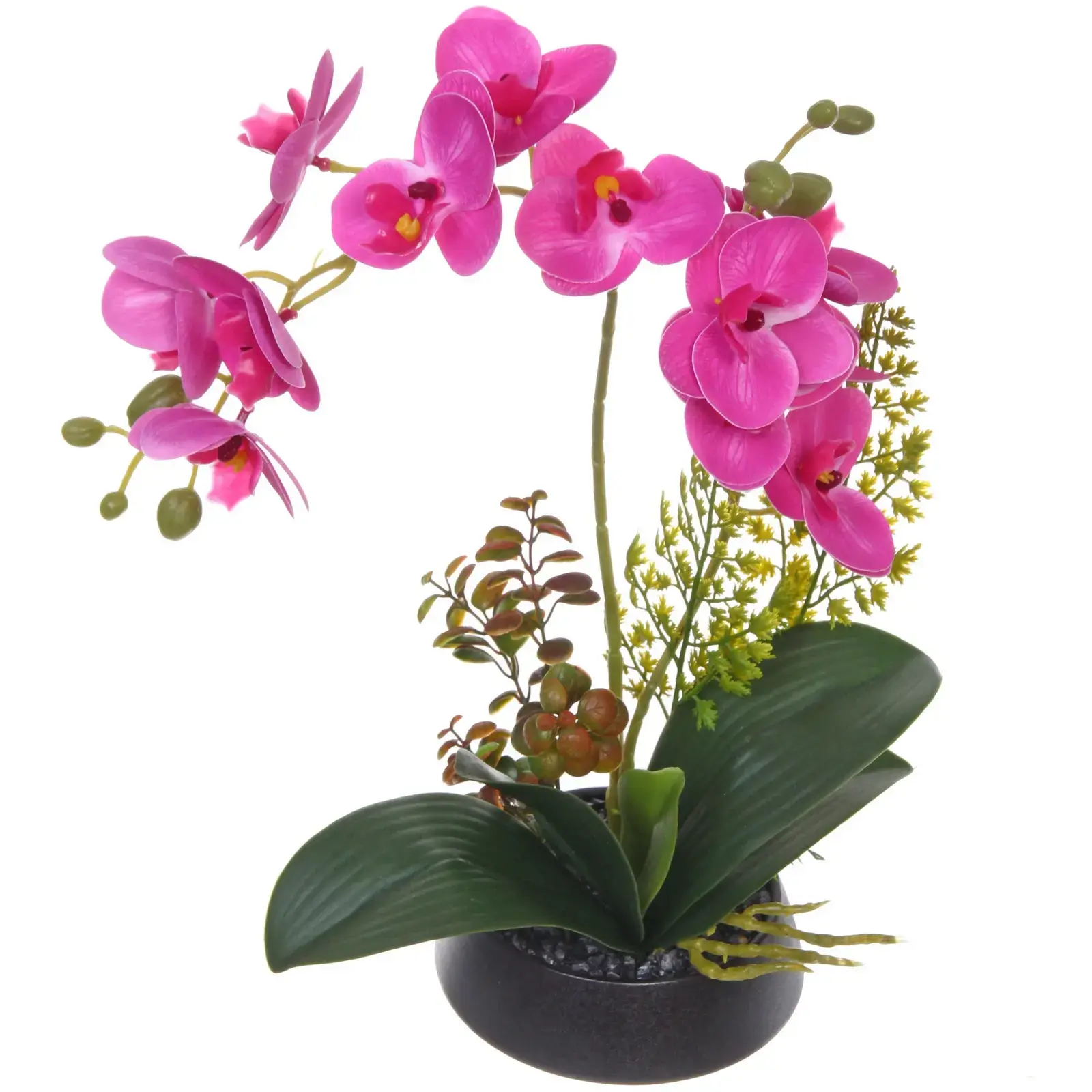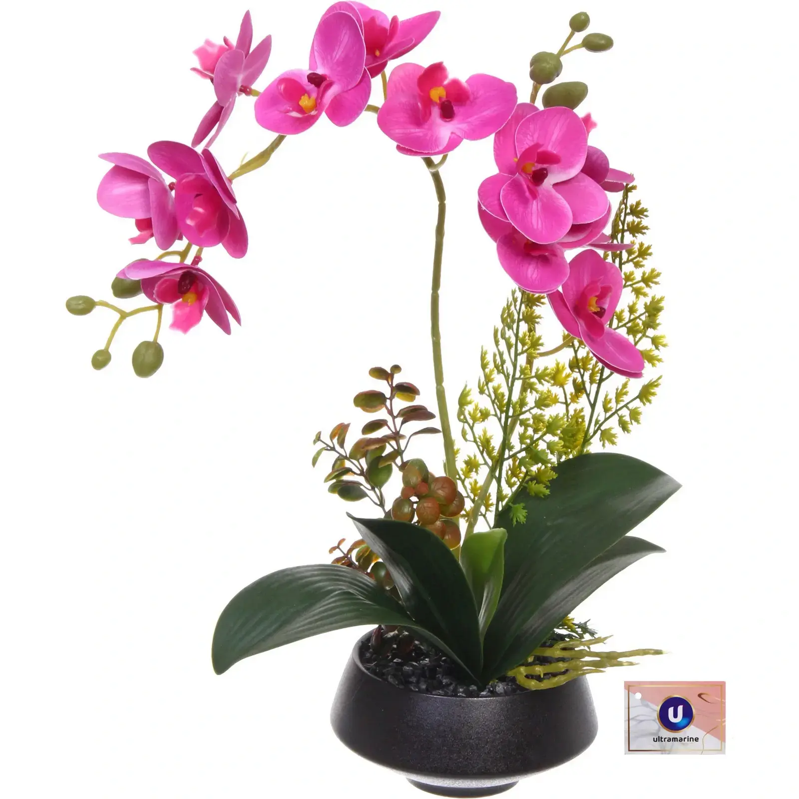 Размер композиции составляет 20х38 см, что делает её компактной и удобной для размещения в различных интерьерах. Изготовлена из качественных материалов: керамика, пластик и полиэстер, что обеспечивает долговечность и устойчивость к внешним воздействиям. Черный керамический горшок с имитацией камня добавляет стильный акцент и гармонично сочетается с яркими цветами орхидеи.
