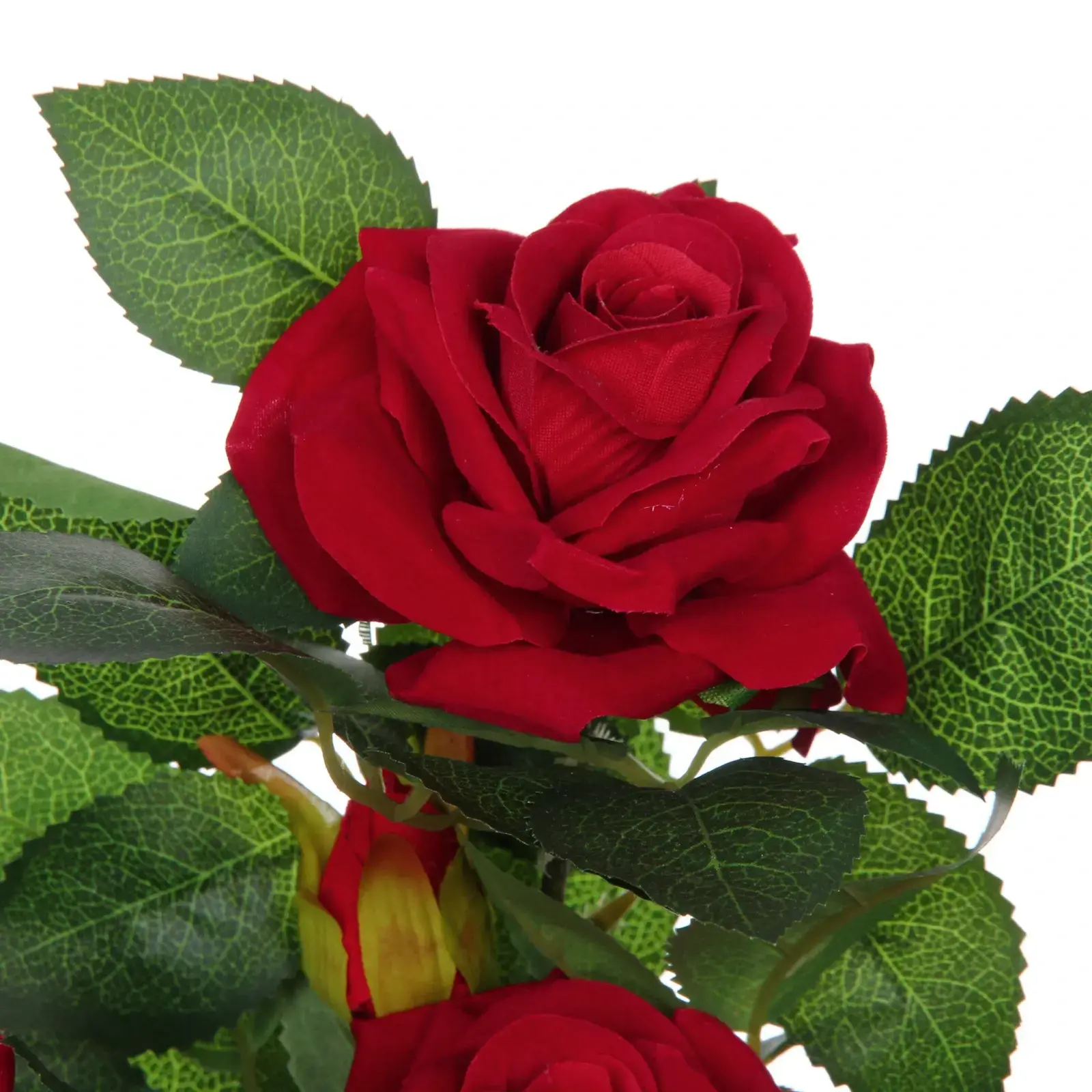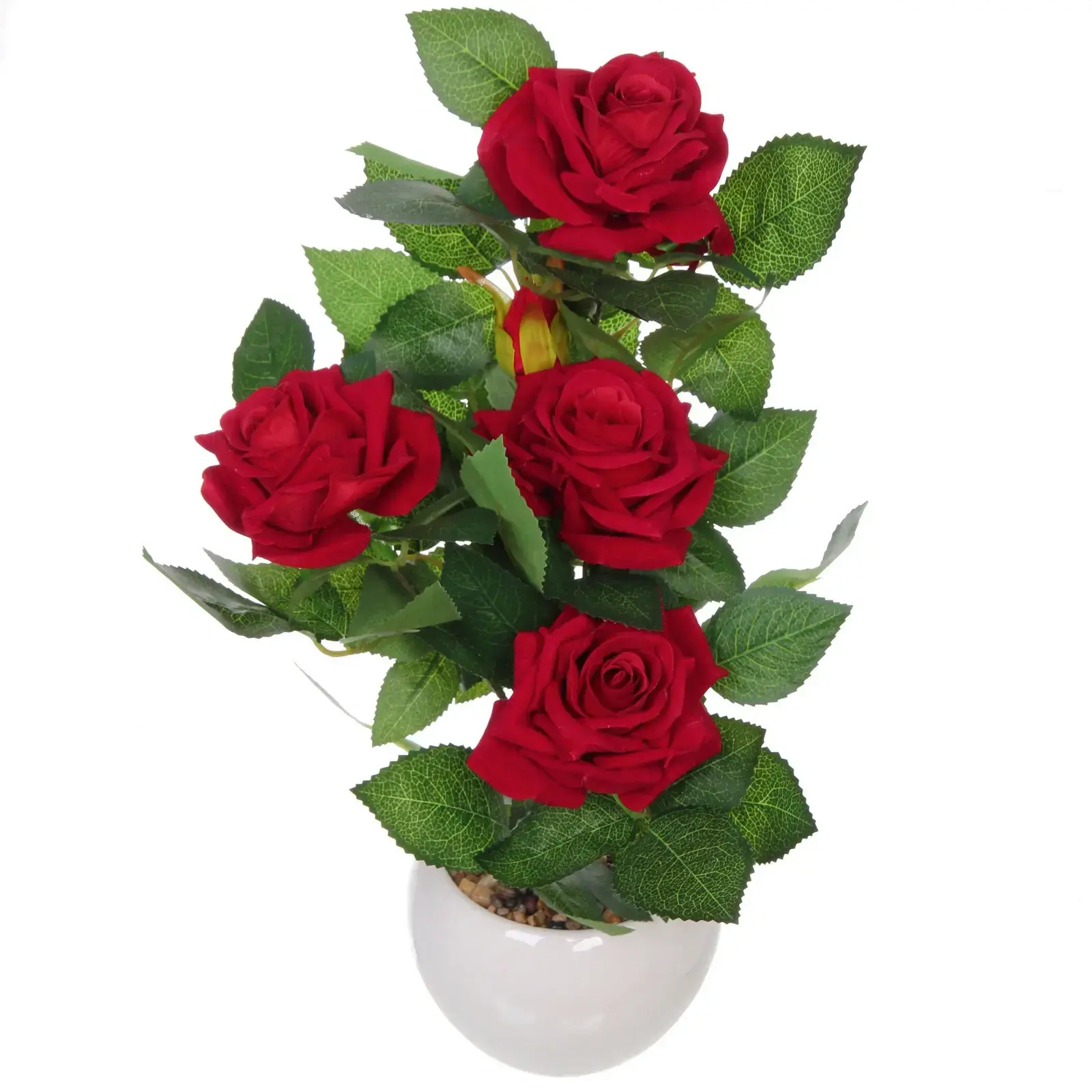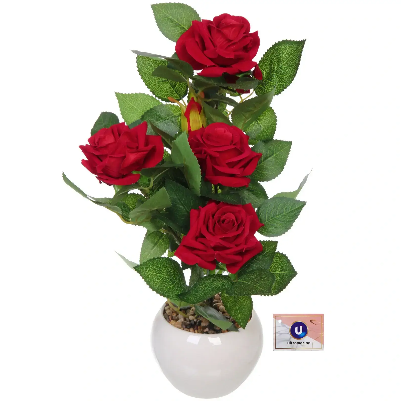 Почему стоит выбрать именно эту композицию? Во-первых, она выполнена из высококачественных материалов: керамика, пластик и полиэстер обеспечивают долговечность и реалистичный внешний вид. Во-вторых, яркие красные розы с детализированными зелеными листьями создают эффект натуральности, что делает композицию идеальной для любого стиля интерьера. В-третьих, вам не нужно беспокоиться о поливе или освещении — просто наслаждайтесь красотой!