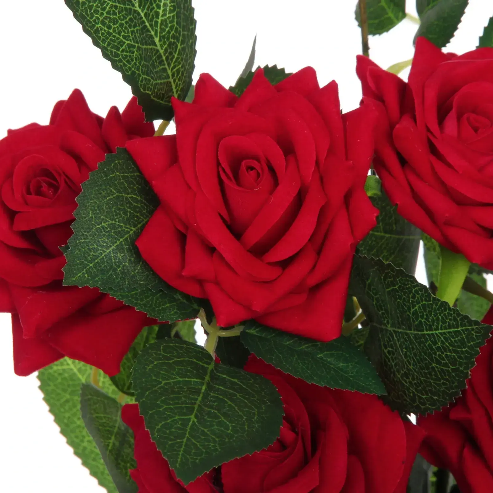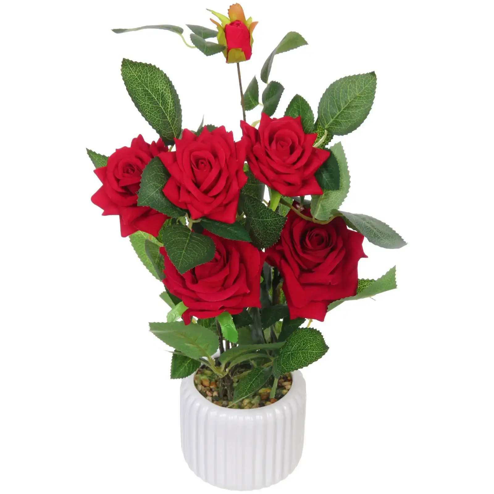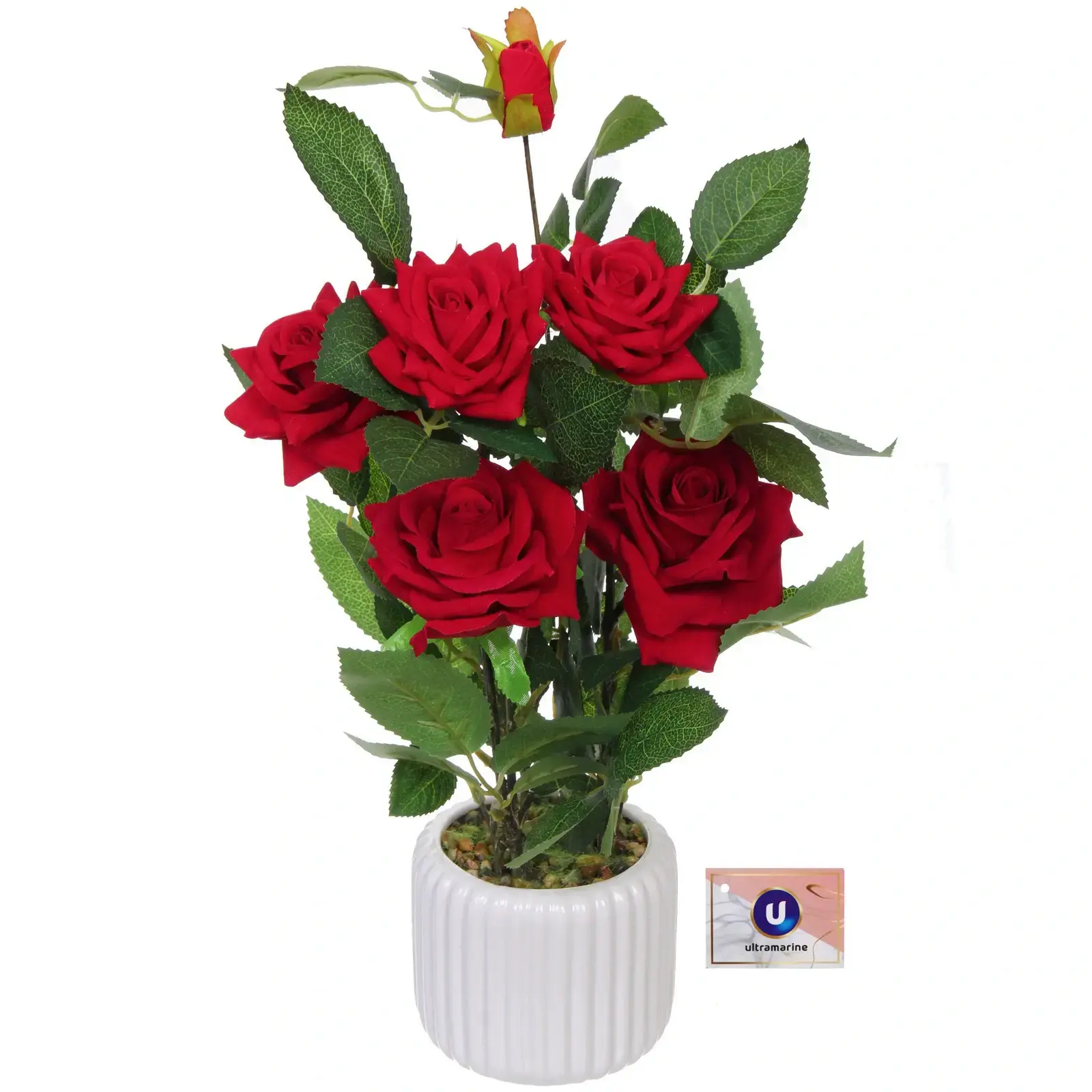 Почему стоит выбрать именно эту композицию? Во-первых, она выполнена из качественных материалов: керамика, пластик и полиэстер обеспечивают долговечность и устойчивость к внешним воздействиям. Во-вторых, яркие красные розы с гладкими лепестками и зелёные листья с рельефной текстурой создают эффект натуральности, что делает композицию неотъемлемой частью вашего интерьера. Кроме того, белый керамический горшок с рифлёной поверхностью добавляет стильный акцент.