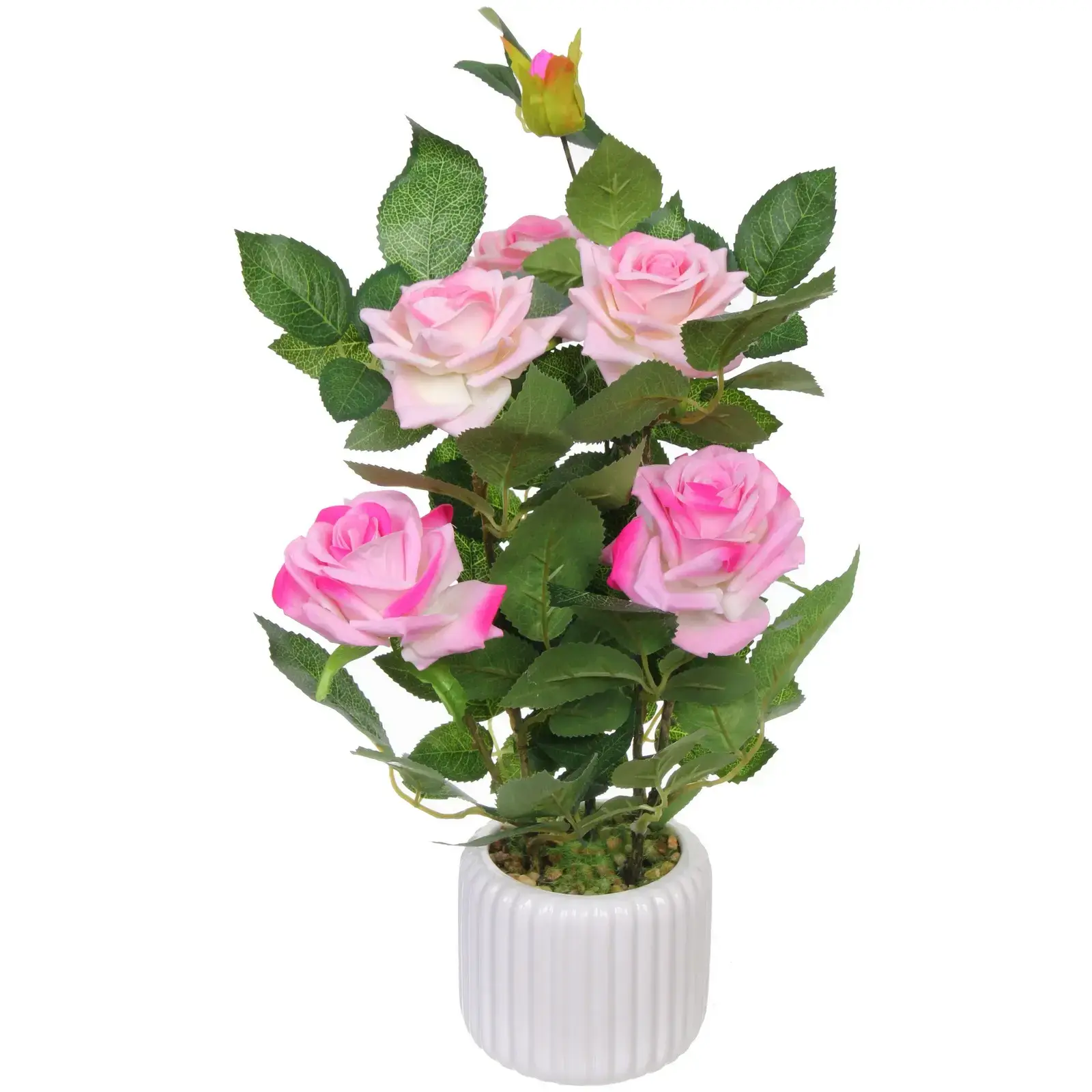 Композиция «Розовый куст» помещена в стильный белый керамический горшок с рифленой текстурой, который добавляет изысканности. Внутри горшка находится зелёный наполнитель, имитирующий почву, что делает композицию еще более реалистичной. Высота 43 см позволяет использовать её как в больших, так и в маленьких помещениях, создавая акцент на любом фоне.