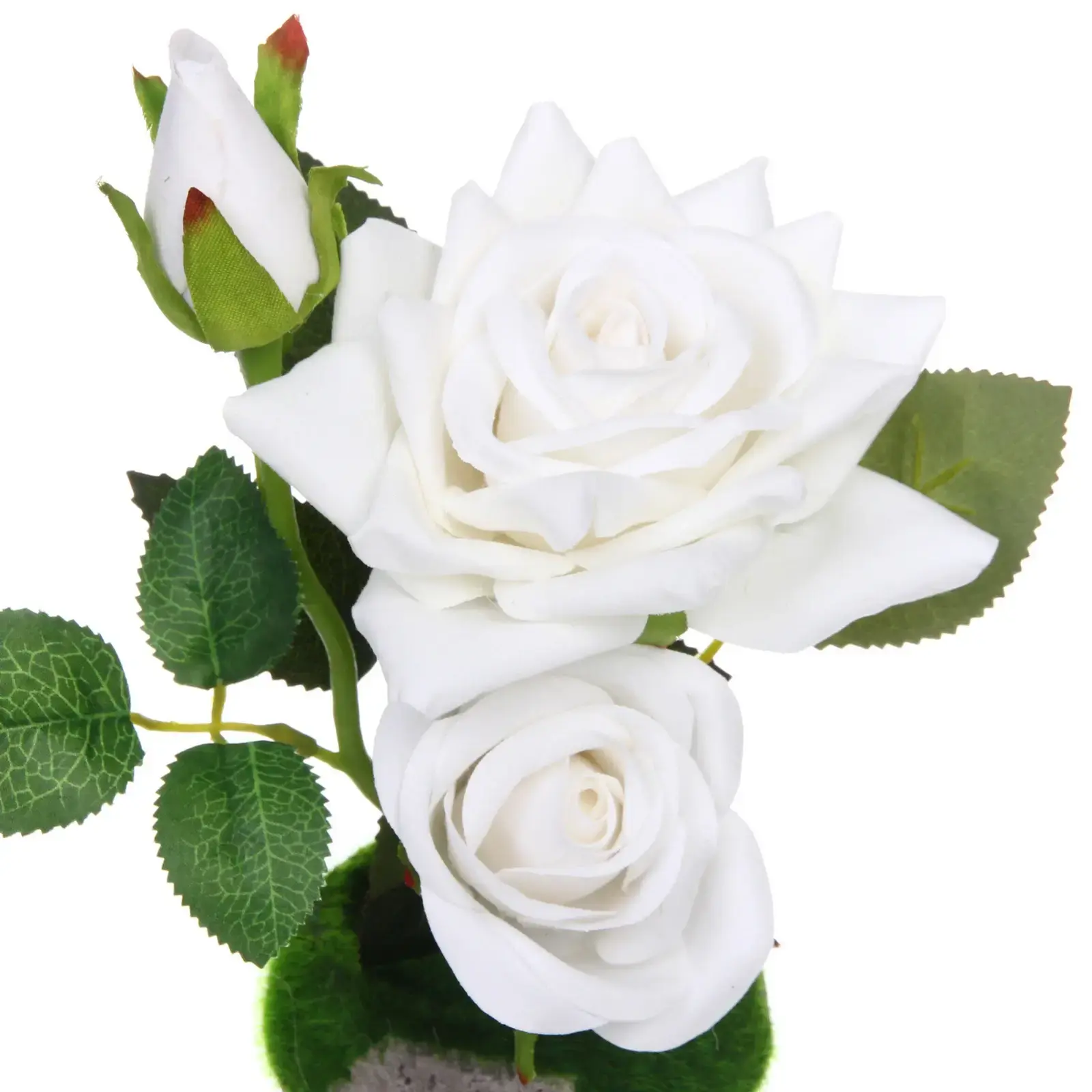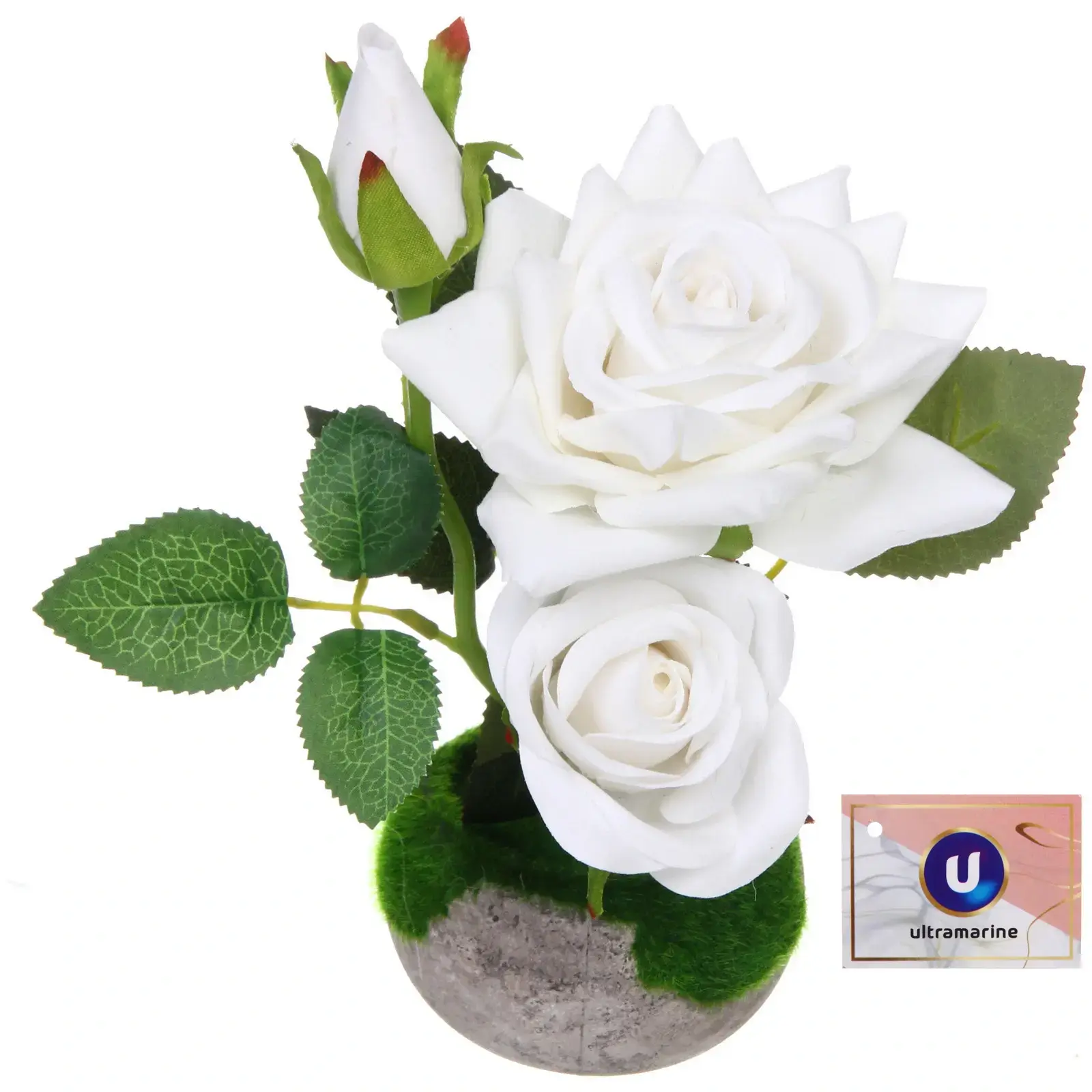 Почему стоит выбрать именно эту композицию? Во-первых, она выполнена из высококачественных материалов: пластика, полистоуна и полиэстера, что обеспечивает долговечность и устойчивость к внешним воздействиям. Во-вторых, белые розы символизируют чистоту и невинность, что делает их универсальным выбором для любого случая. В-третьих, благодаря компактным размерам (22 см в высоту) композиция легко находит место на столах, полках или подоконниках.