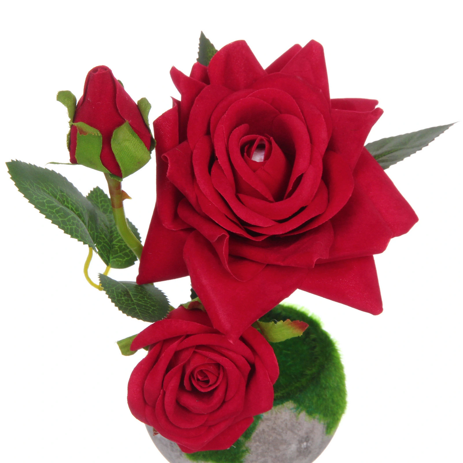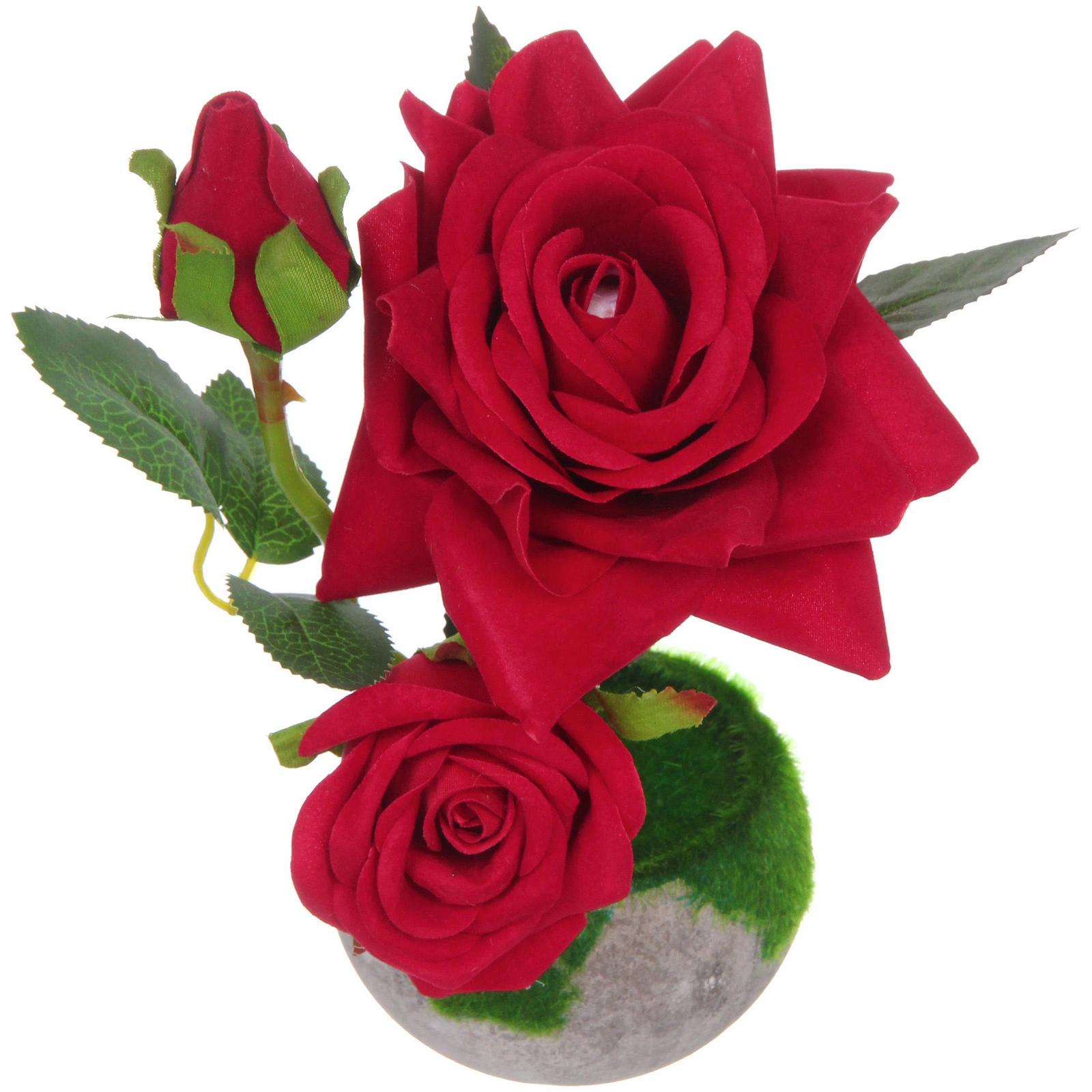Основание композиции — стильный округлый горшок серого цвета. Его верхняя часть декорирована зелёным материалом, имитирующим травяной покров, что добавляет композиции природной свежести и завершённости. Общая высота изделия составляет 22 см, что делает его заметным, но не громоздким элементом декора.