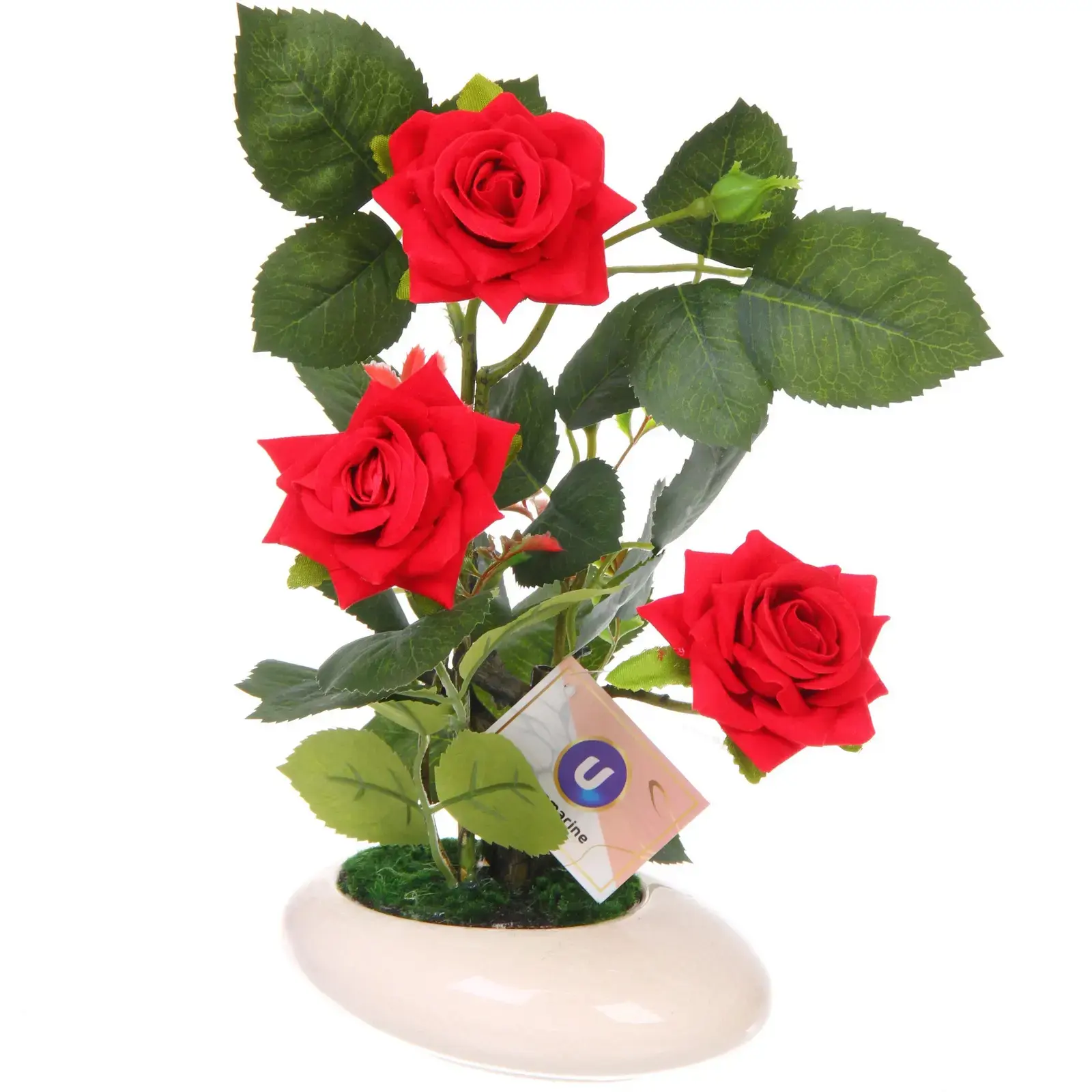 Почему стоит выбрать именно эту композицию? Во-первых, она выполнена из качественных материалов: пластика и полиэстера, что обеспечивает долговечность и устойчивость к внешним воздействиям. Во-вторых, ярко-красные розы и темно-зеленые листья выглядят очень реалистично, создавая эффект настоящих цветов. В-третьих, овальная белая ваза с гладкой поверхностью добавляет изысканности и стиля.