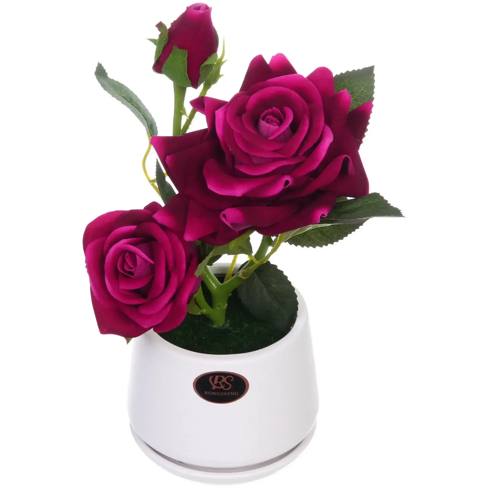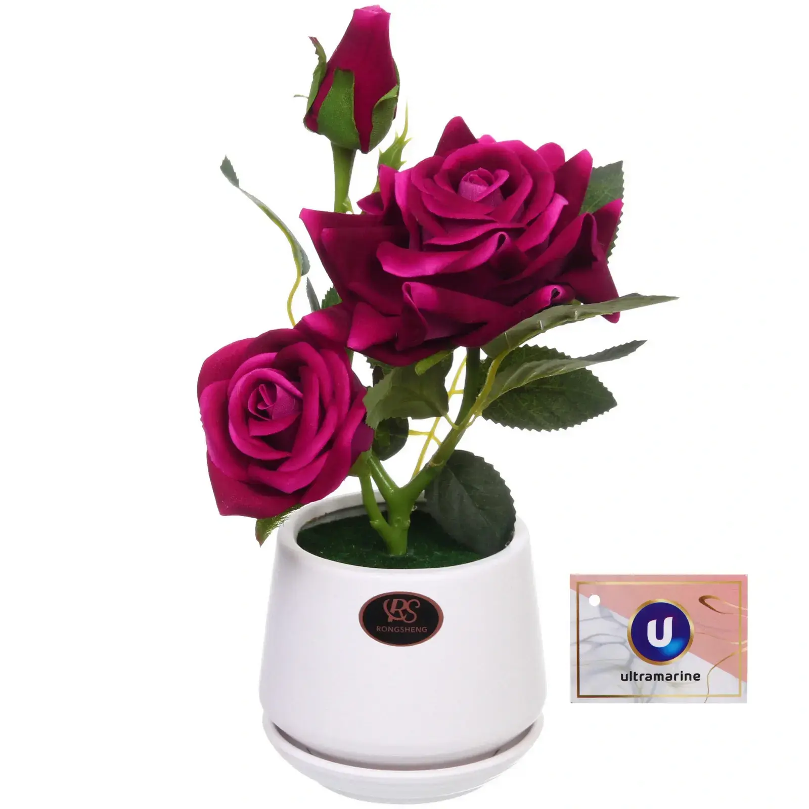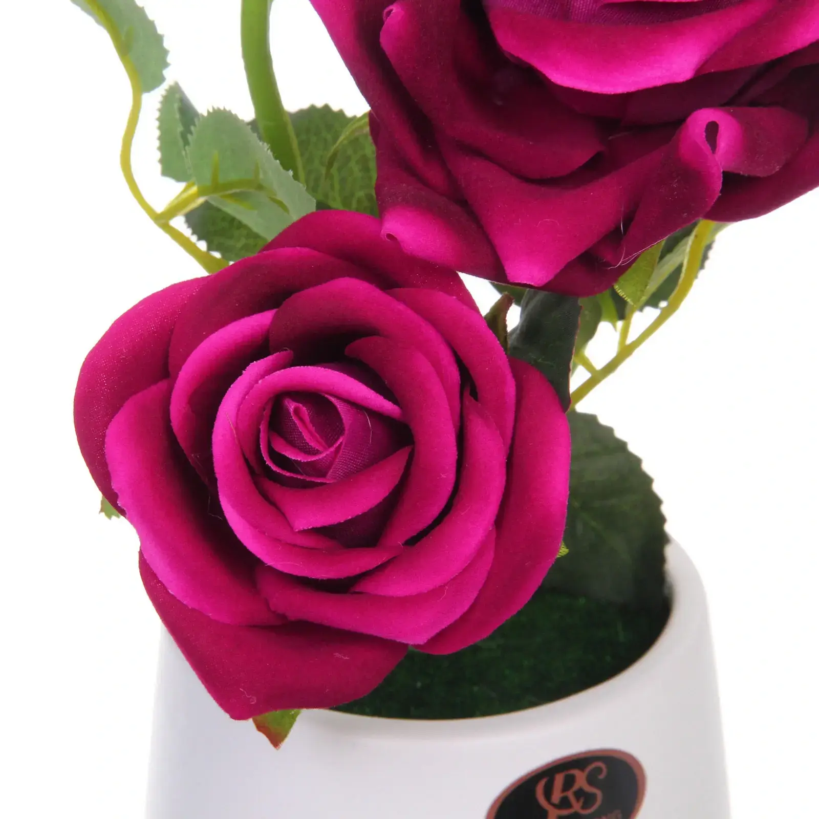 Композиция имеет высоту 28 см и представлена в стильном белом горшке, который гармонично дополняет яркие розы. Горшок выполнен из качественного керамического материала, что обеспечивает его долговечность и устойчивость. Искусственные цветы изготовлены из полиэстера и пластика, что делает их легкими и прочными. Внутри горшка находится зеленый мох, который служит для имитации почвы и придает композиции естественный вид.