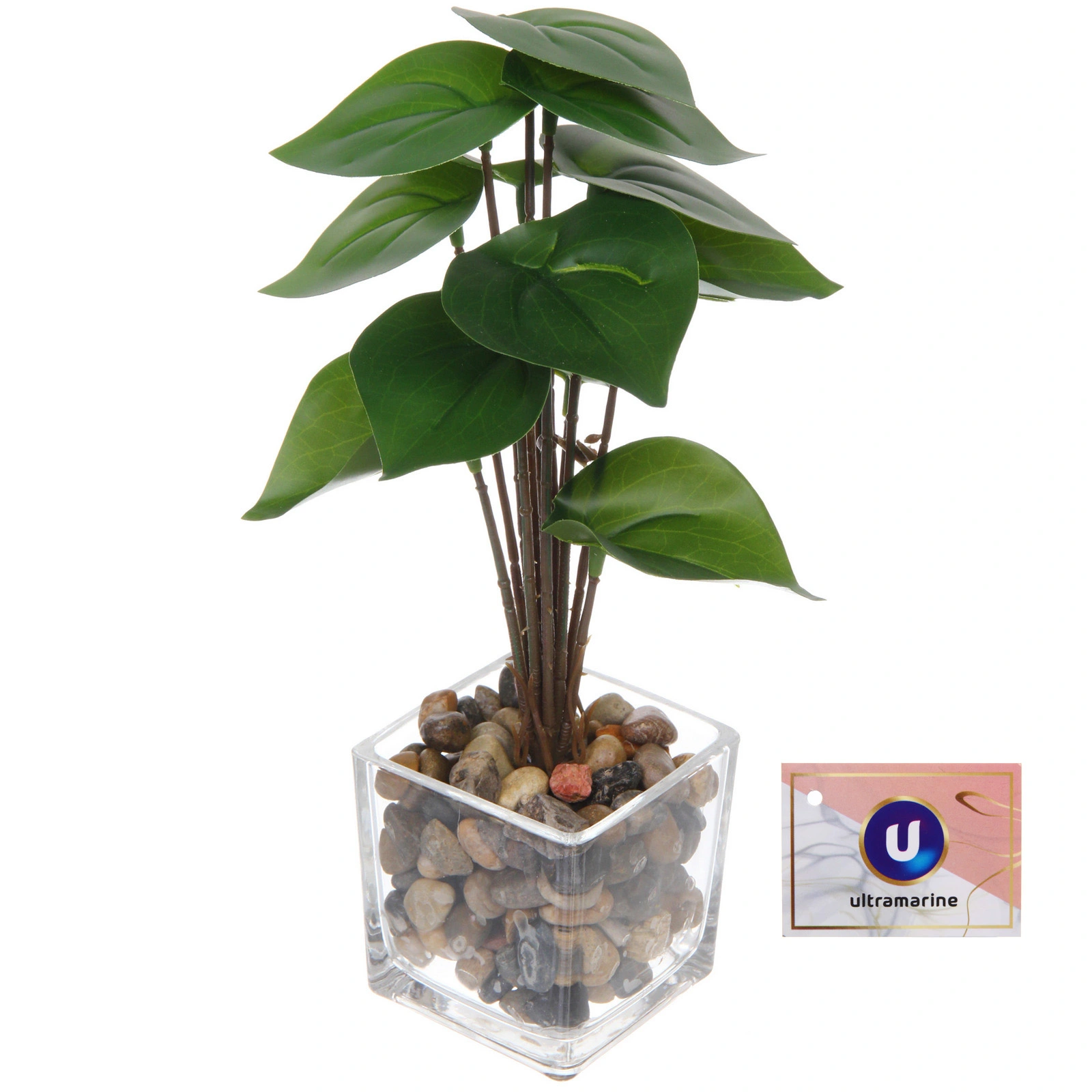 - Стильное оформление: Прозрачный кубический горшок из стекла, заполненный натуральной декоративной галькой различных оттенков (бежевый, коричневый, серый, чёрный, с акцентами розового), выглядит современно и самодостаточно.