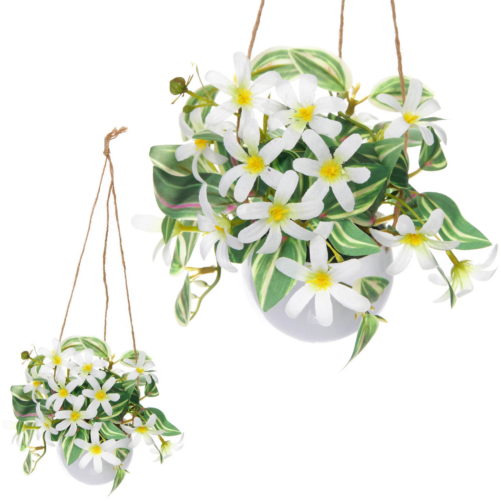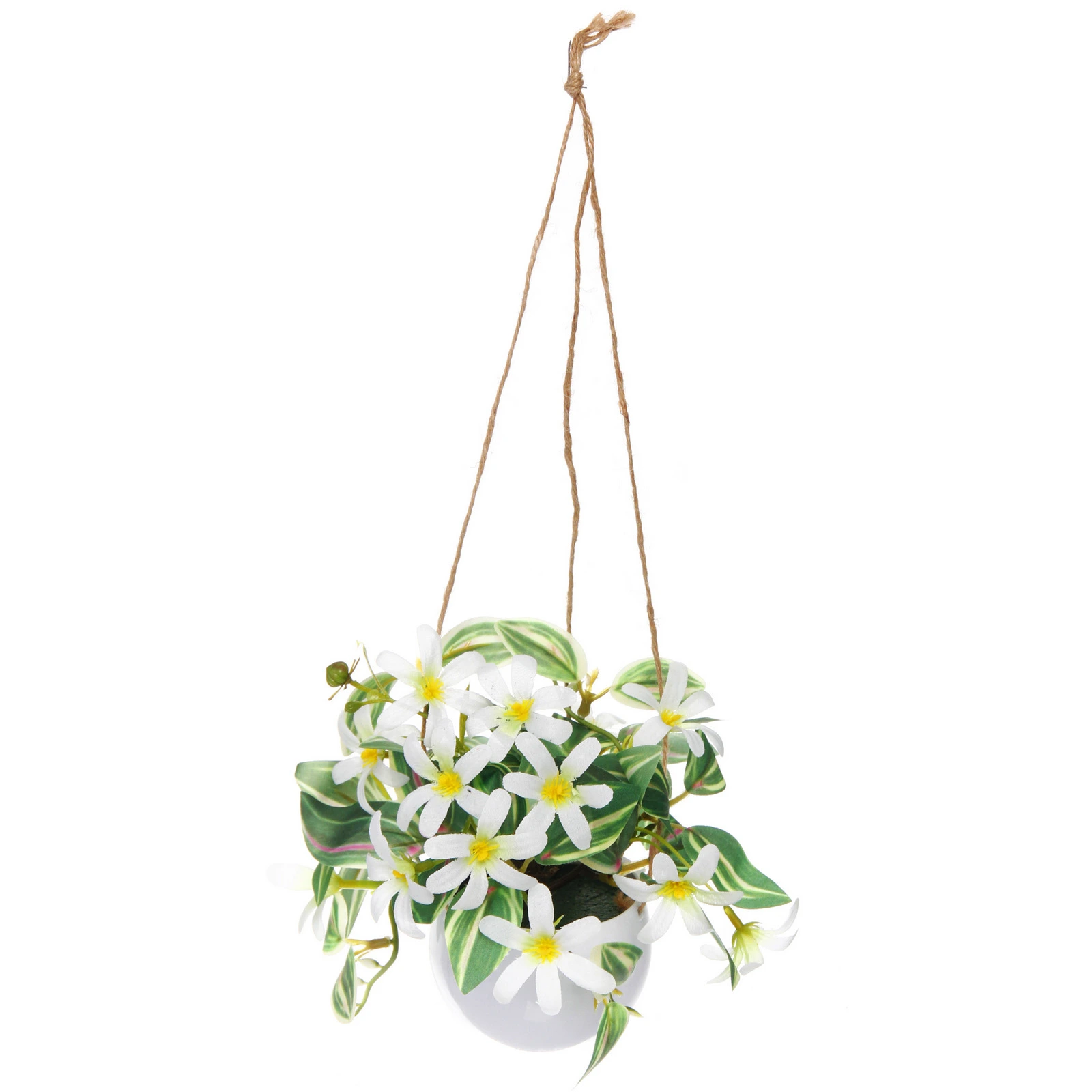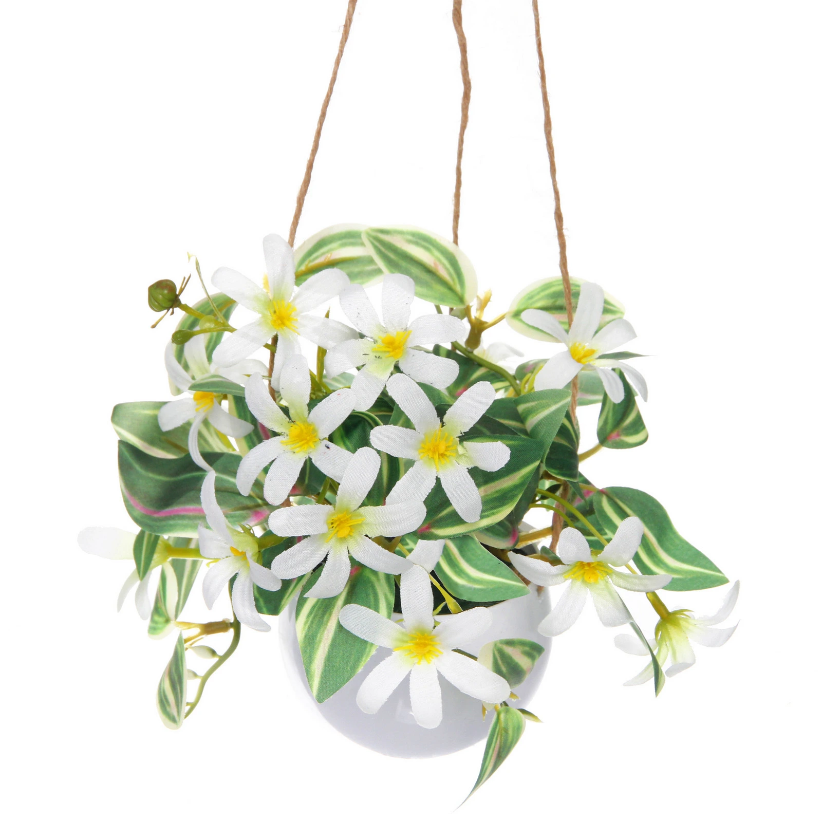 Композиция состоит из белых цветов с узкими продолговатыми лепестками и жёлтыми серединками. Листья зелёные с продольными светлыми полосами, часть из них имеет розоватые прожилки, что добавляет визуальный интерес. Все элементы закреплены в белом пластиковом горшке округлой формы с гладкой поверхностью. Подвес выполнен из трёх тонких коричневых шнуров натурального оттенка, которые сходятся вверху в аккуратный узел для удобного крепления.