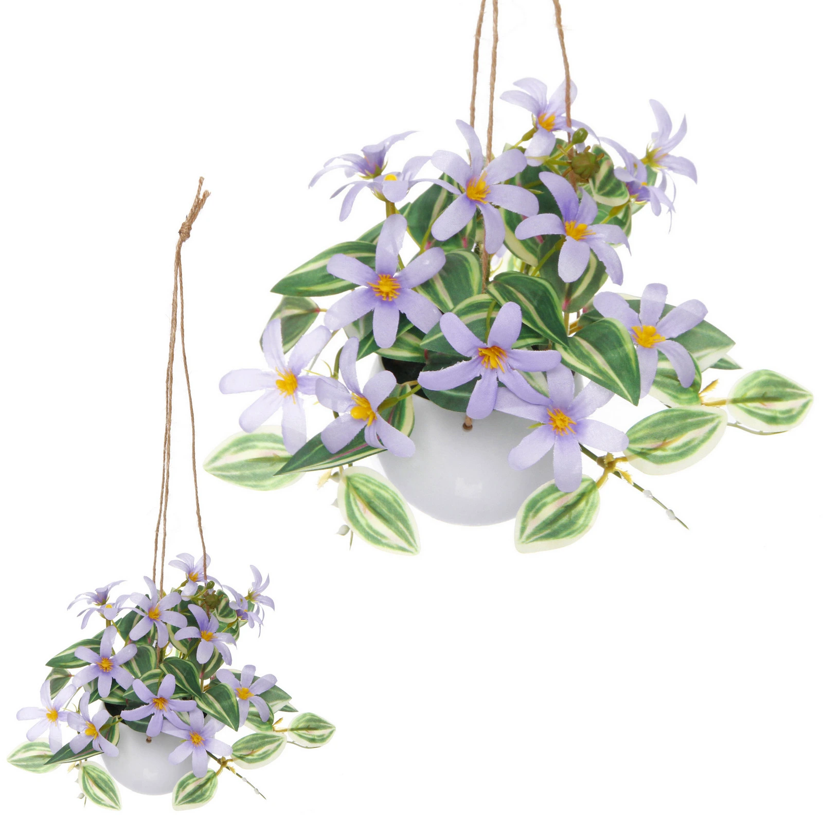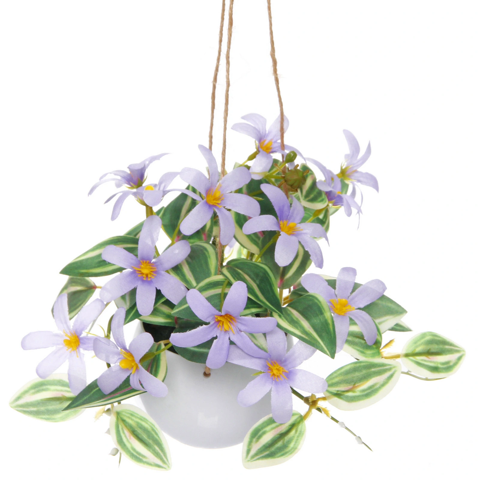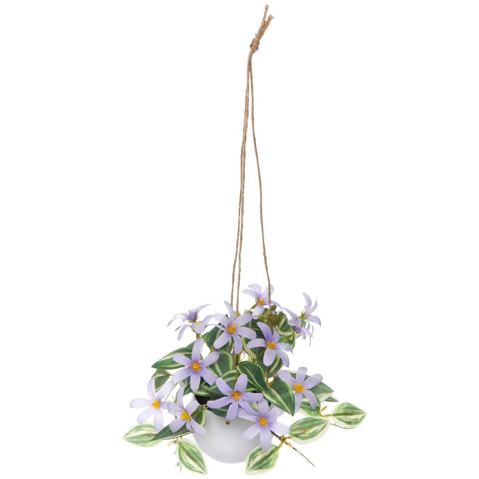 Композиция состоит из белого пластикового кашпо округлой формы, подвешенного на трёх прочных декоративных шнурах натурального коричневого оттенка. Шнуры сходятся в удобную петлю для подвешивания. В горшке размещено искусственное растение с множеством светло-фиолетовых (сиреневых) цветков звёздчатой формы с жёлтой сердцевиной. Листья зелёные с контрастной светлой окантовкой, что добавляет композиции объёма и декоративности. Часть листьев и стеблей изящно свисает вниз, образуя красивый каскад.