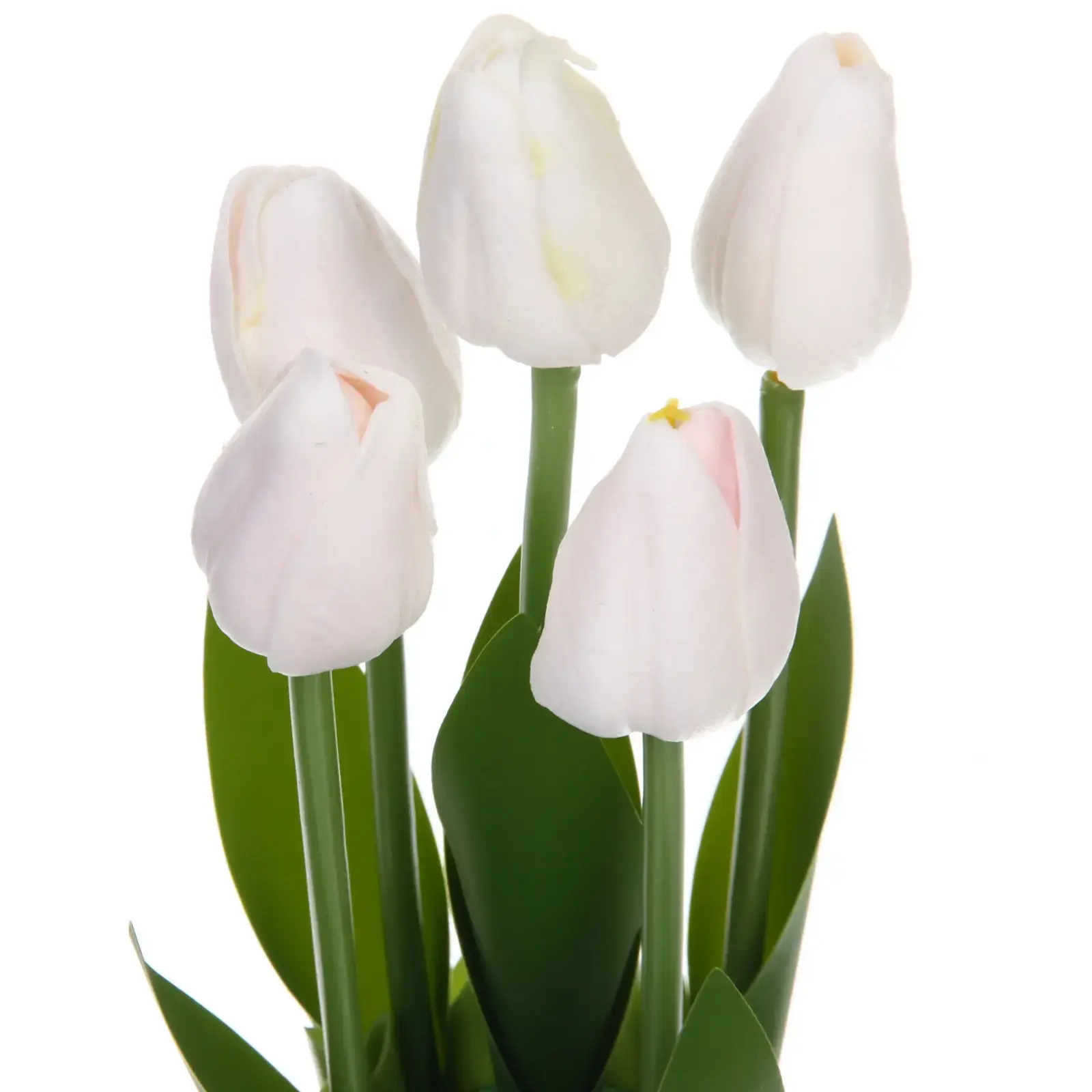 Почему стоит выбрать именно эту композицию? Во-первых, она выполнена из качественных материалов: ПВХ и пластика, что обеспечивает долговечность и устойчивость к внешним воздействиям. Во-вторых, белые тюльпаны с легким желтоватым оттенком на концах лепестков создают эффект свежести и натуральности. В-третьих, стильный дизайн и аккуратная упаковка с натуральной веревкой делают эту композицию не только красивой, но и практичной.