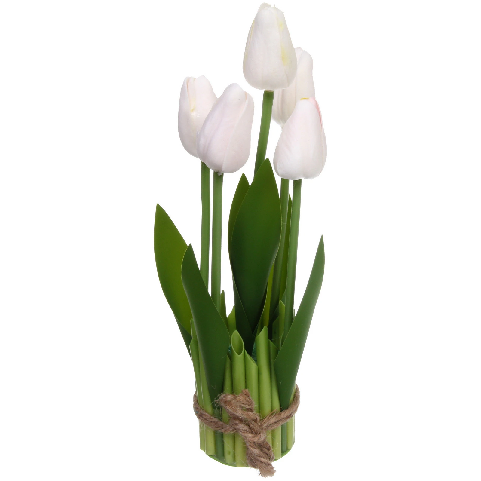 - Пять изящных бутонов тюльпанов белого цвета с едва заметными розоватыми и желтоватыми оттенками
