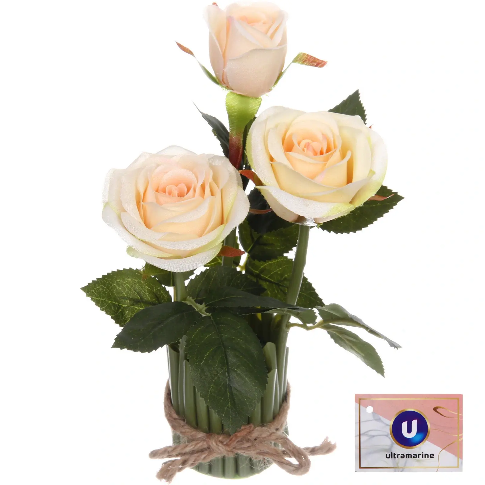 Композиция собрана в вазе, имитирующей стекло, и обвязывается бечевкой, что добавляет ей натуральности и стиля. Листья имеют текстуру, напоминающую настоящие, что делает композицию ещё более реалистичной. Размеры цветков варьируются от 5 до 7 см в диаметре, что делает их идеальными для создания гармоничного ансамбля.