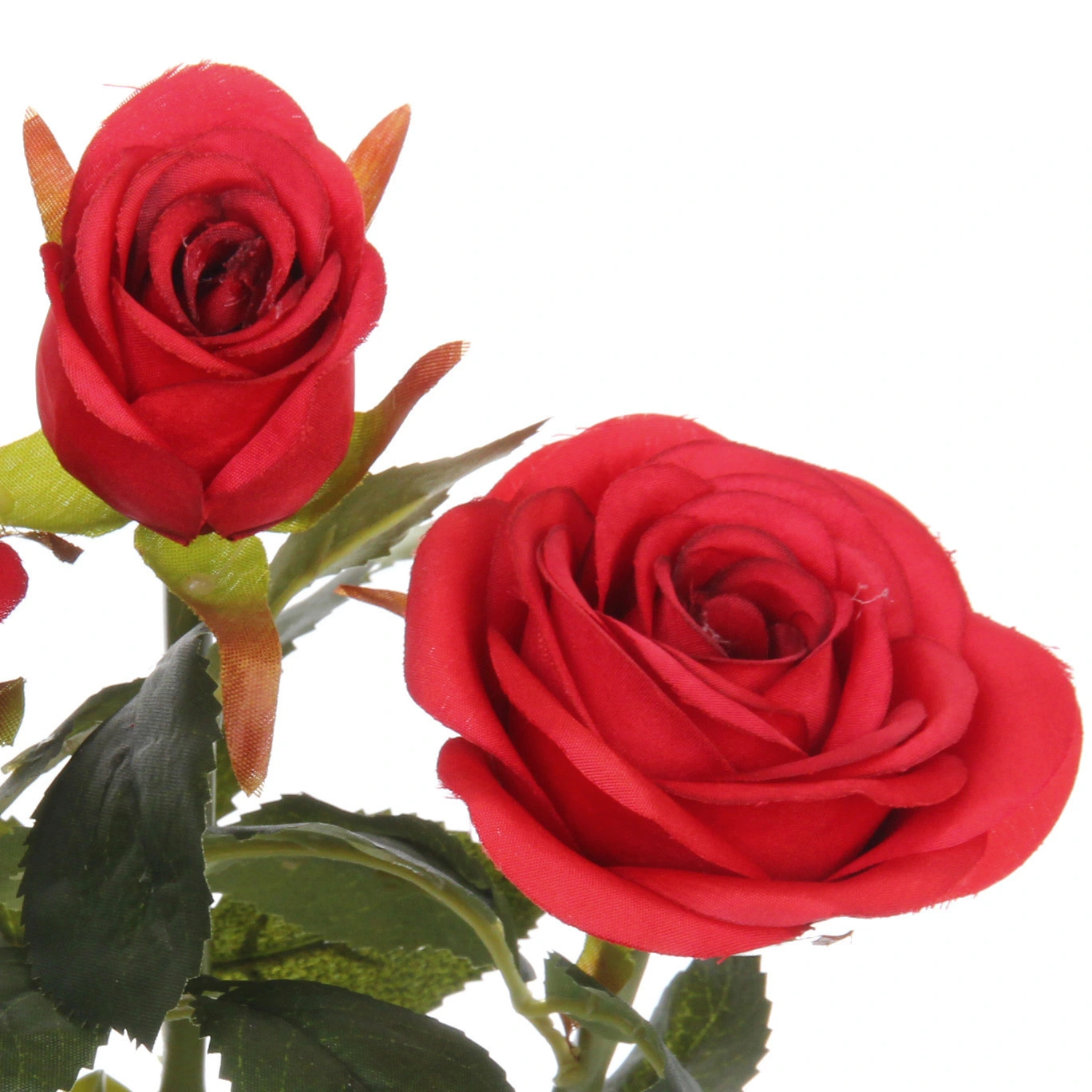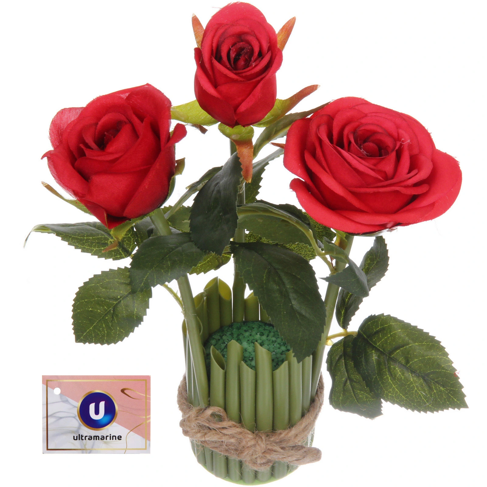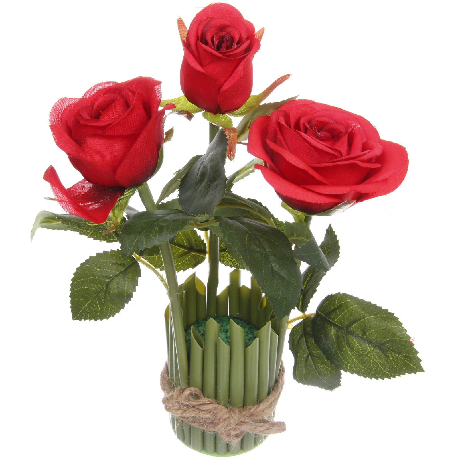 Композиция состоит из трех искусственных роз ярко-красного цвета в разной стадии цветения: два полностью распустившихся бутона и один полураспустившийся. Такое сочетание создает естественный, динамичный вид. Цветы установлены в декоративный держатель цилиндрической формы, выполненный из вертикальных зеленых элементов, имитирующих тонкие стебли. Внутри держателя находится пористый фиксирующий материал для надежного крепления стеблей. Основание украшено натуралистичной обмоткой из джутового шнура, завязанного декоративным узлом.