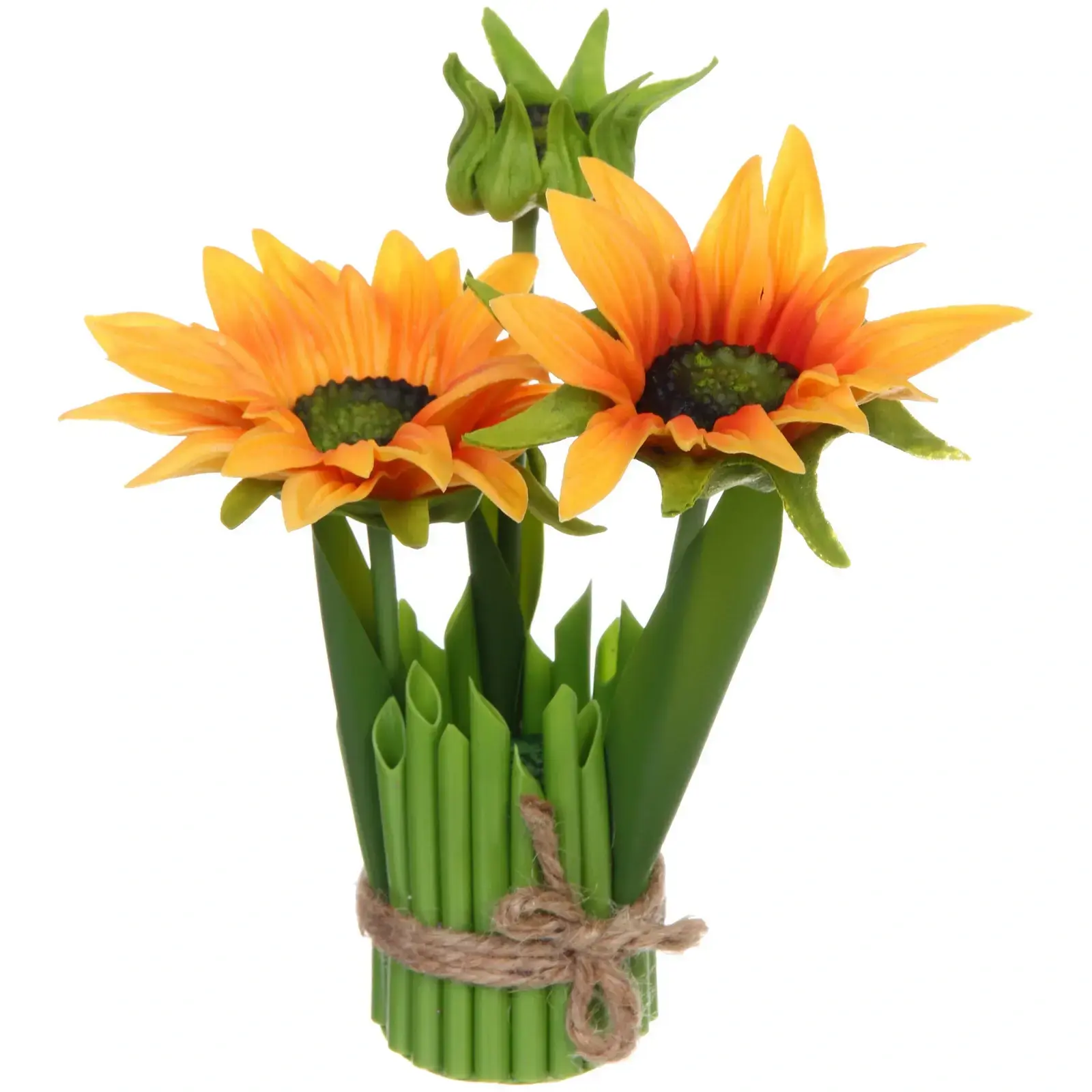 Размер композиции составляет 15х22 см, что делает её компактной и удобной для размещения на столах, полках или подоконниках. Материалы, из которых изготовлены цветы, включают пластик и полиэстер, что обеспечивает долговечность и устойчивость к внешним воздействиям. Оранжевые герберы с черными сердцевинами выглядят очень натурально и привлекательно.