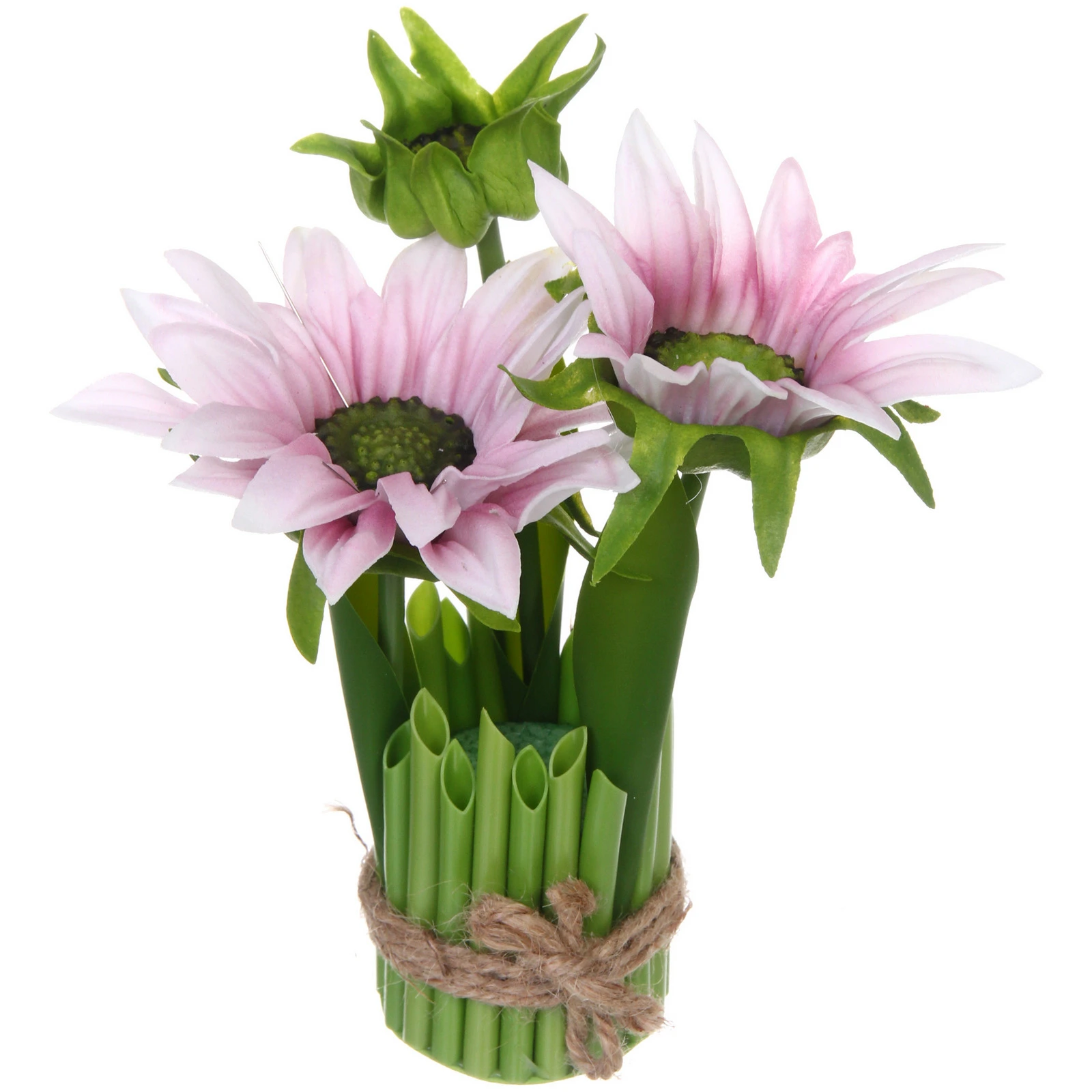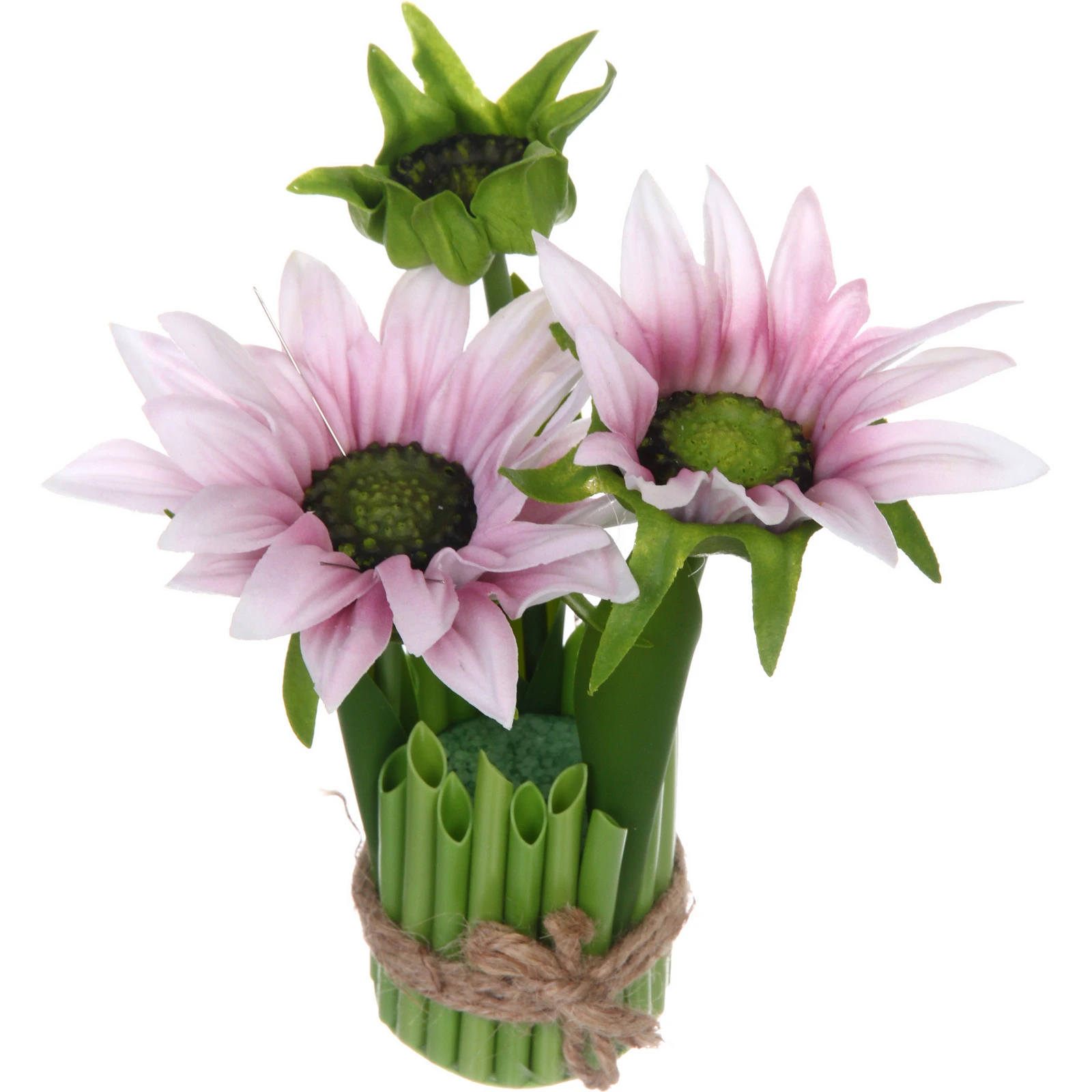 - Продуманная конструкция: Цветы закреплены в декоративном основании, стилизованном под пучок зелёных стеблей. Основание перехвачено натуральной коричневой бечёвкой, завязанной бантом, что добавляет композиции рукотворного шарма и завершённости.