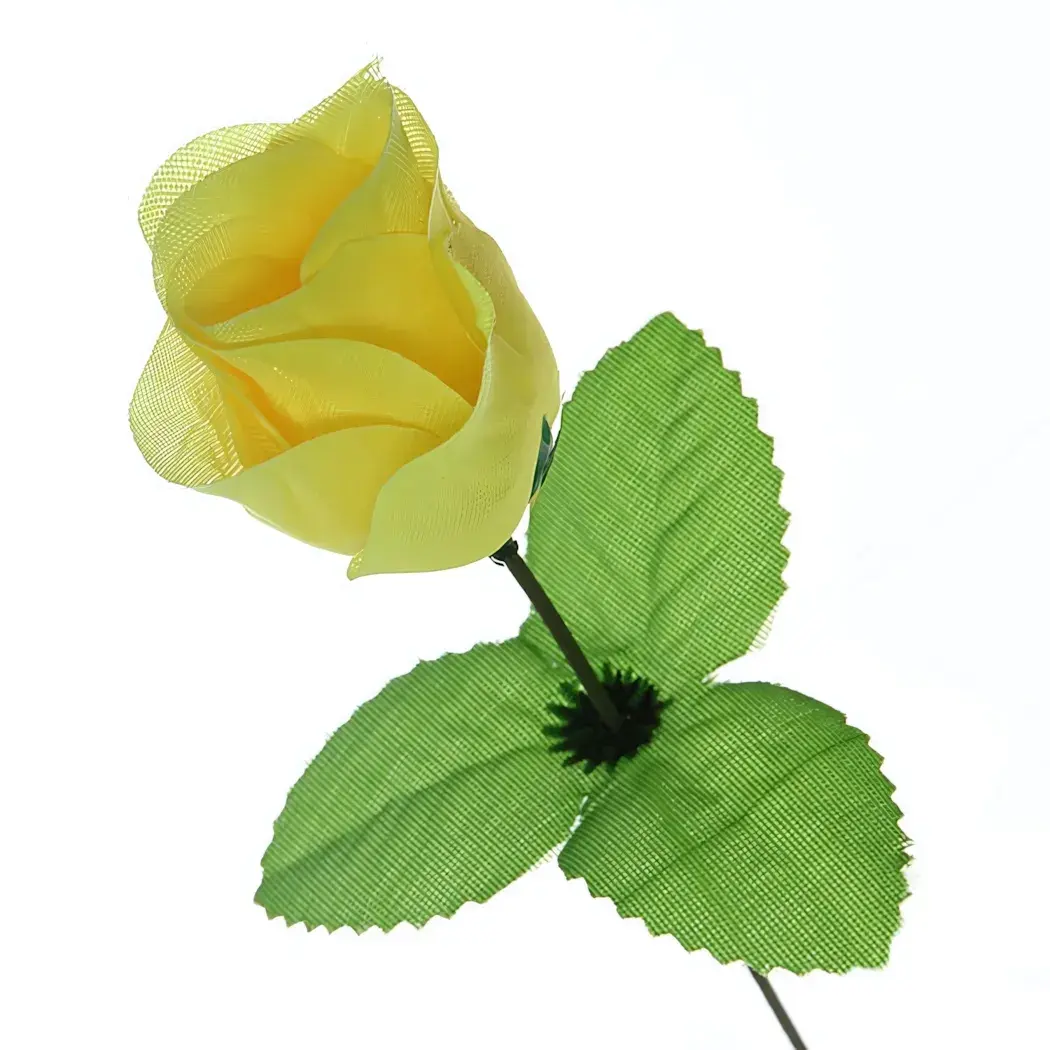 Роза выполнена из качественных материалов: пластика и полиэстера, что обеспечивает её долговечность и устойчивость к внешним воздействиям. Ярко-желтый цвет и текстурированные зеленые листья придают ей реалистичный вид. Размеры цветка – 32 см в высоту, что делает его универсальным для различных стилей оформления.