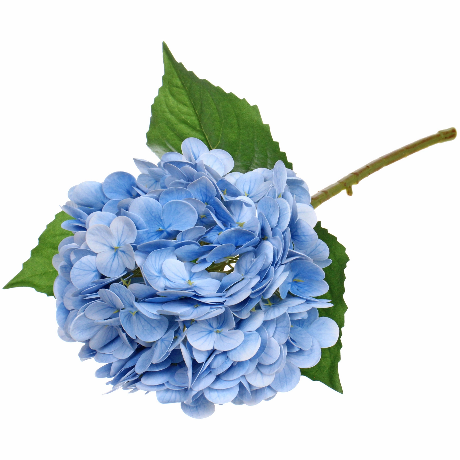 Соцветие состоит из множества мелких лепестков голубых оттенков, что создает эффект натуральной глубины цвета. Фактурные листья с выраженными прожилками и аккуратные переходы оттенков делают внешний вид максимально приближенным к живой гортензии. Материалы — пластик и силикон — обеспечивают аккуратную форму лепестков и долговечность без потери внешнего вида.