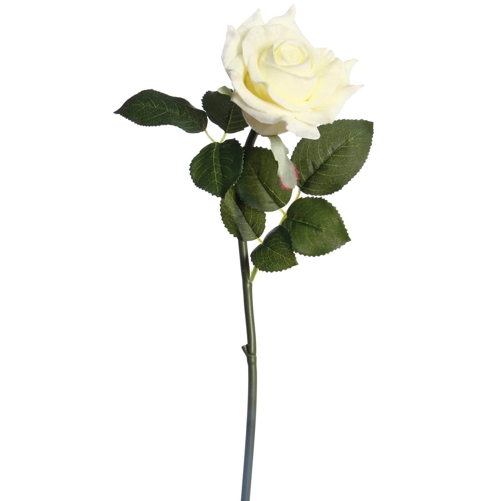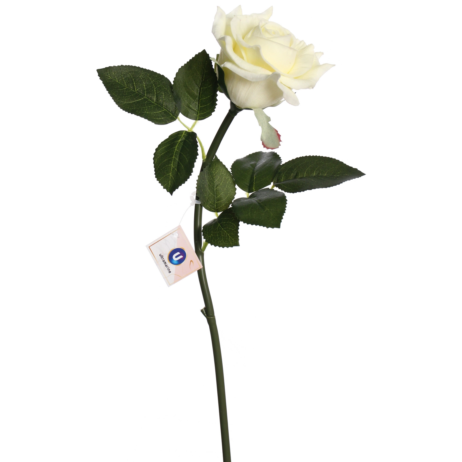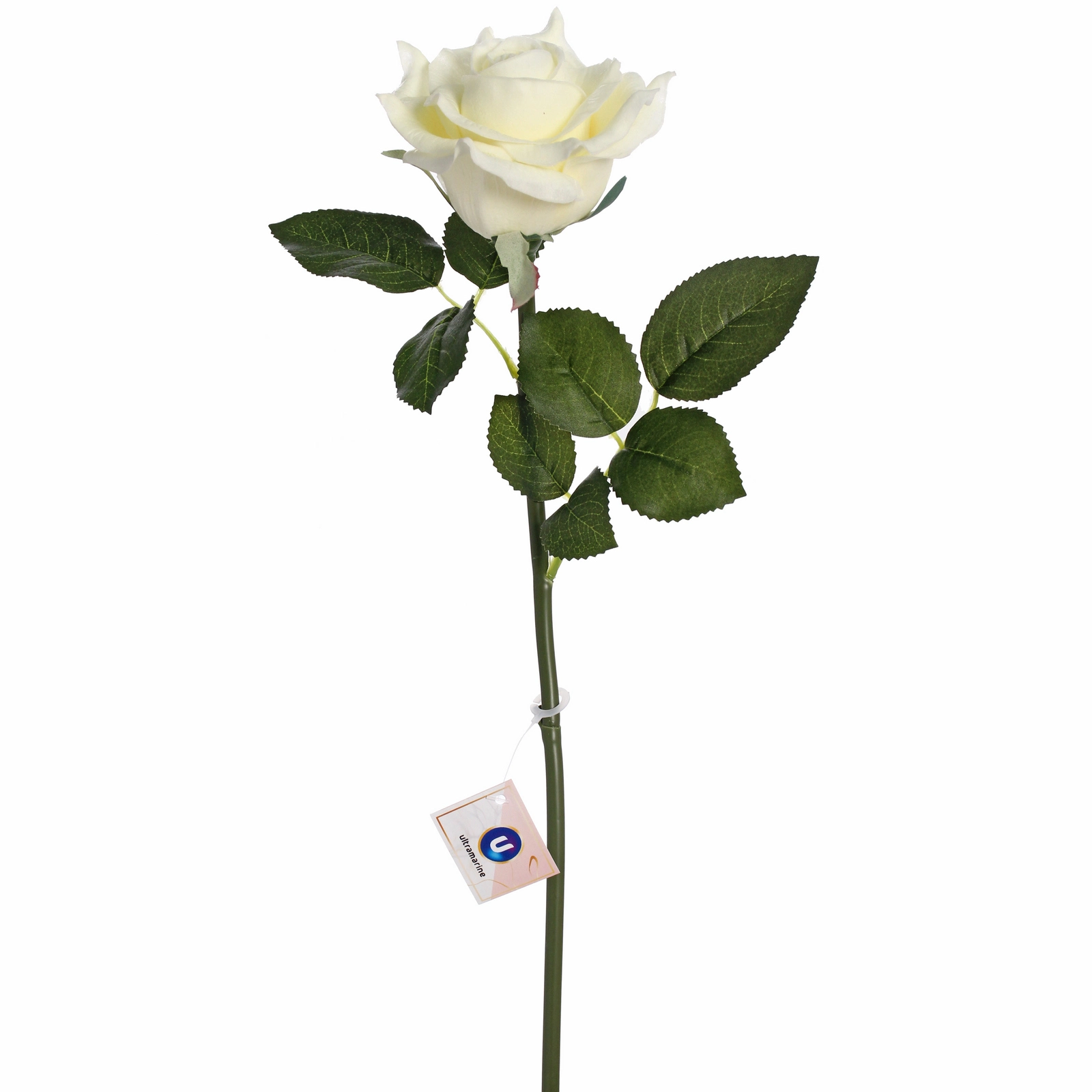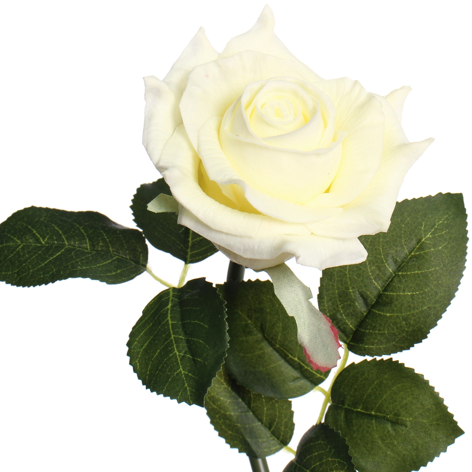 Роза имеет классическую форму с плотным бутоном. Стебель прямой, зелёный, с ответвлениями и листьями. Для поддержания безупречного вида достаточно occasionally удалять пыль с помощью мягкой кисти или фена на холодном режиме. Избегайте длительного воздействия прямых солнечных лучей и источников сильного тепла.