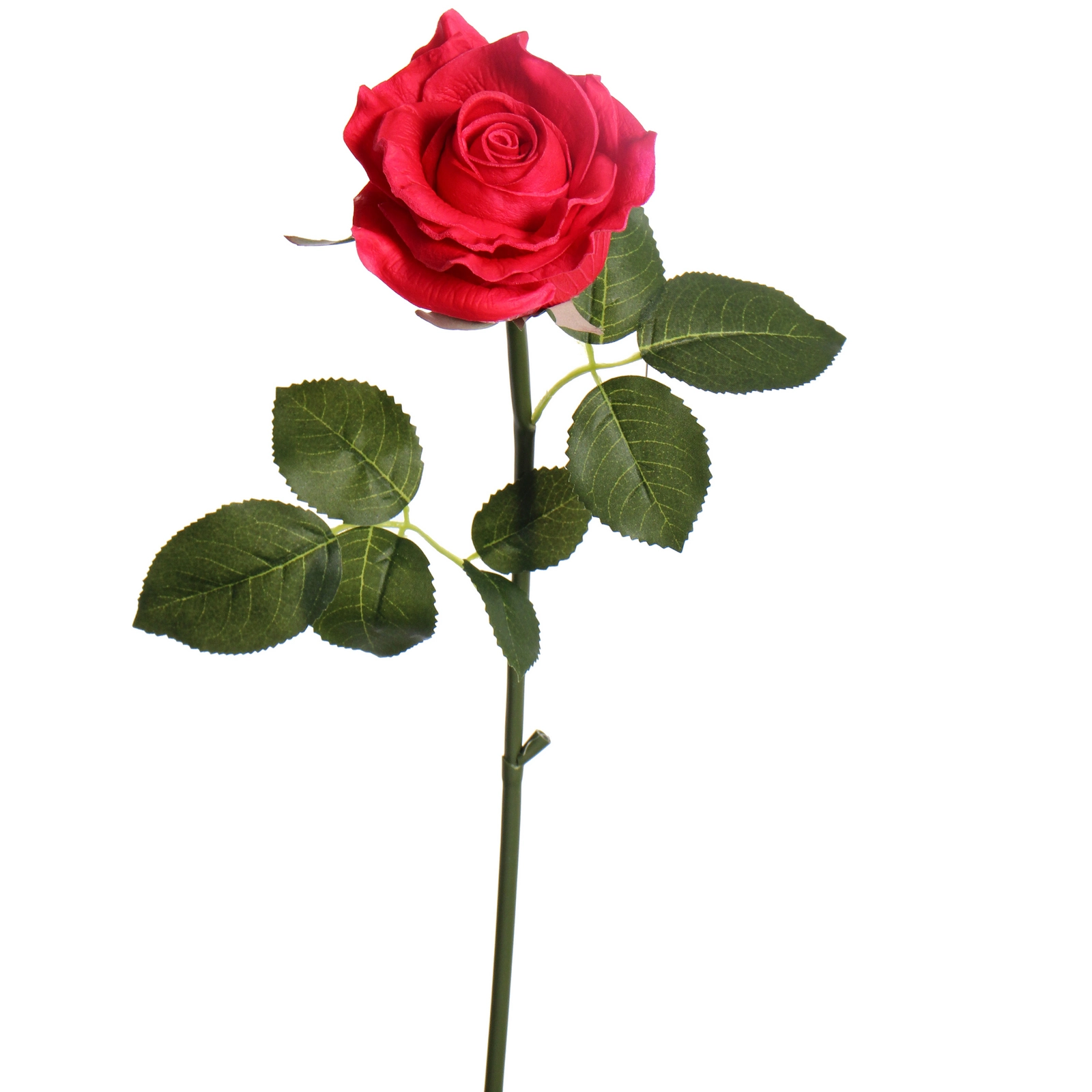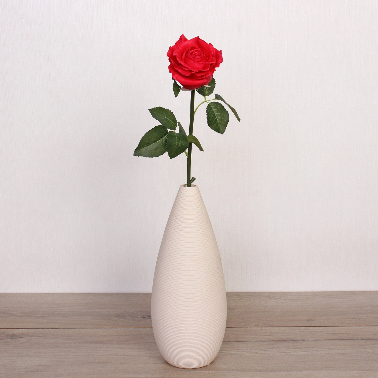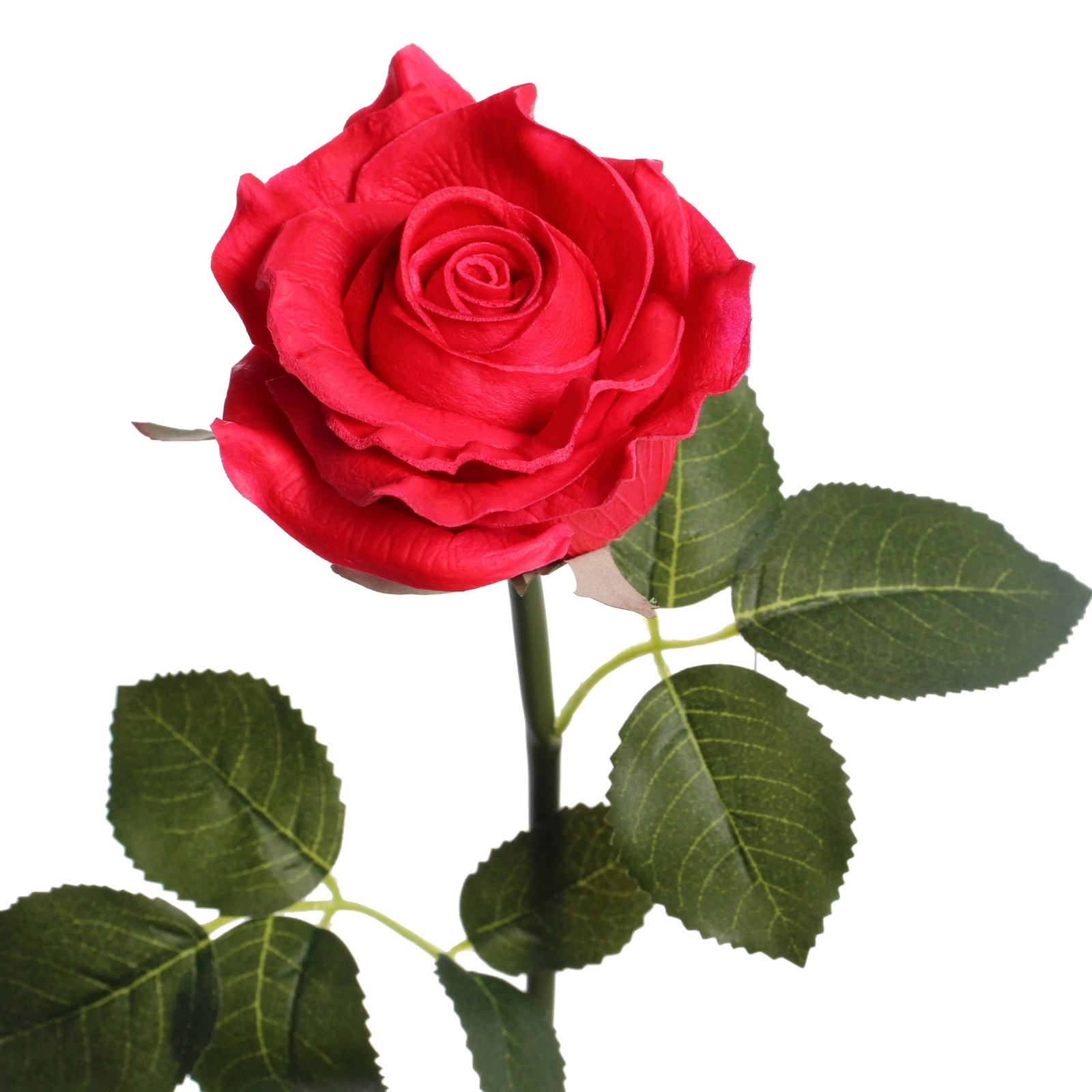 Искусственная роза «Natur» отличается высокой детализацией. Каждый лепесток, стебель и лист тщательно проработан, чтобы максимально точно имитировать живой цветок. Ярко-красный бутон с плотно расположенными лепестками и зелёные листья с прорисованными прожилками выглядят очень естественно.