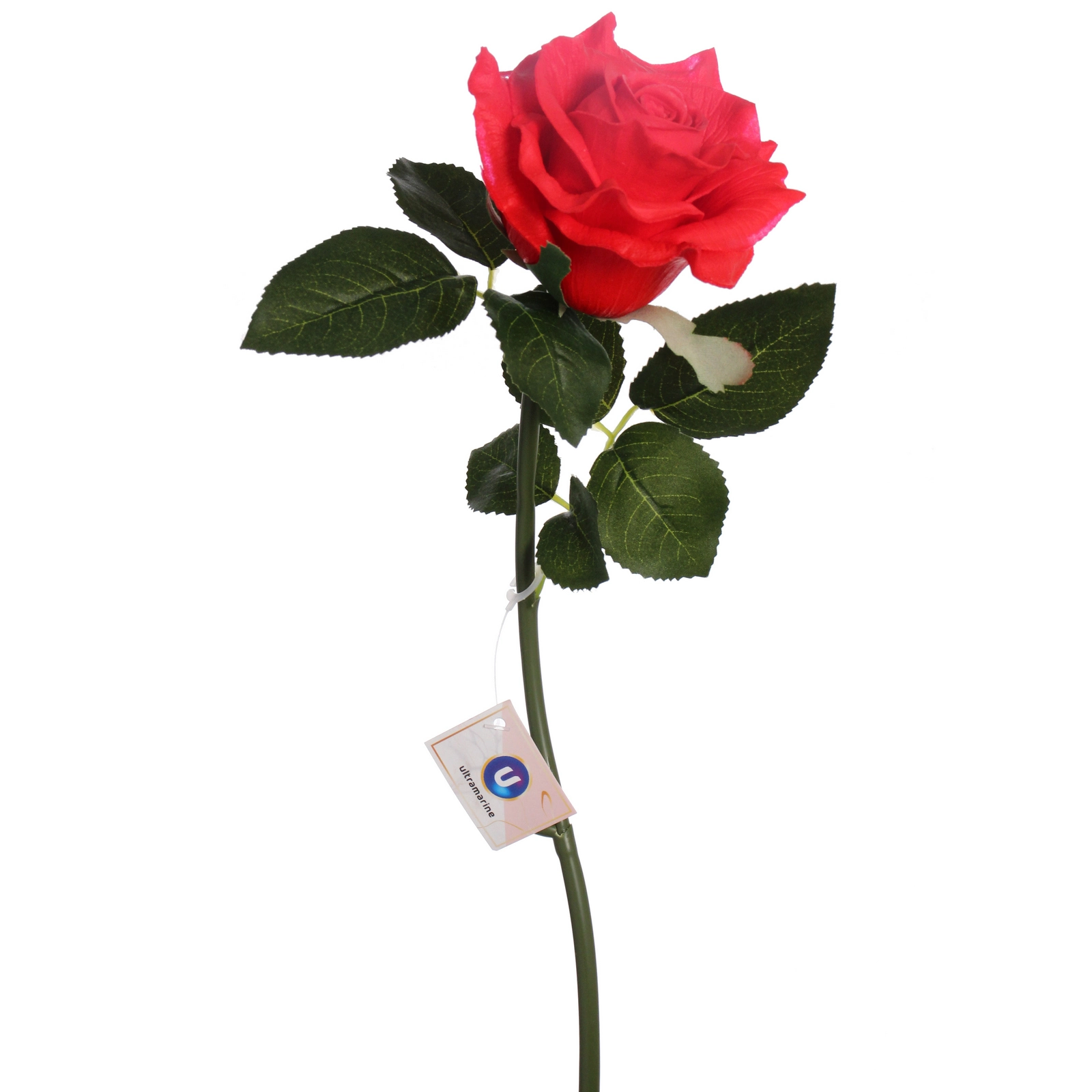 Роза имеет классический насыщенный красный цвет бутона. Стебель и листья — сочного зеленого оттенка. Листья овальной формы с заостренными кончиками и аккуратно проработанным зубчатым краем. Общая высота композиции составляет 50 см, что позволяет использовать стандартные вазы среднего размера. Цветок поставляется с фирменным ярлыком бренда.