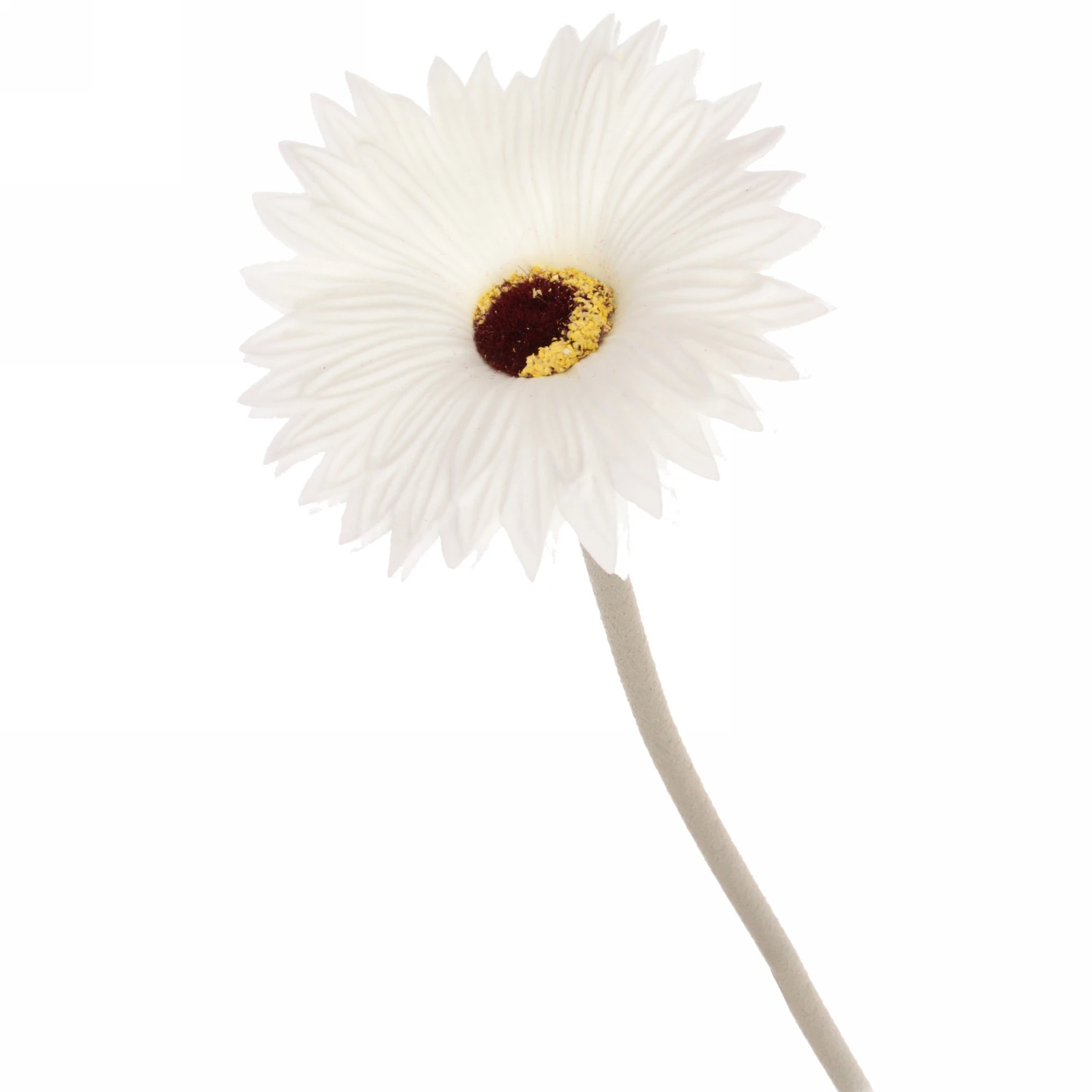 - Реалистичный внешний вид: Цветок искусно выполнен с детальной проработкой: белые лепестки с рельефной фактурой, тёмно-коричневая сердцевина и жёлтый ободок, имитирующий пыльцу. Визуально его сложно отличить от живого растения.
