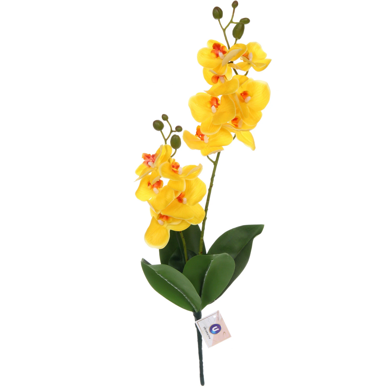 Ветка орхидеи имеет общую высоту около 55 см. Она состоит из гибкого зеленого стебля, от которого отходят ответвления с двумя крупными распустившимися цветками и несколькими закрытыми бутонами, что добавляет композиции естественности и динамики. Крупные зеленые листья у основания завершают образ. Изделие изготовлено из качественных материалов: пластика и полиэстера, которые обеспечивают прочность и реалистичную текстуру.