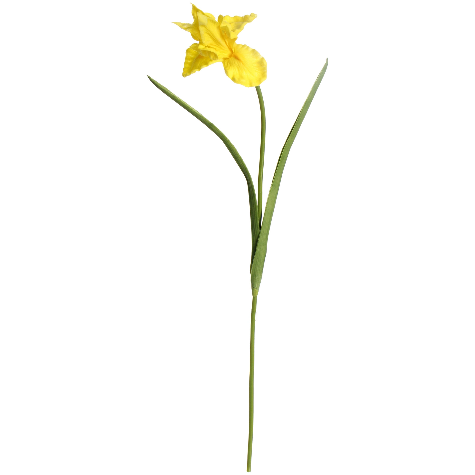 Цветок представляет собой длинный зеленый стебель с двумя узкими листьями и одним крупным бутоном насыщенного желтого цвета. Материалы (пластик и силикон) обеспечивают гибкость и прочность, позволяя при необходимости слегка корректировать форму листьев и стебля для достижения идеального вида в вазе. Яркий желтый цвет бутона добавляет в интерьер солнечных акцентов и позитивной энергии.
