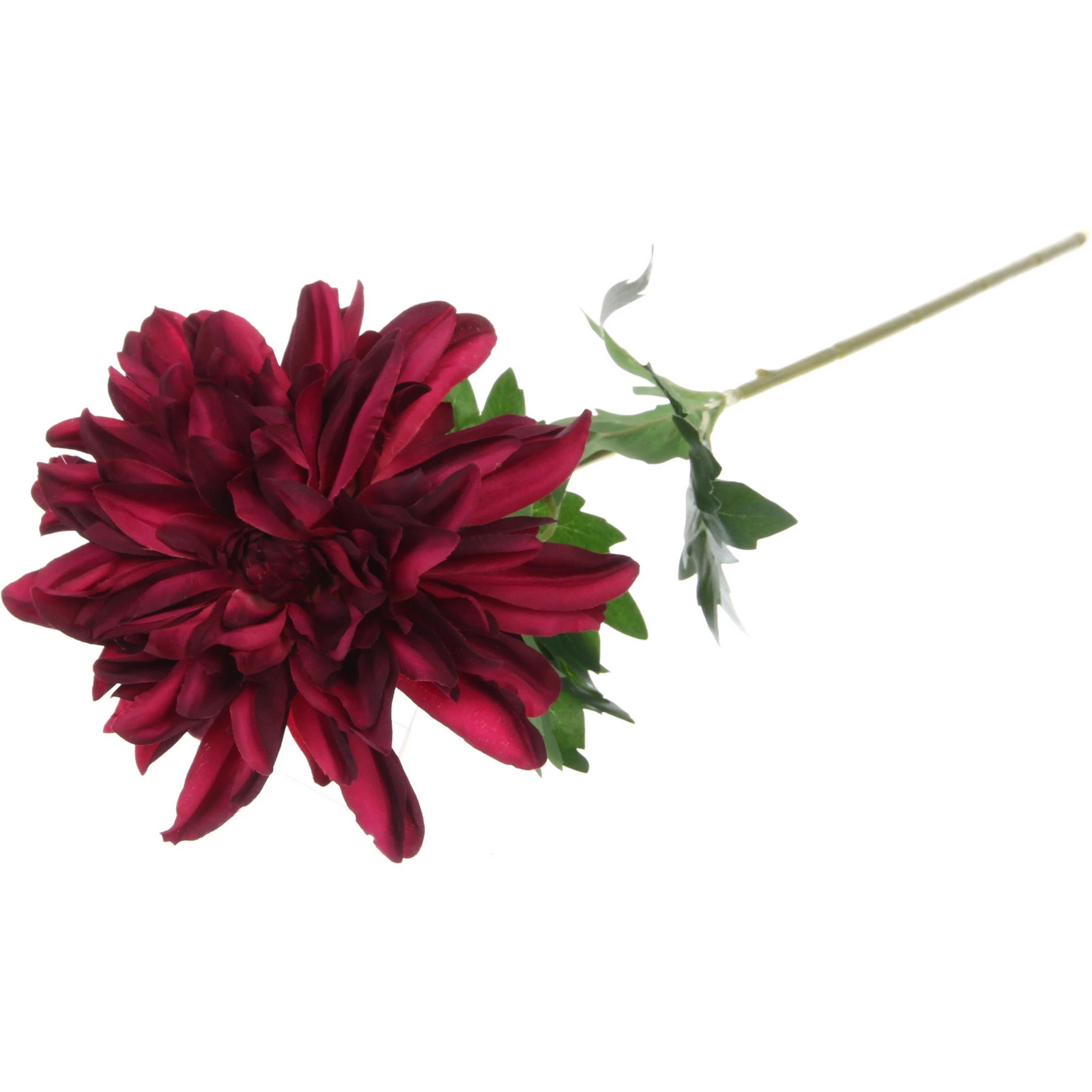 Искусственный цветок серии «Natur» представляет собой имитацию георгина. Общая высота композиции со стеблем составляет примерно 65 см. Бутон имеет объёмную, многослойную форму и выполнен в глубоком бордовом цвете. Стебель зелёного цвета дополнен реалистичными листьями. Материалы изготовления: пластик и полиэстер. Товар поставляется без вазы, как показано на дополнительных фото.