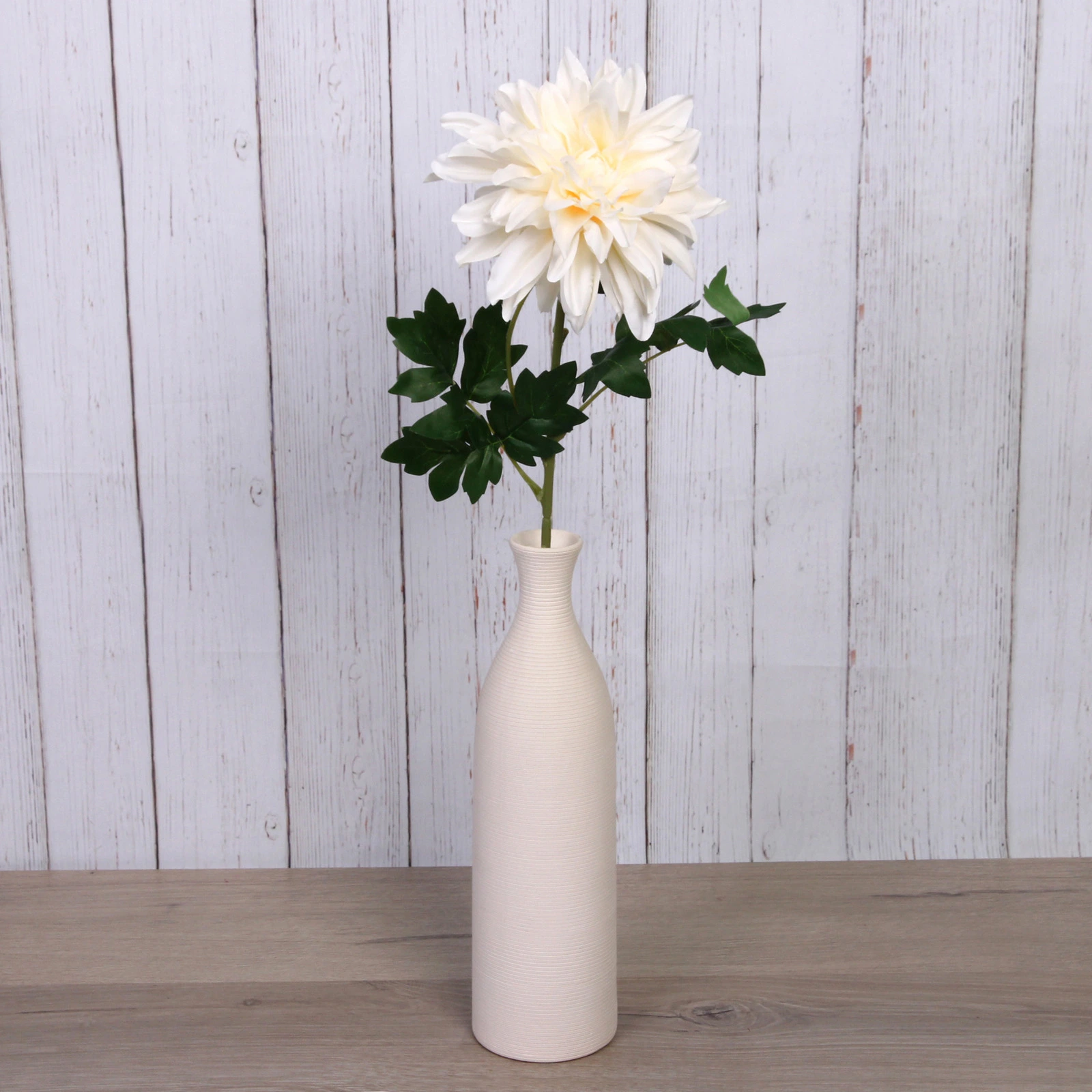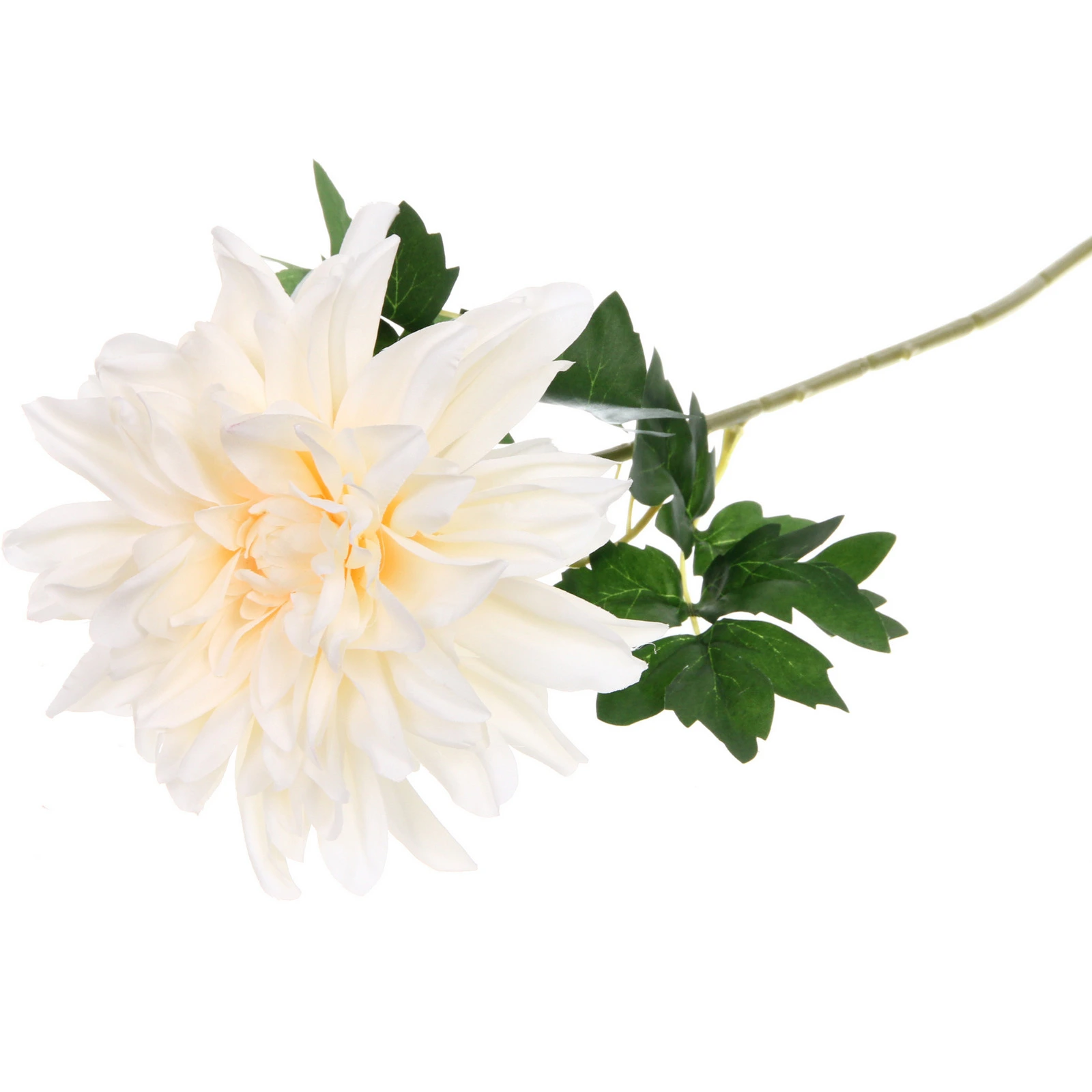 Цветок изготовлен из качественных материалов: лепестки – из мягкого полиэстера, стебель и листья – из пластика. Общая высота композиции составляет 65 см, что позволяет размещать его в напольных вазах, высоких кашпо или использовать в высоких букетах. Стебель прямой и достаточно прочный, чтобы удерживать пышный бутон. Листья тёмно-зелёного цвета с глянцевым блеском и чёткими прожилками добавляют композиции натуральности.