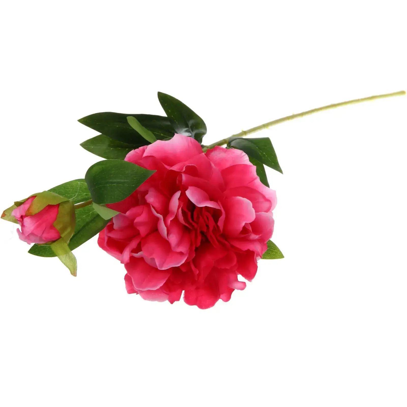 Цветок выполнен из высококачественного пластика и полиэстера, что обеспечивает его долговечность и устойчивость к внешним воздействиям. Ярко-розовые лепестки пиона имеют градиентный оттенок, что придаёт им реалистичность. Стебель цветка зелёного цвета, с несколькими зелеными листьями, добавляет естественности. Размеры цветка делают его заметным элементом декора, который не останется незамеченным.