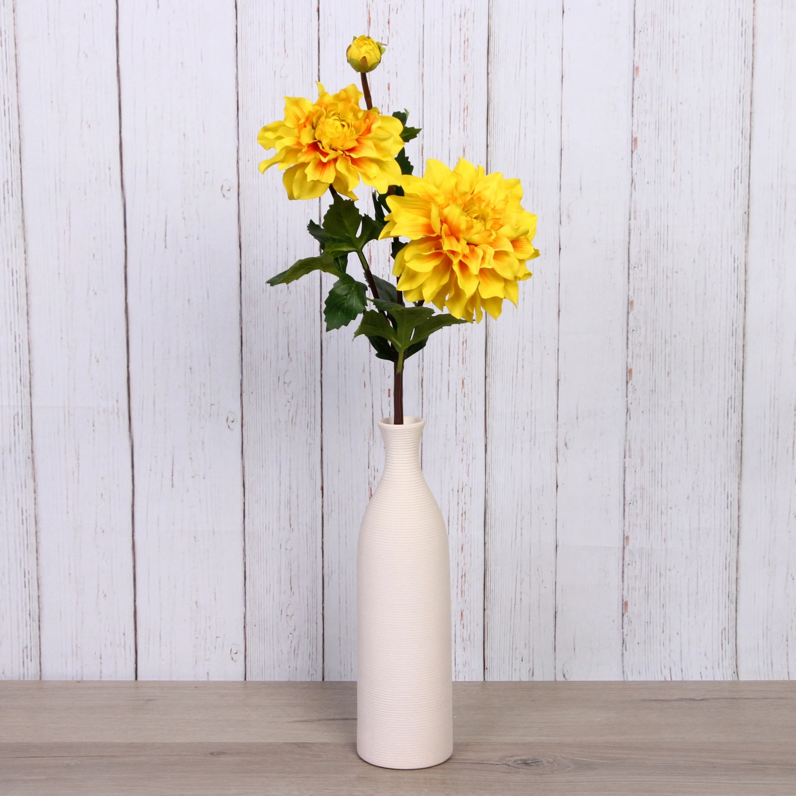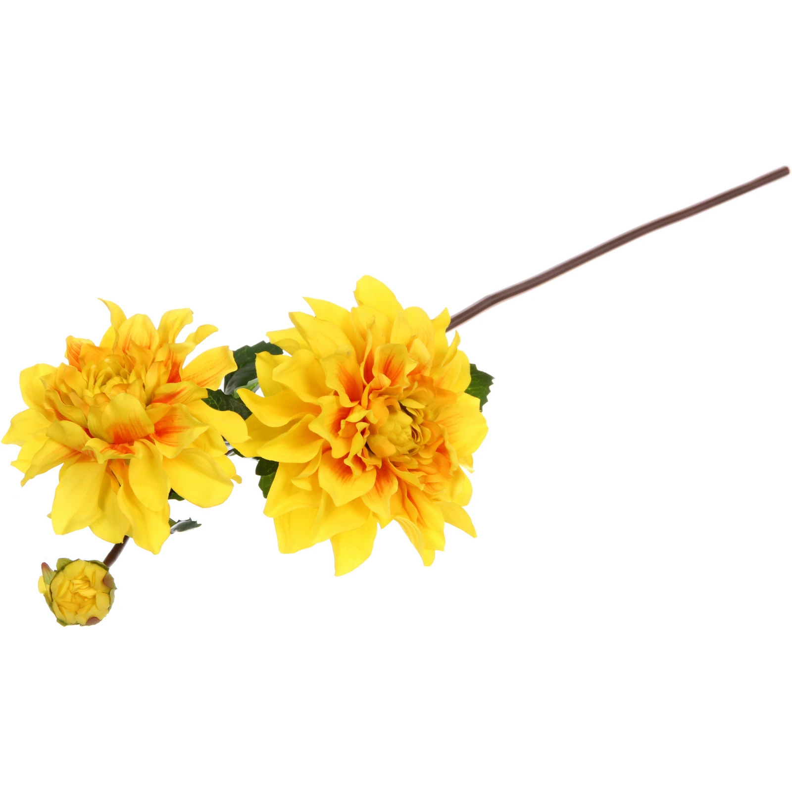 Композиция искусно повторяет природный оригинал: два крупных многолепестковых соцветия с плавным переходом от ярко-жёлтого к лёгкому оранжевому в сердцевине, один закрытый бутон на отдельной веточке и тёмно-коричневый прямой стебель с зелёными зубчатыми листьями. Такая детализация создаёт полную иллюзию живого растения.