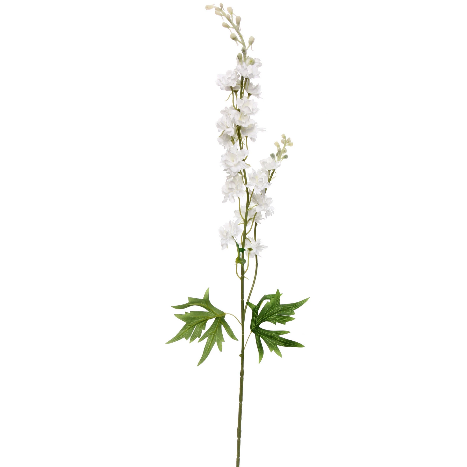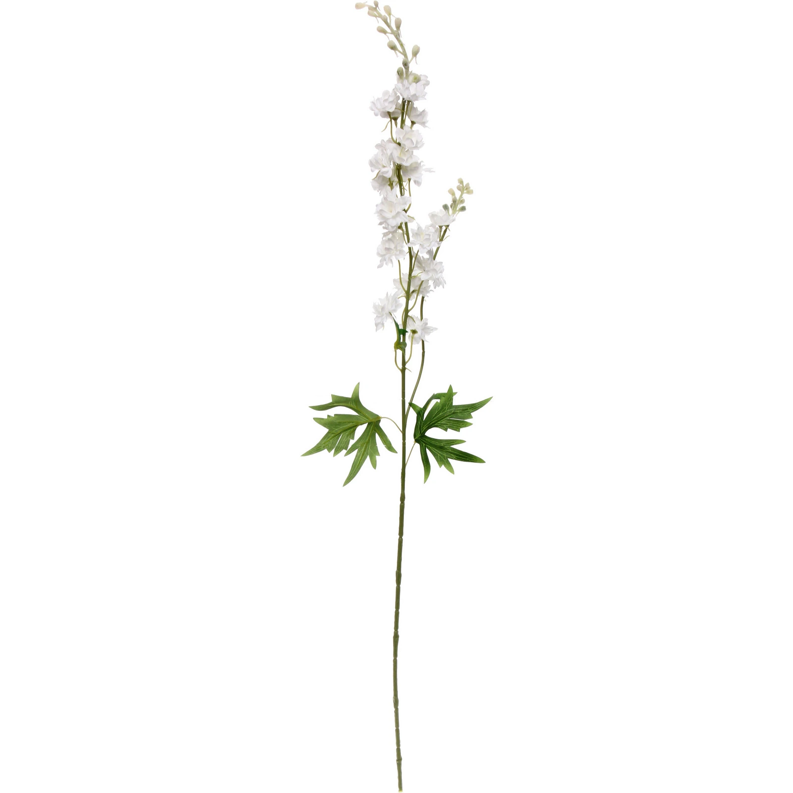 Изделие изготовлено из прочного пластика и качественного полиэстера. Общая высота составляет 84 см. В верхней части стебля расположено пышное вертикальное соцветие из множества белых раскрывшихся цветков и аккуратных светло-зеленых бутонов. Стебель дополнен фактурными резными листьями пальчато-раздельной формы, что придает растению естественный и завершенный вид.