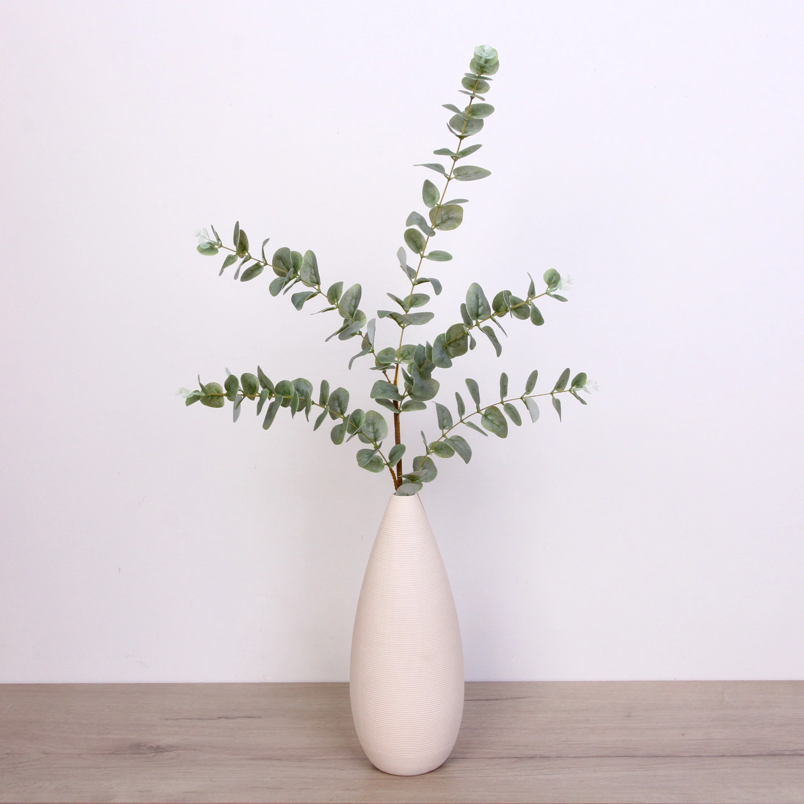 Ветка изготовлена из качественного пластика, который обеспечивает прочность и сохраняет форму. Общая высота композиции составляет 95 см, что позволяет ей быть заметным, но не громоздким элементом декора. Зелёный цвет листьев с лёгкими светлыми прожилками добавляет натуралистичности. Благодаря нейтральной цветовой гамме, ветка эвкалипта легко впишется в любой стиль интерьера — от скандинавского минимализма до классики или лофта.