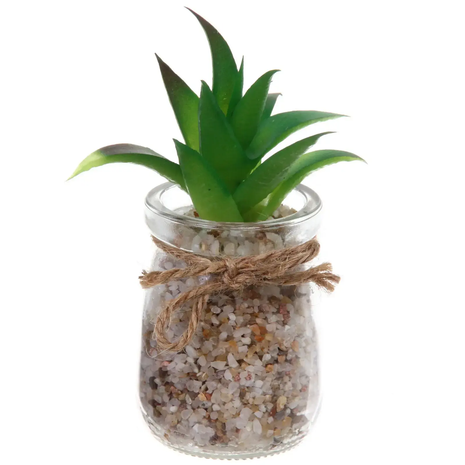 Этот суккулент выполнен из качественного пластика и помещен в стеклянный горшок, что обеспечивает долговечность и устойчивость к внешним воздействиям. Прозрачная банка с декоративным камнем внутри создает эффект натуральности, а обмотка горлышка джутовой нитью добавляет изюминку. Вы можете быть уверены, что этот элемент декора прослужит вам долго, не теряя своего привлекательного вида.