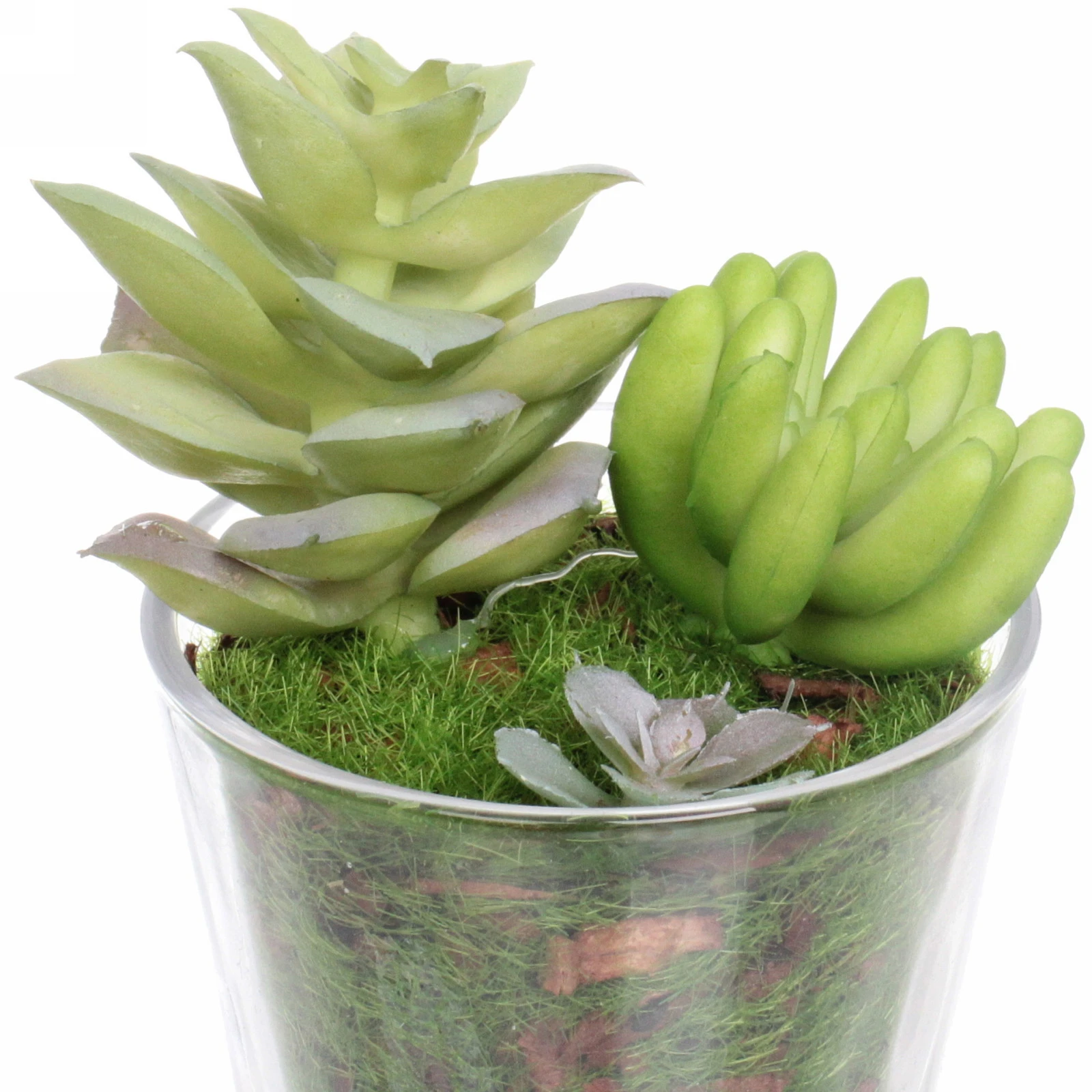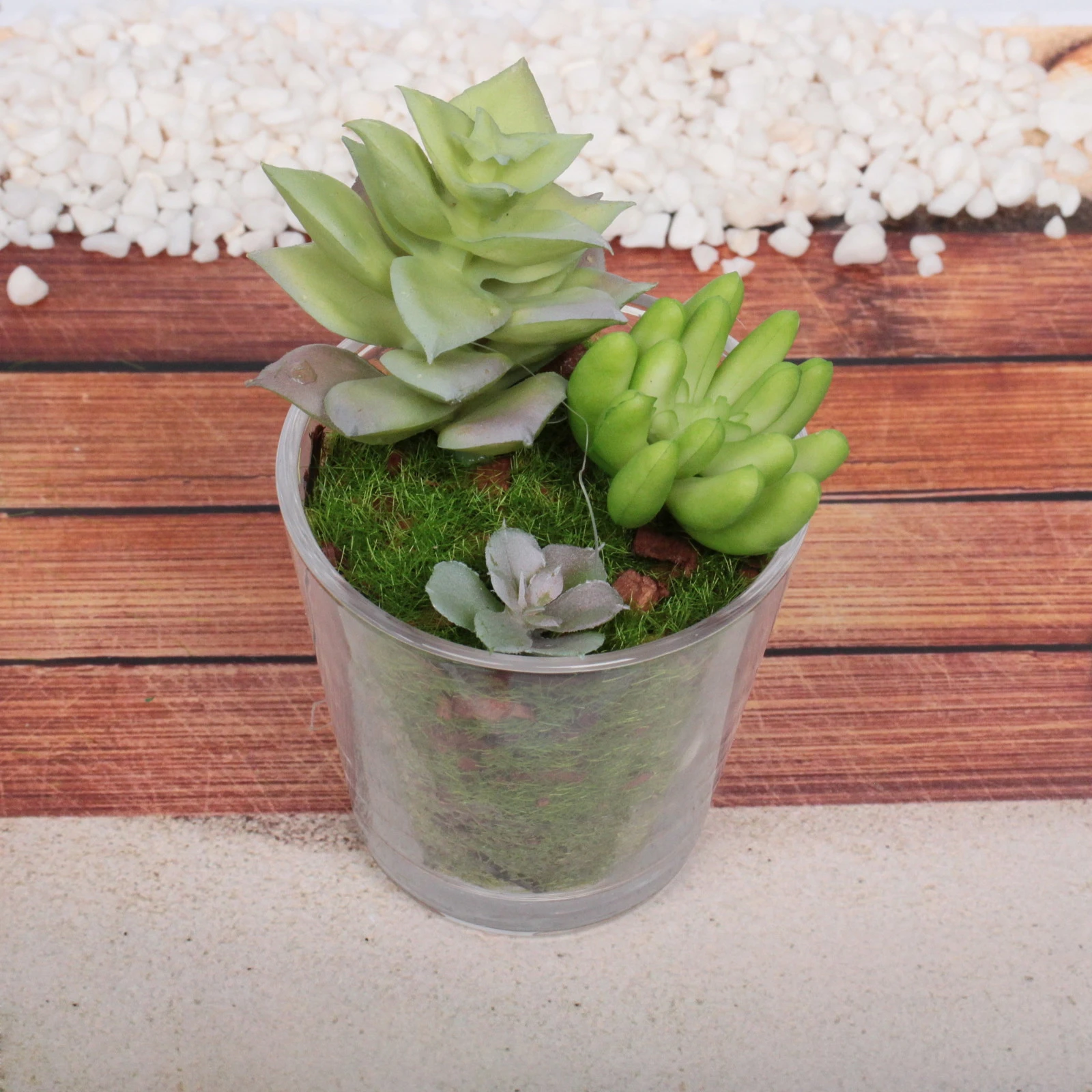 Композиция включает три искусственных суккулента разных форм и оттенков зелёного цвета, что создаёт естественный и гармоничный вид. Растения закреплены в прозрачном стеклянном горшке цилиндрической формы, который подчёркивает красоту композиции и позволяет видеть декоративные слои внутри. Основание оформлено зелёным искусственным мхом и элементами, имитирующими кору, для завершённого натуралистичного образа.